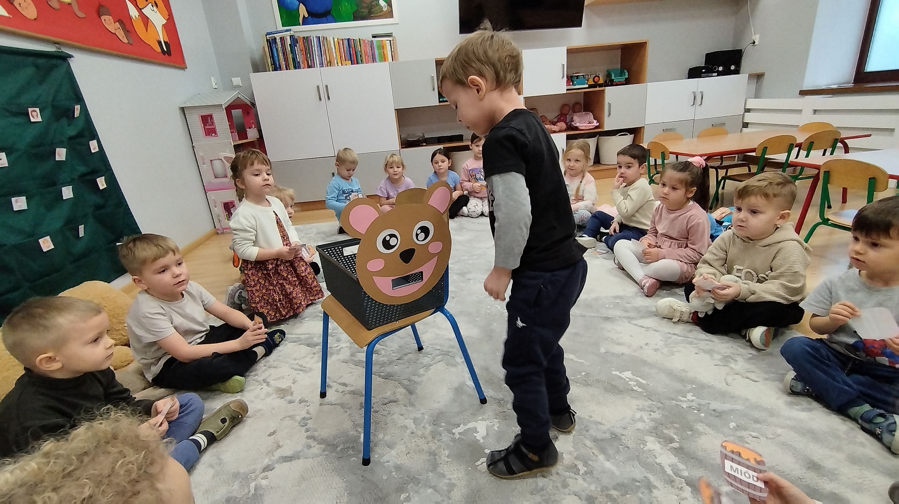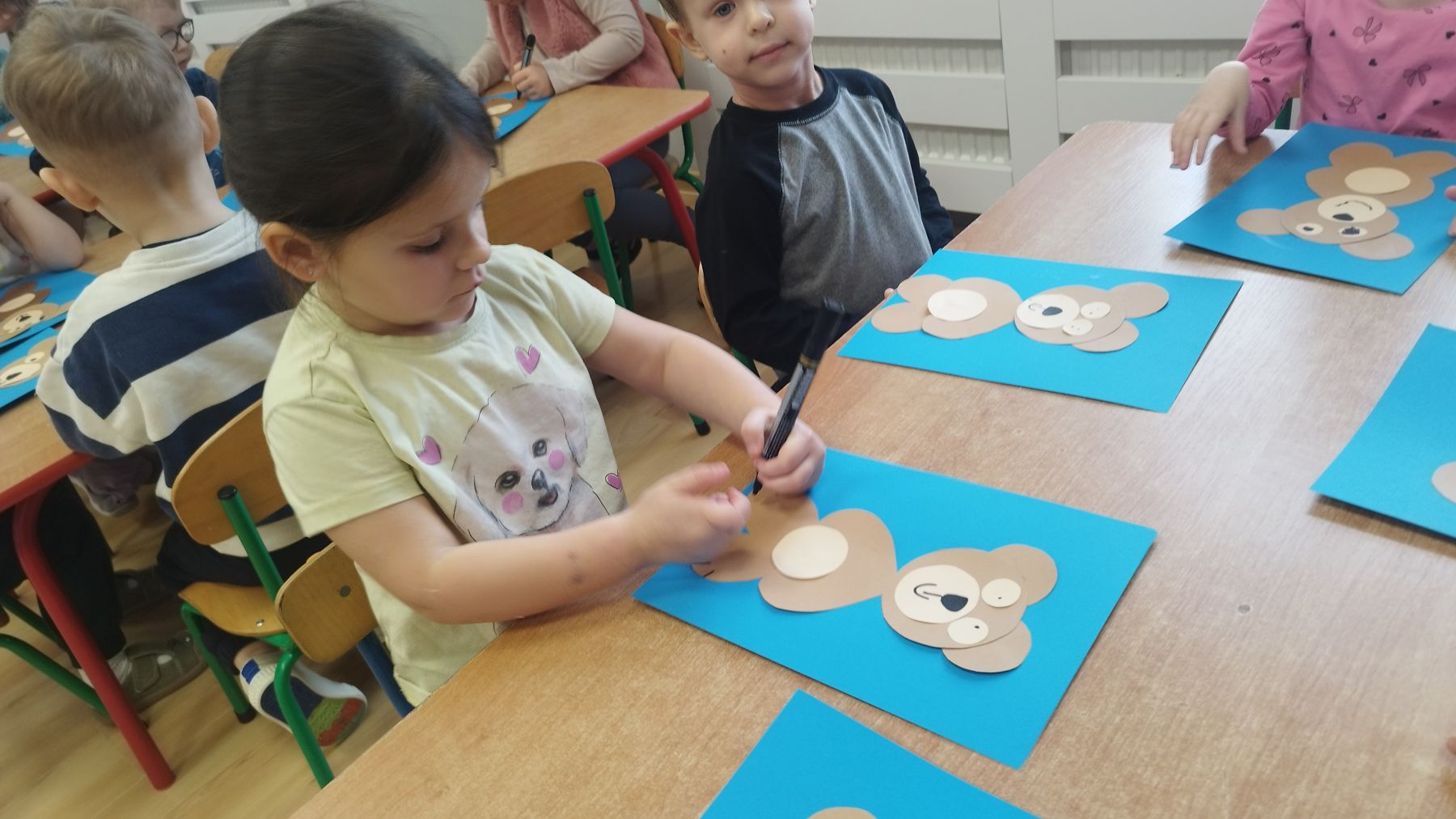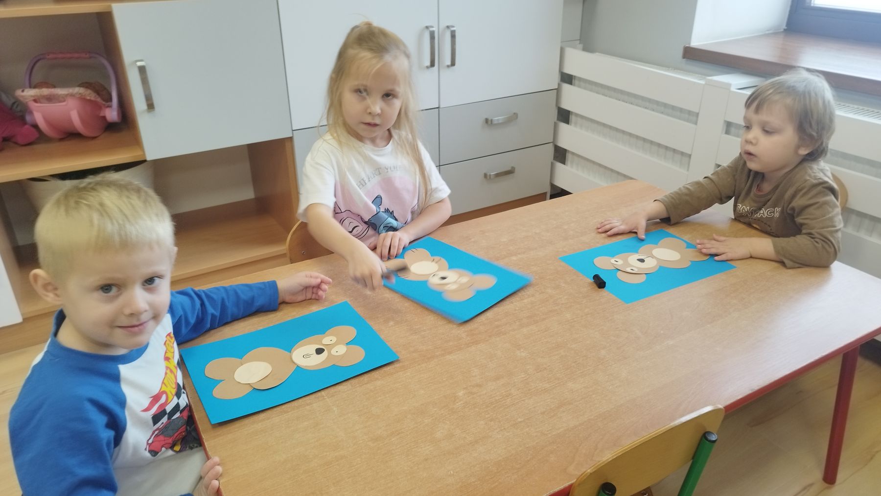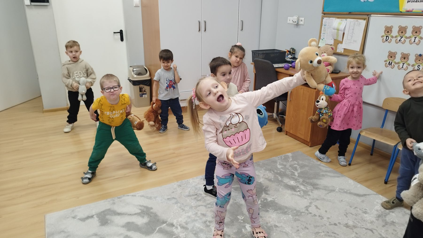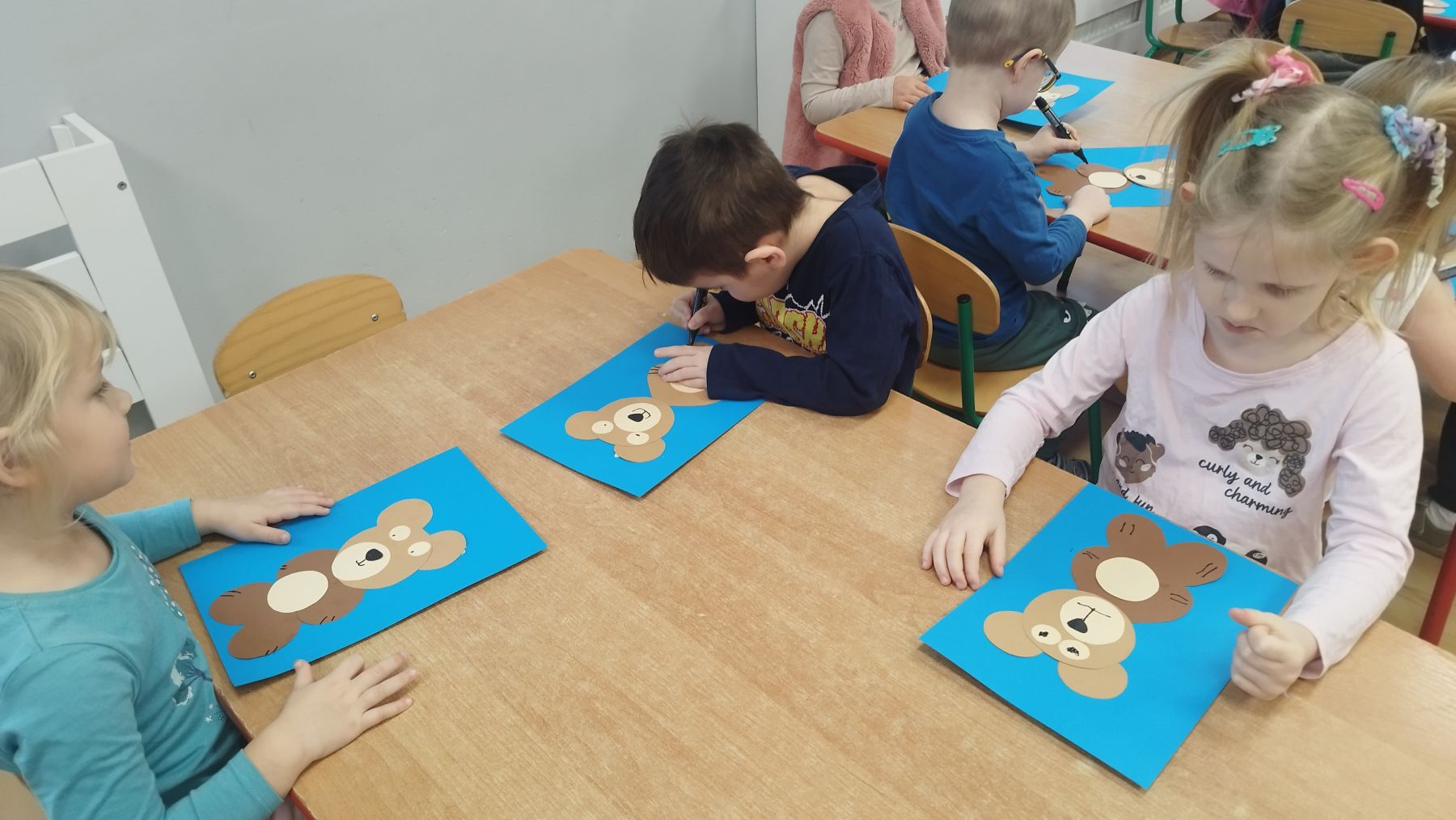 Przedszkolaki uczestniczyły w różnorodnych zajęciach plastycznych – malowały, wyklejały i tworzyły własne portrety misiów. Kolorowe prace ozdobiły przedszkolne korytarze, wprowadzając jeszcze więcej ciepła i uśmiechu. Nie zabrakło też wspólnych tańców, piosenek i zagadek o misiach.