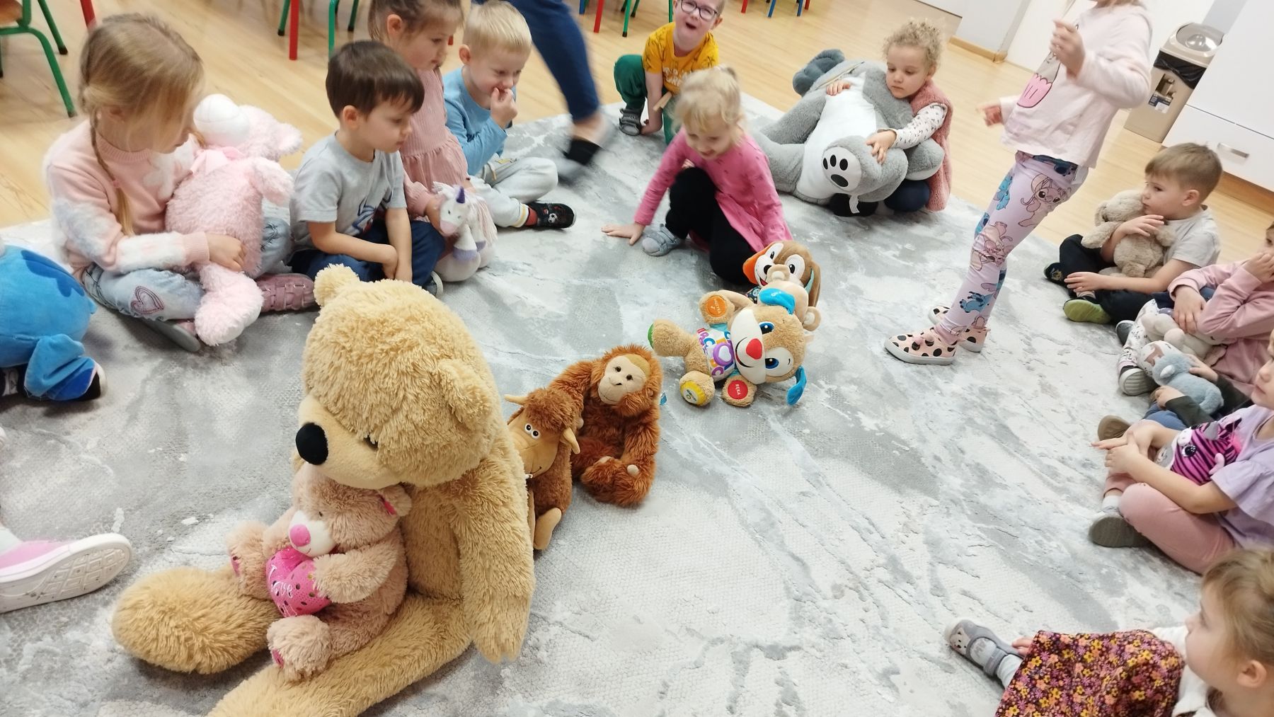 Dzień Pluszowego Misia, to jedno z najbardziej radosnych i wyczekiwanych wydarzeń w przedszkolu. Już od rana w salach panowała wyjątkowa atmosfera – dzieci przyniosły swoje ukochane pluszaki, które dumnie zajęły miejsca obok nich podczas zajęć, zabaw. Wszędzie słychać było śmiech, rozmowy o misiach i wspólne zabawy.