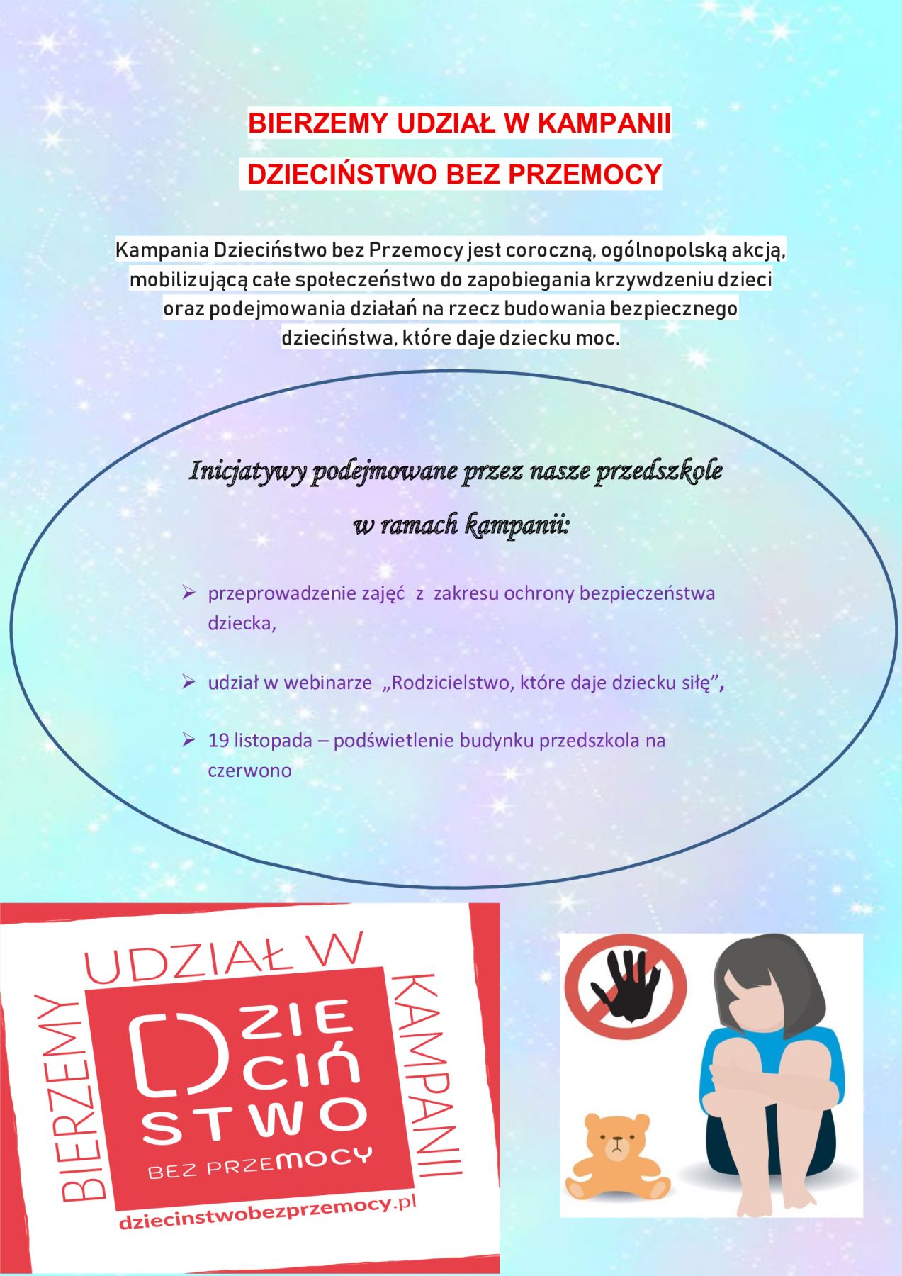 Dzieciństwo bez Przemocy, to coroczna ogólnopolska kampania, która mobilizuje społeczeństwo do ochrony dzieci przed przemocą i budowania bezpiecznego, wspierającego dzieciństwa.