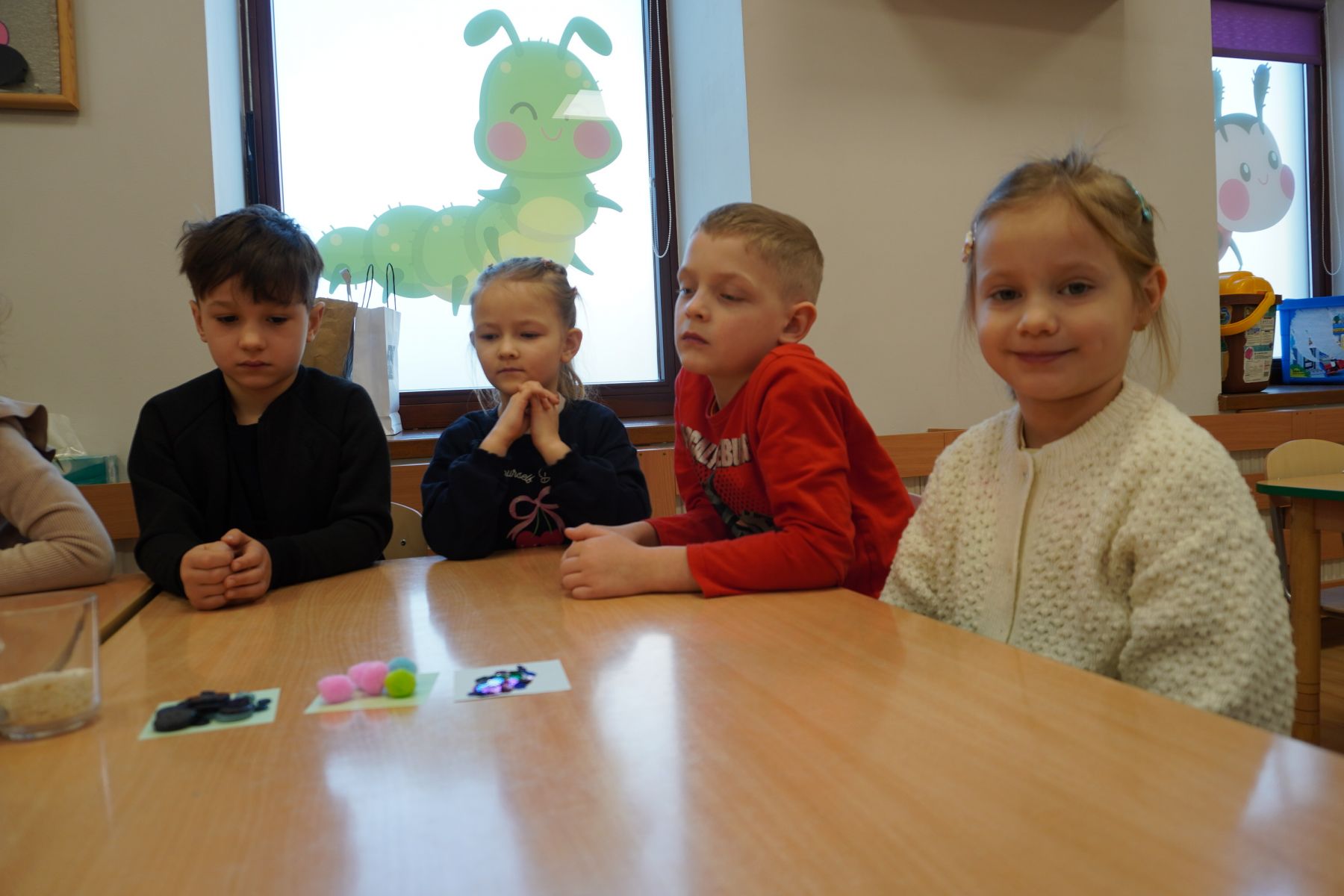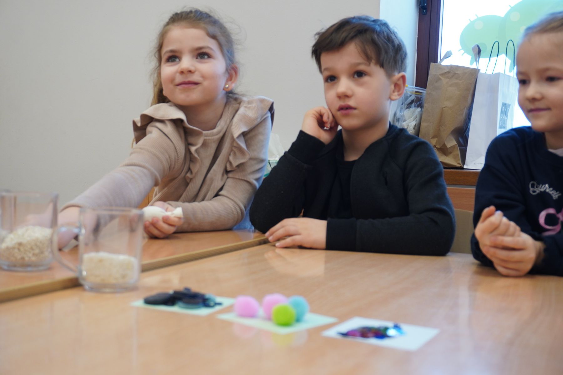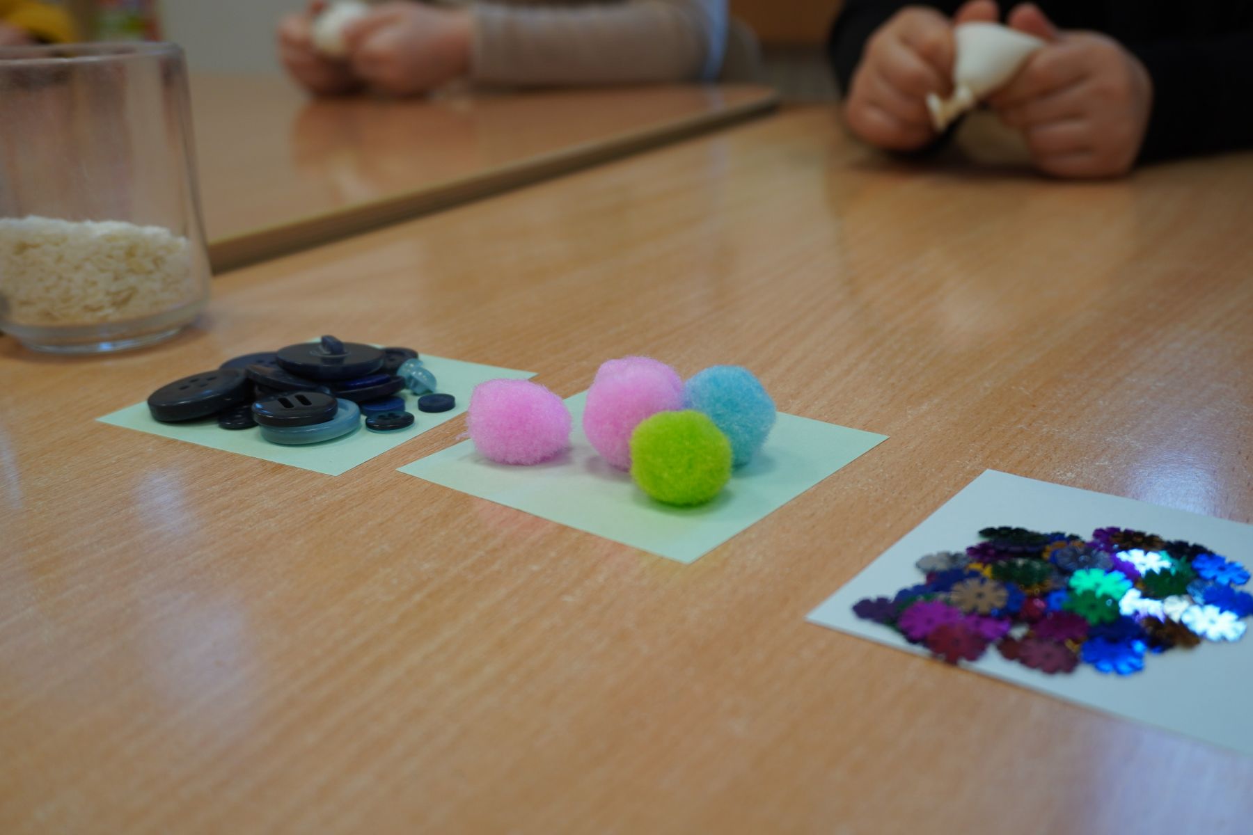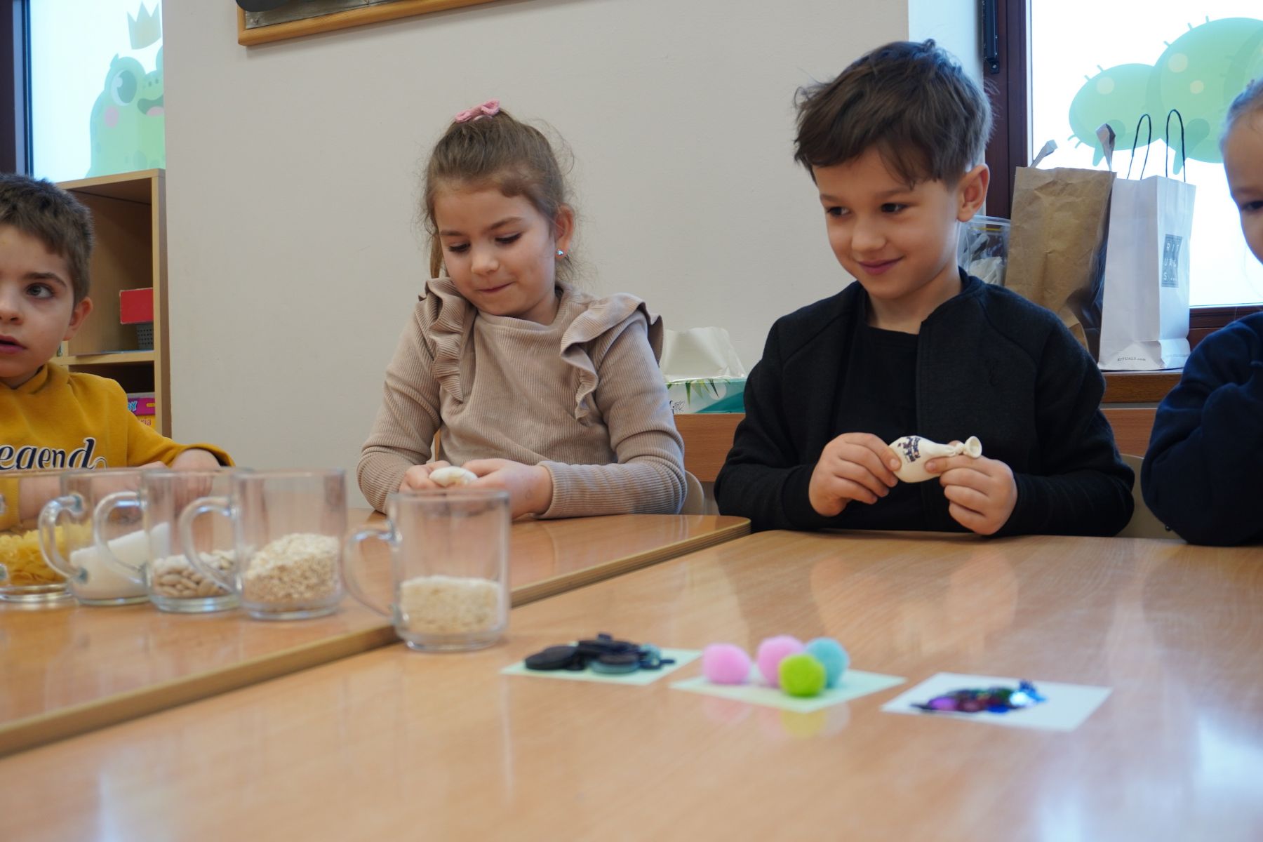 Zadaniem dzieci było za pomocą dotyku odgadnięcie, który produkt z przedstawionych na kartoniku ukrył się w balonie.
