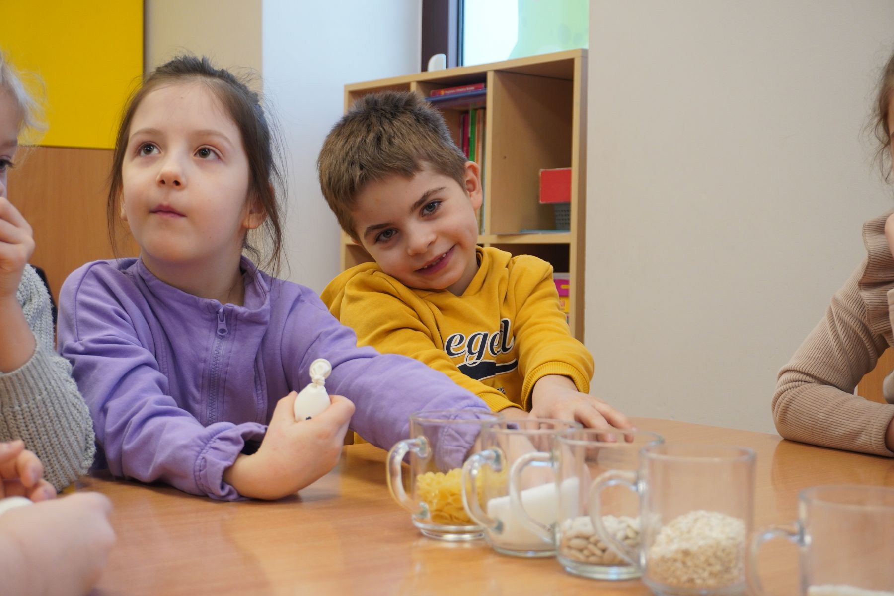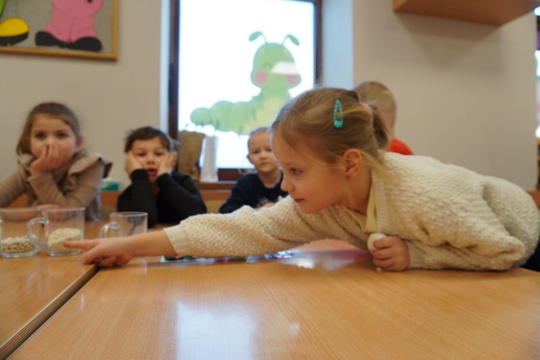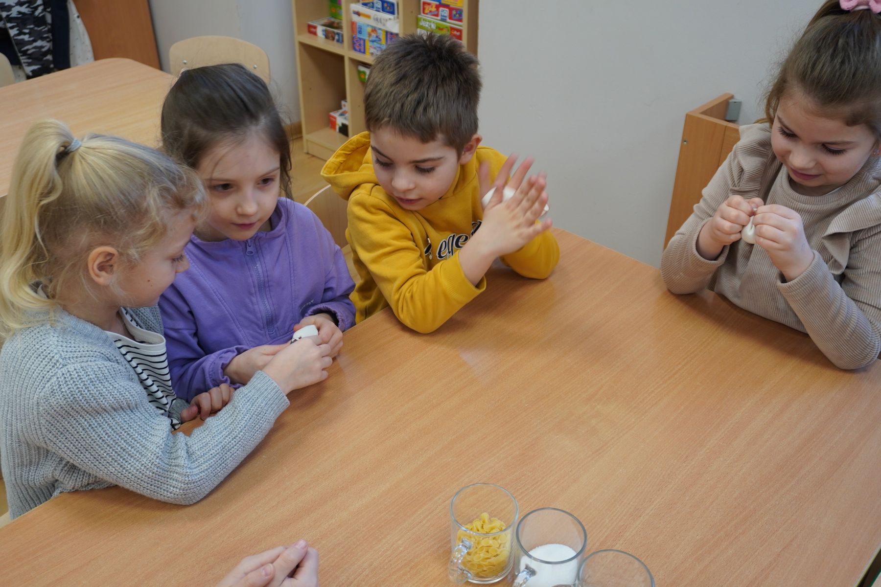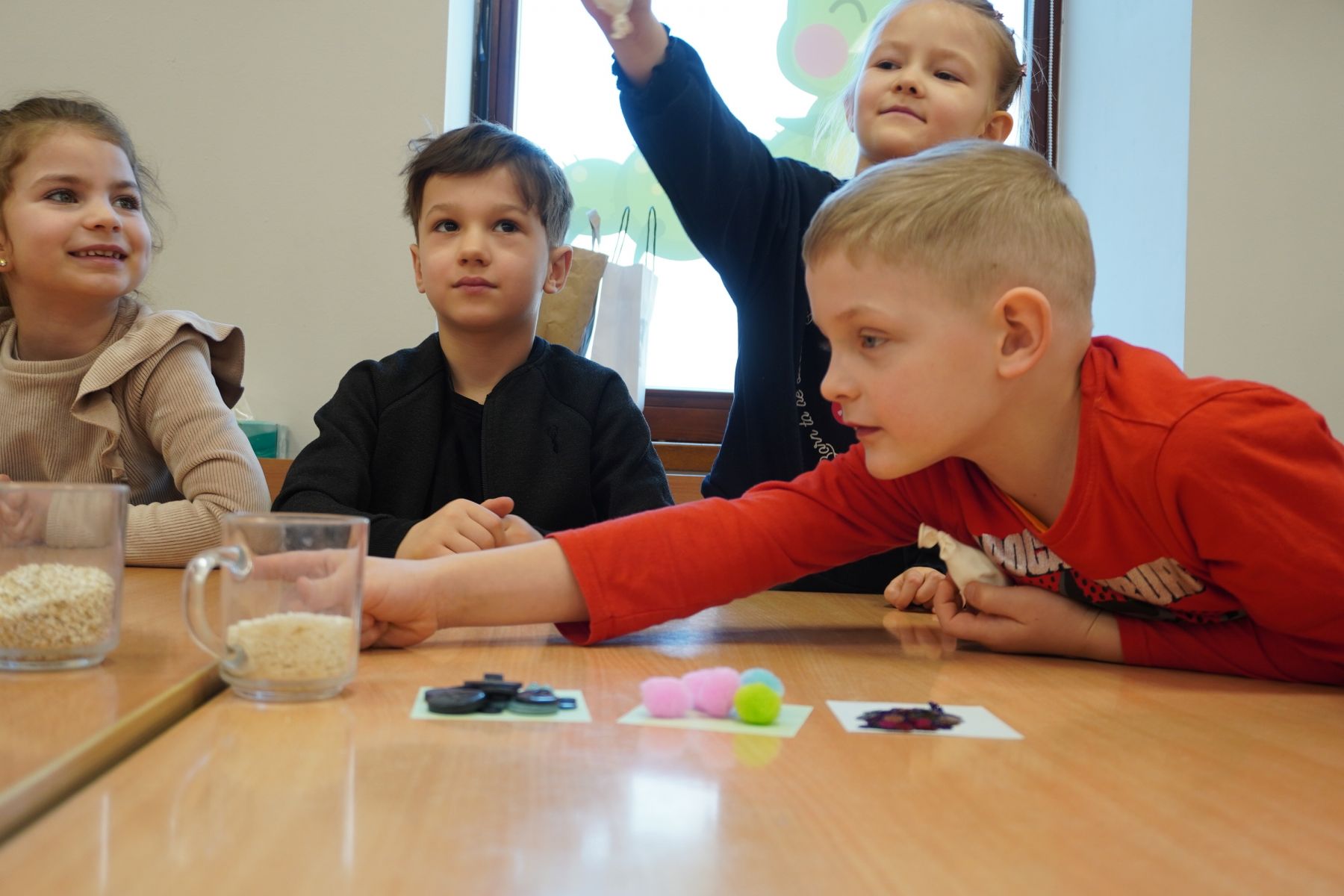 Zadaniem dzieci było za pomocą dotyku odgadnięcie, który produkt z przedstawionych na kartoniku ukrył się w balonie.