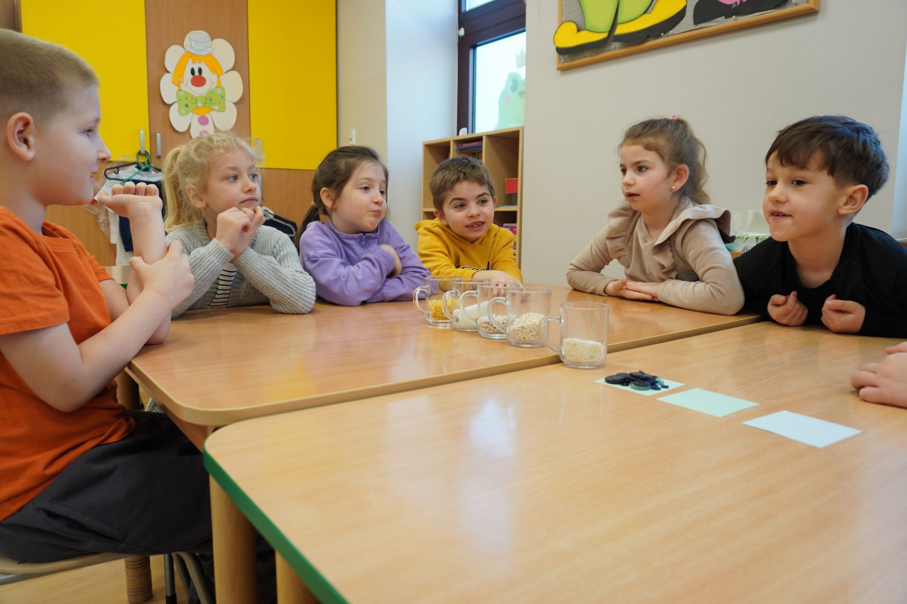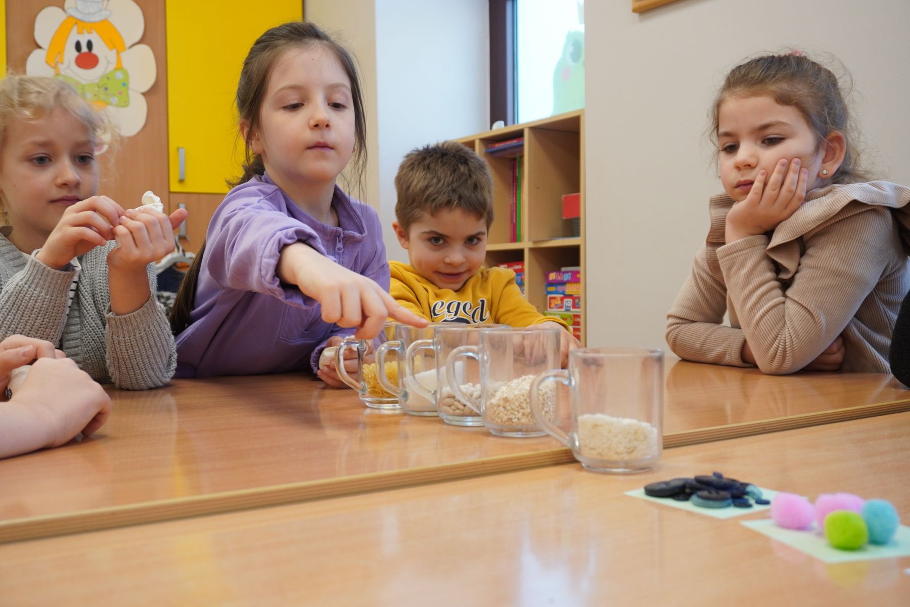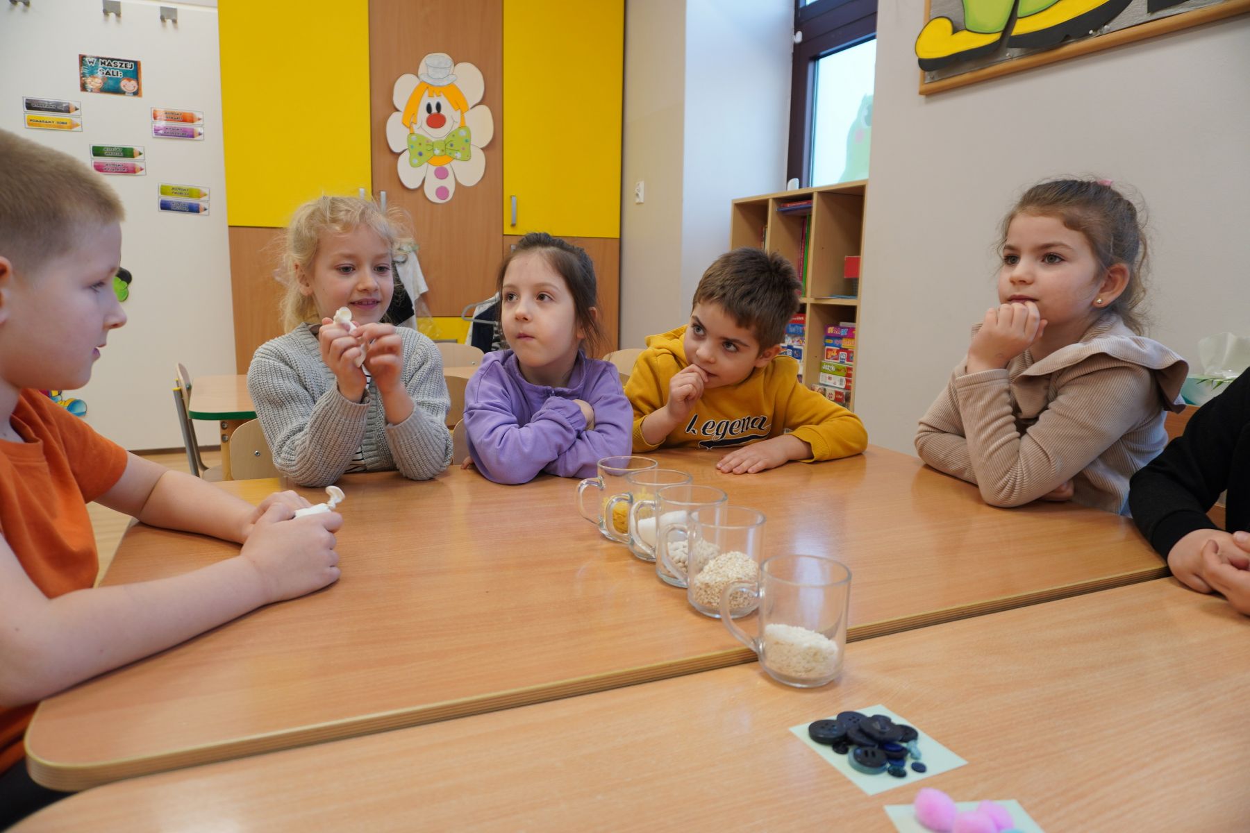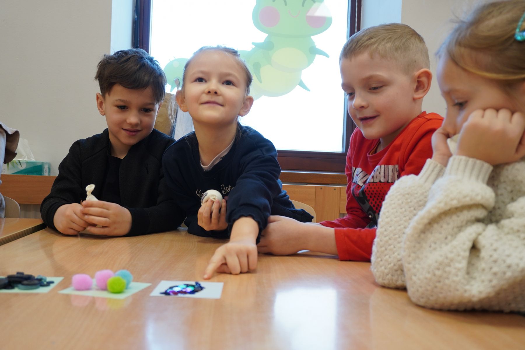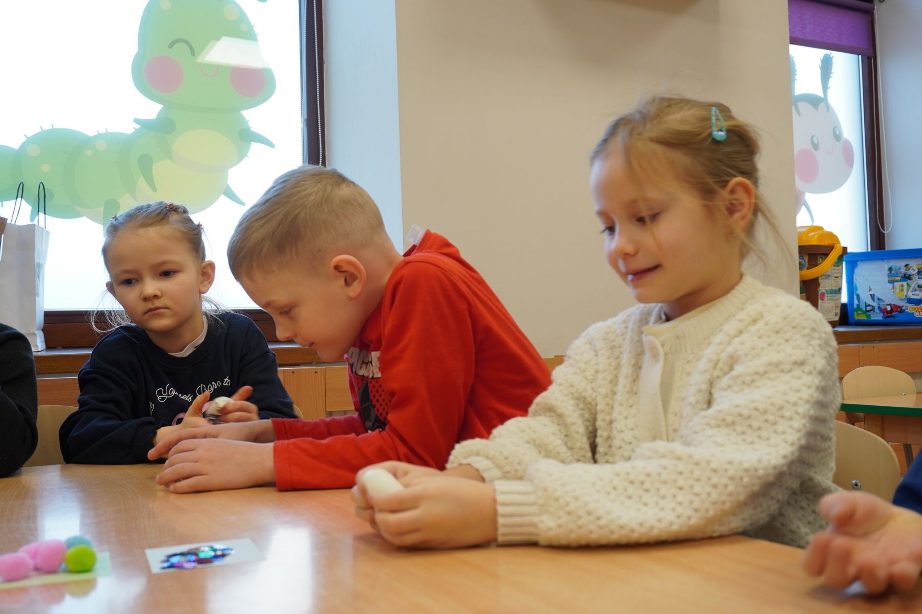 Zadaniem dzieci było za pomocą dotyku odgadnięcie, który produkt z przedstawionych na kartoniku ukrył się w balonie.