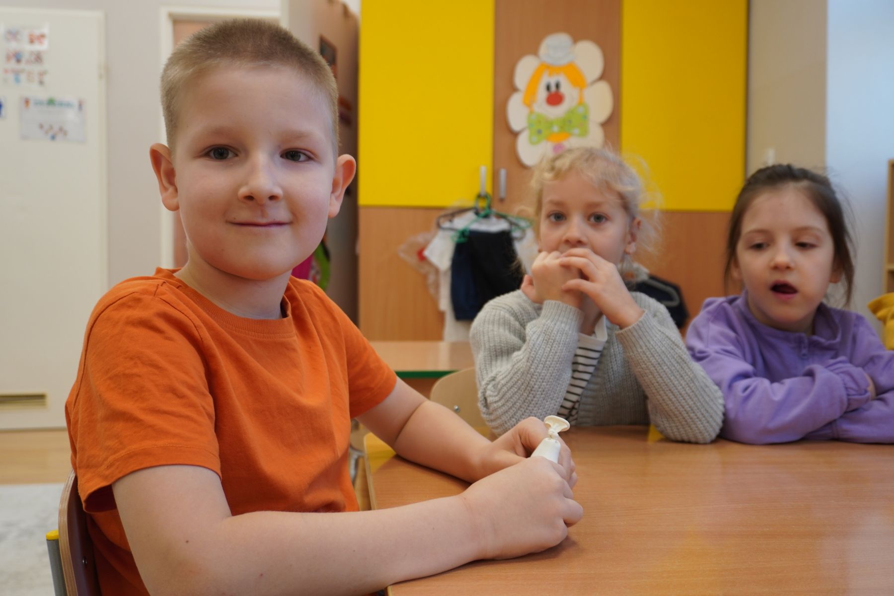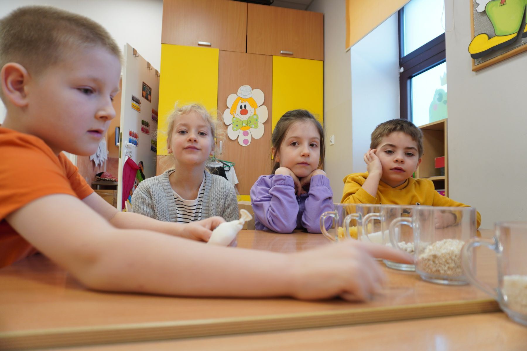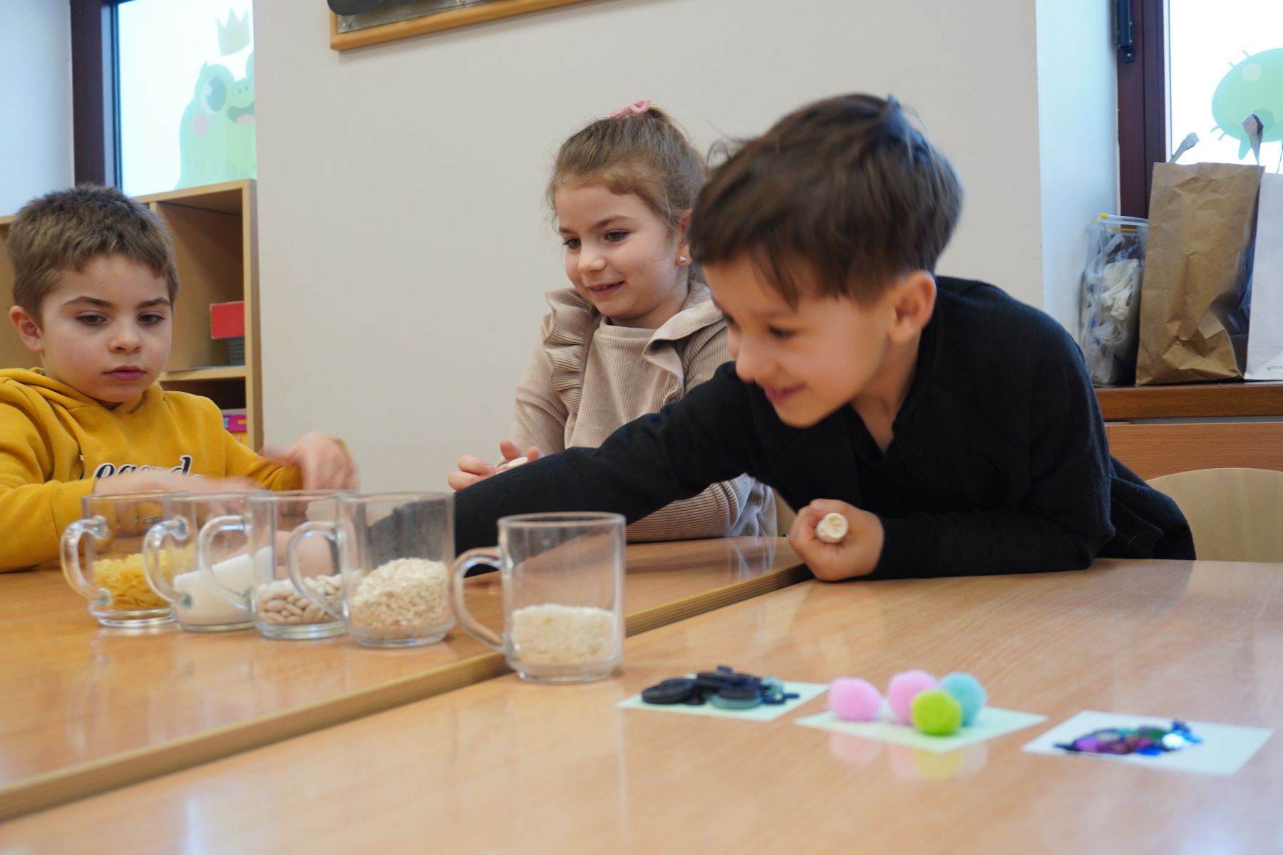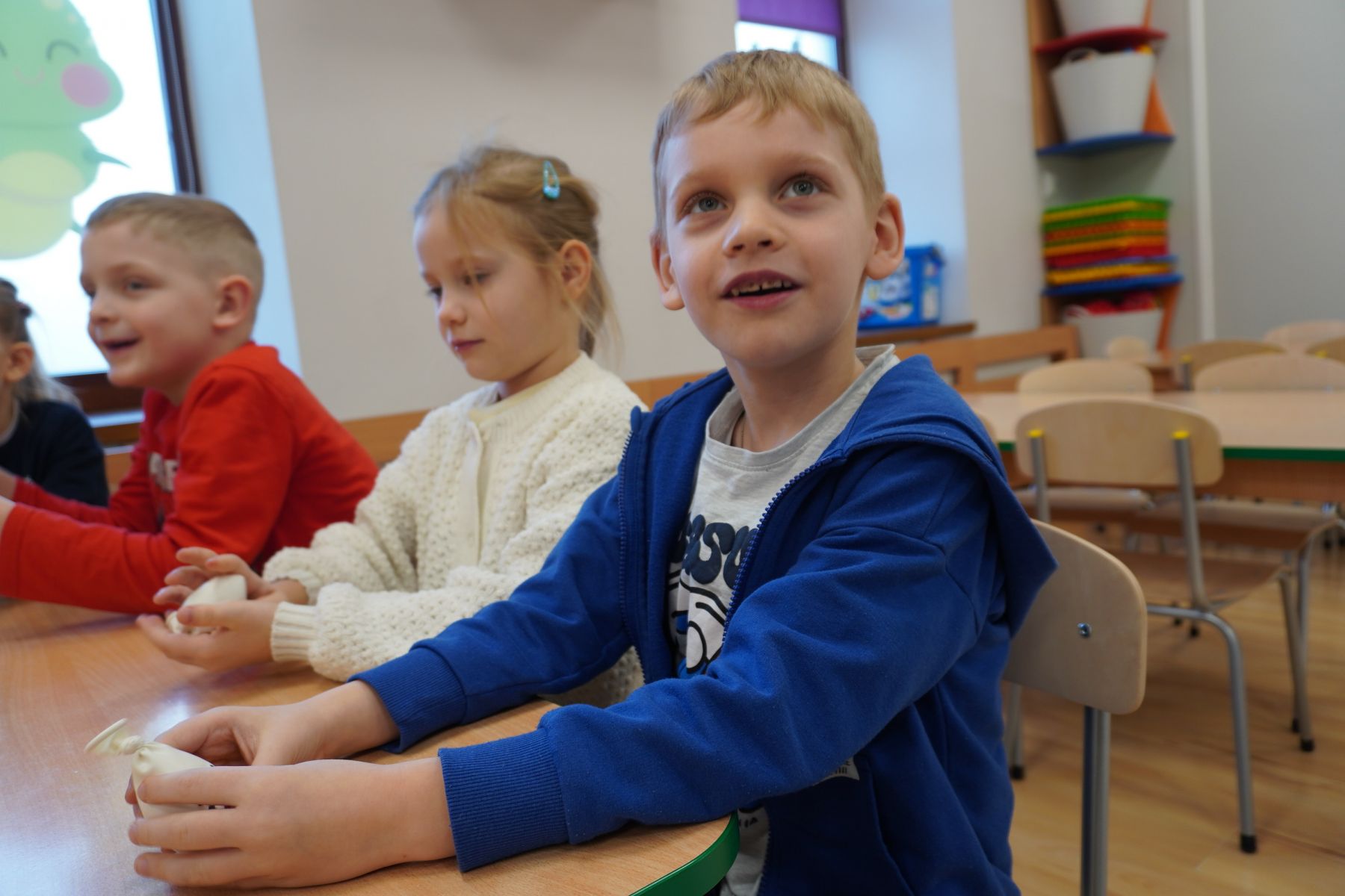 Zadaniem dzieci było za pomocą dotyku odgadnięcie, który produkt z przedstawionych na kartoniku ukrył się w balonie.