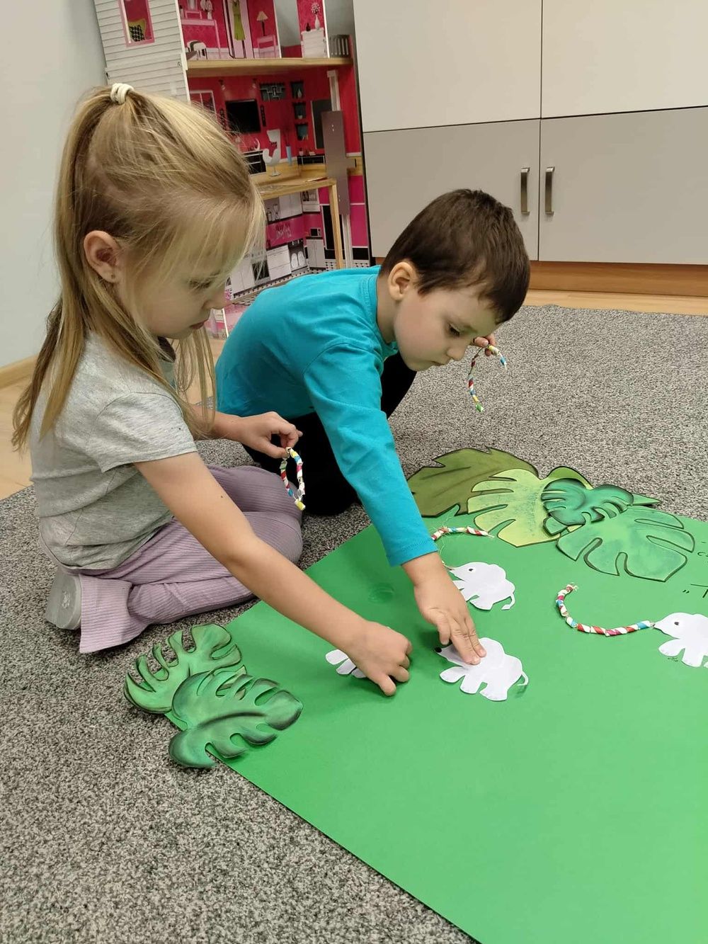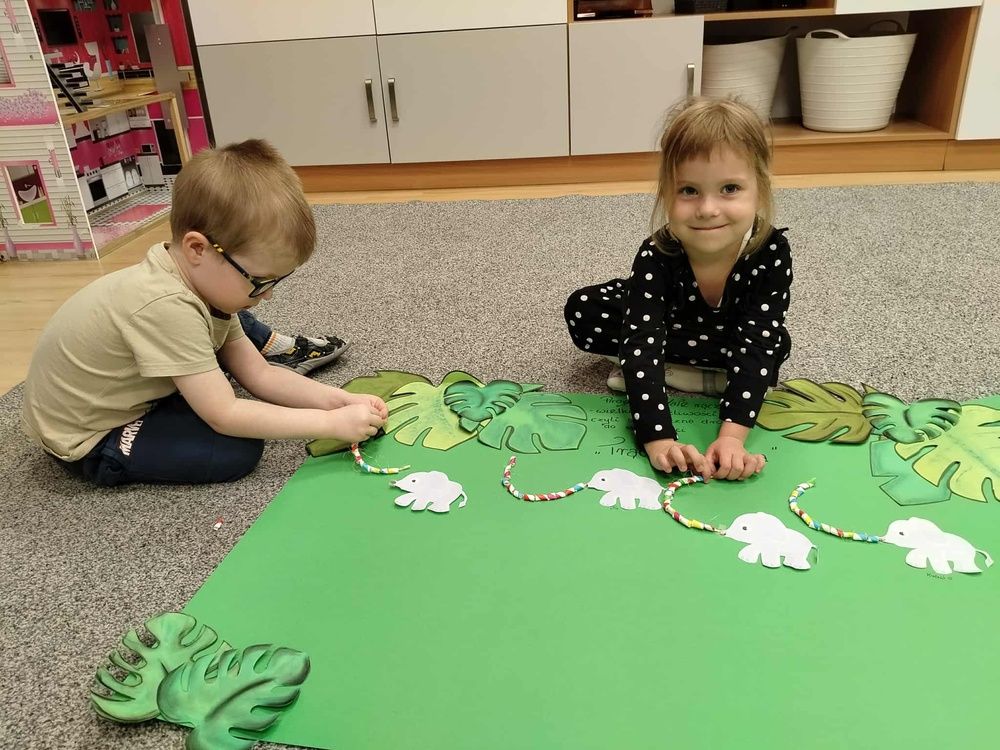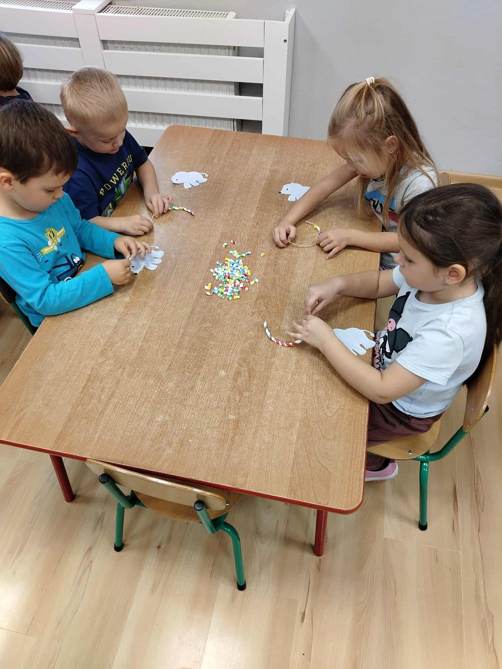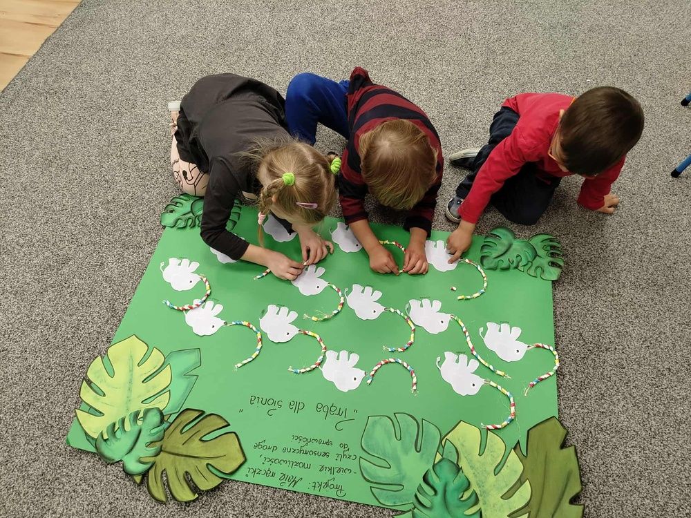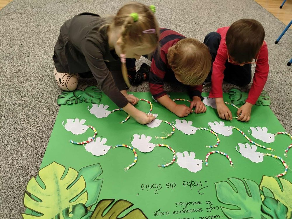 Co dzieci musiały zrobić? : zadaniem dzieci było nawlekanie kawałków pociętej plastikowej słomki na sznurek, która utworzy trąbę słonia.