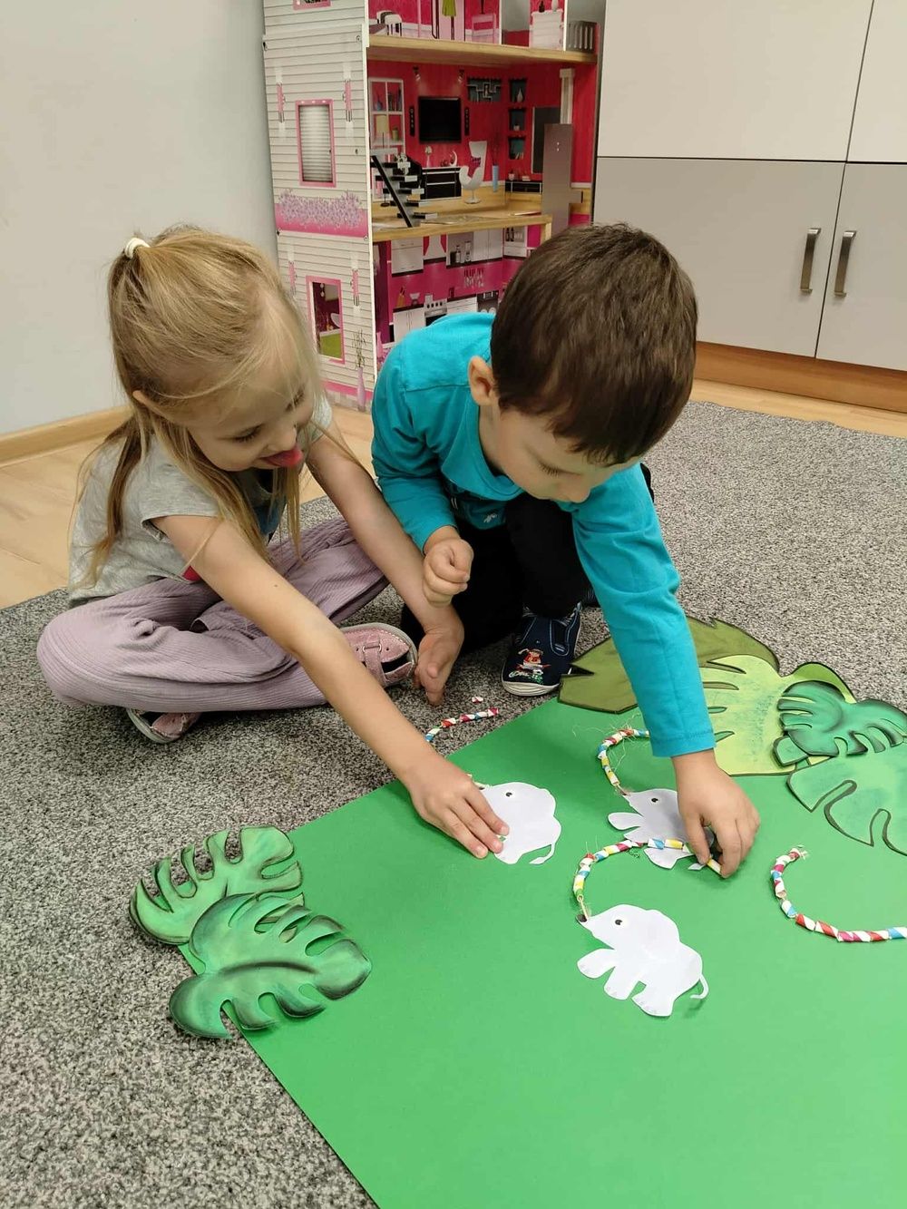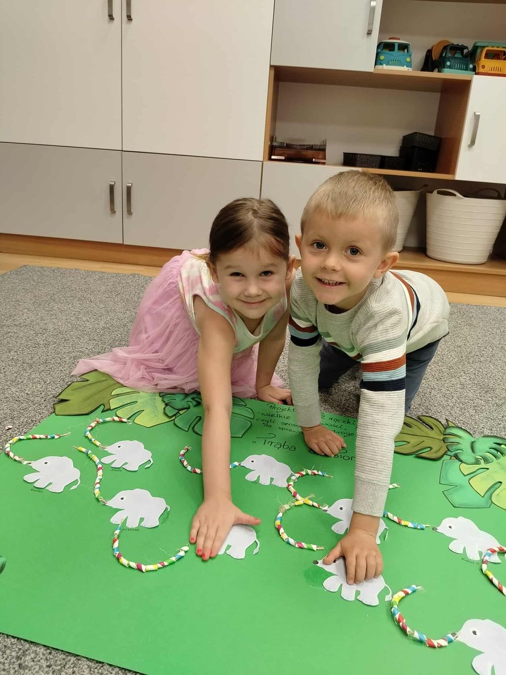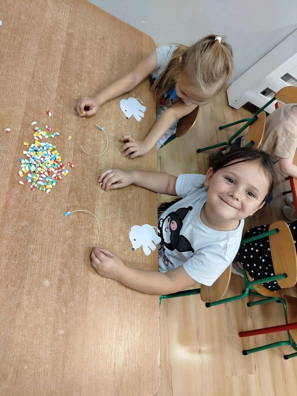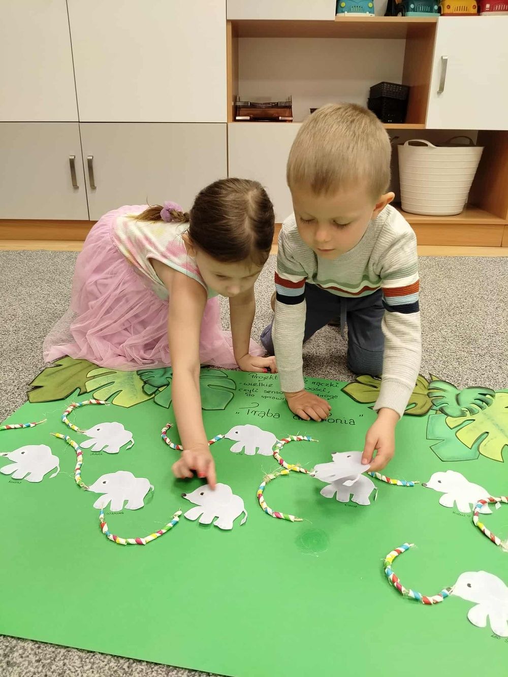 Co dzieci musiały zrobić? : zadaniem dzieci było nawlekanie kawałków pociętej plastikowej słomki na sznurek, która utworzy trąbę słonia.