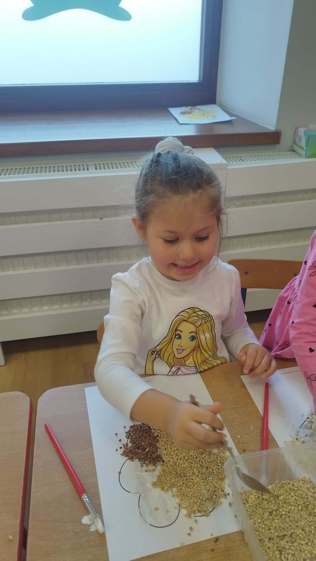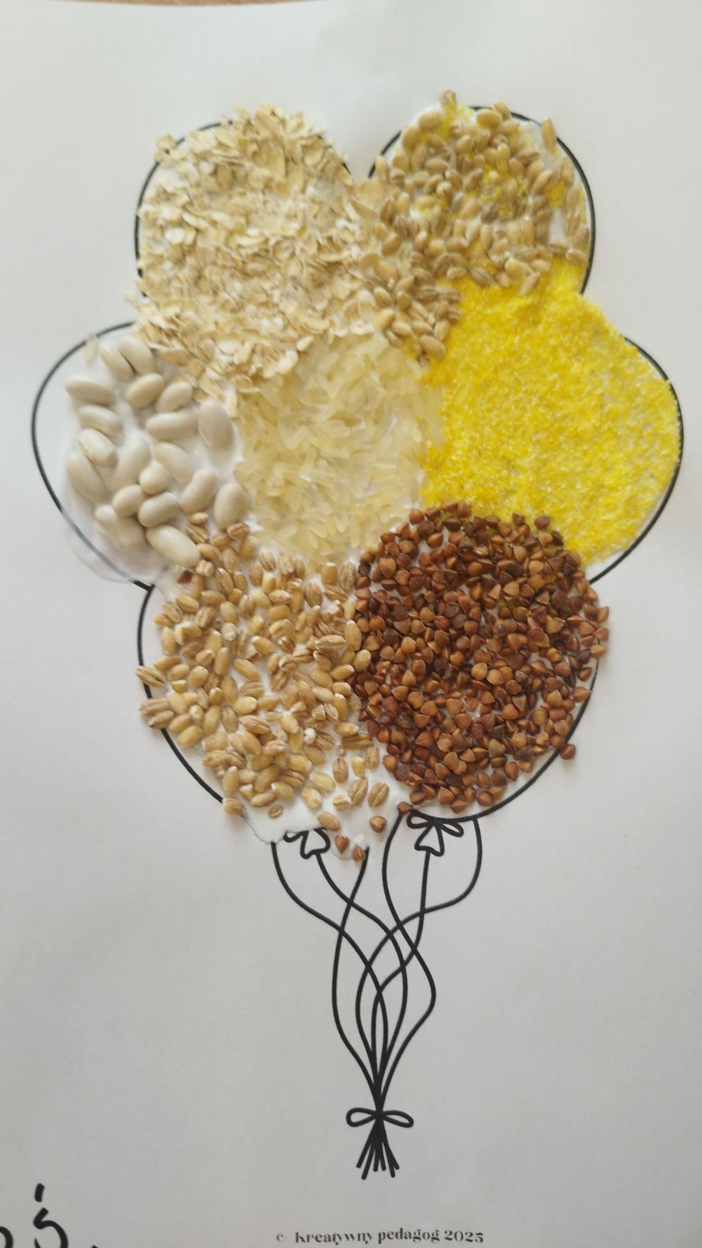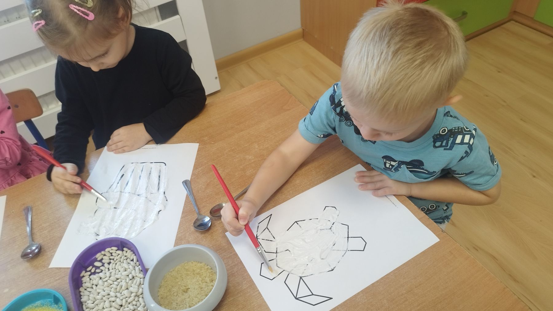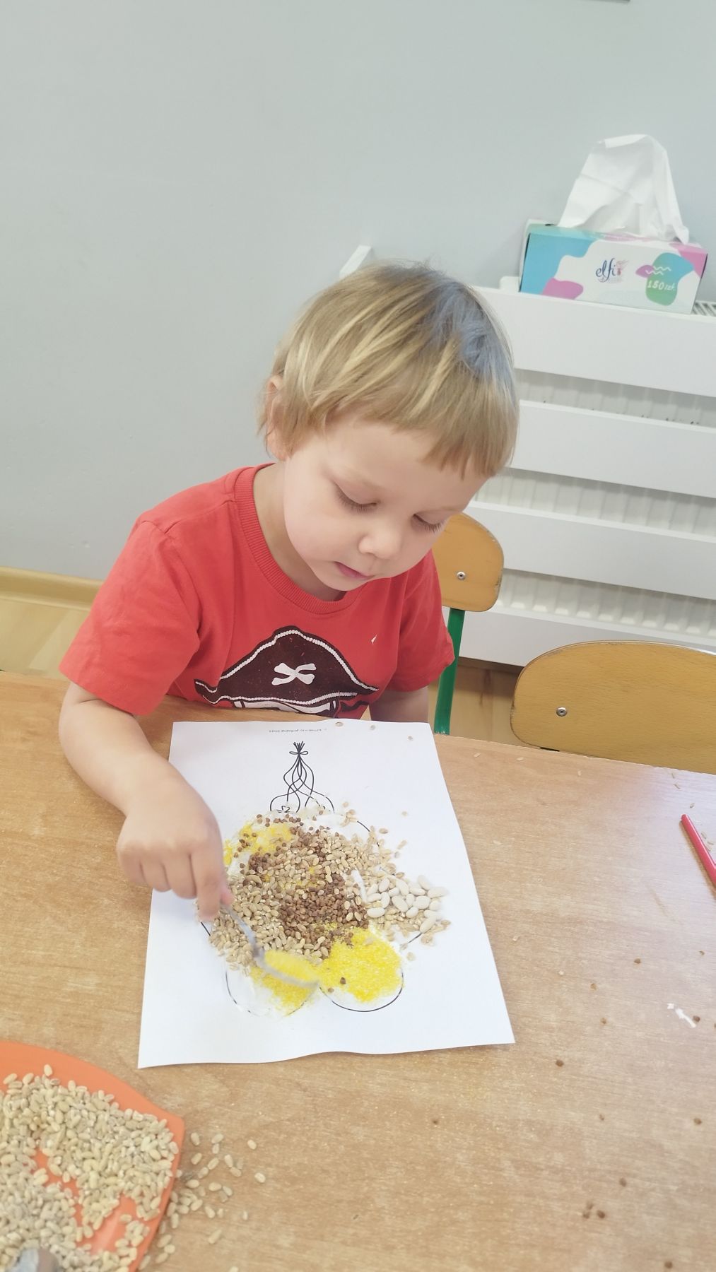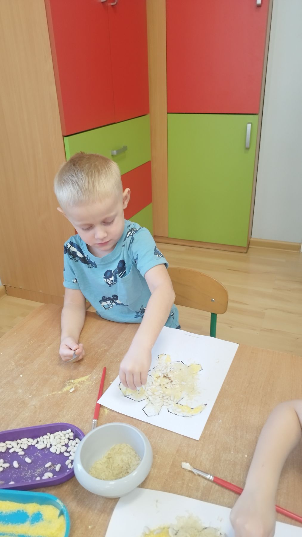 Zadanie dziec : Poproś dzieci,aby posmarowały szablon klejem i za pomocą sypkich produktów ozdobiły go według własnego pomysłu.