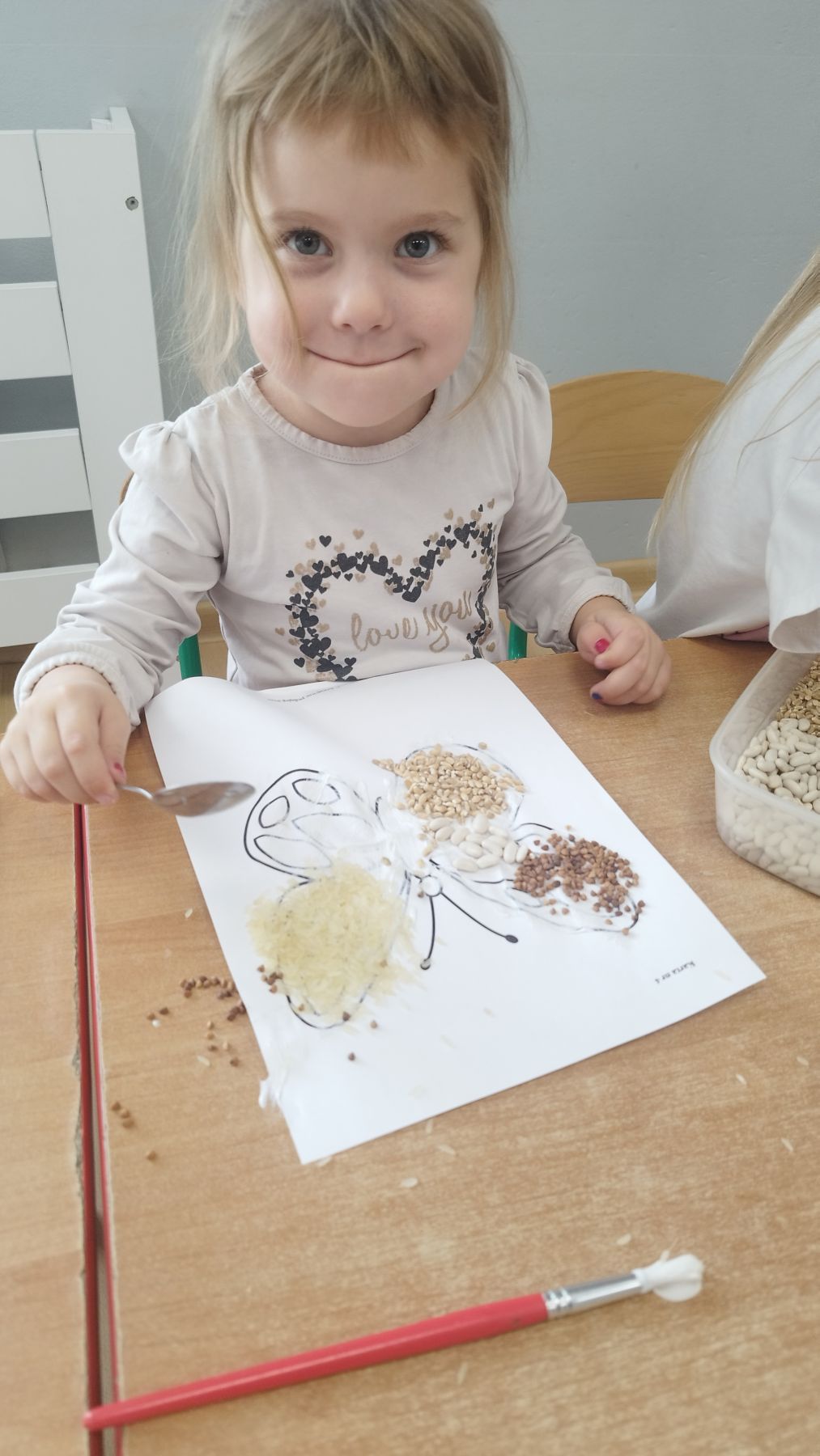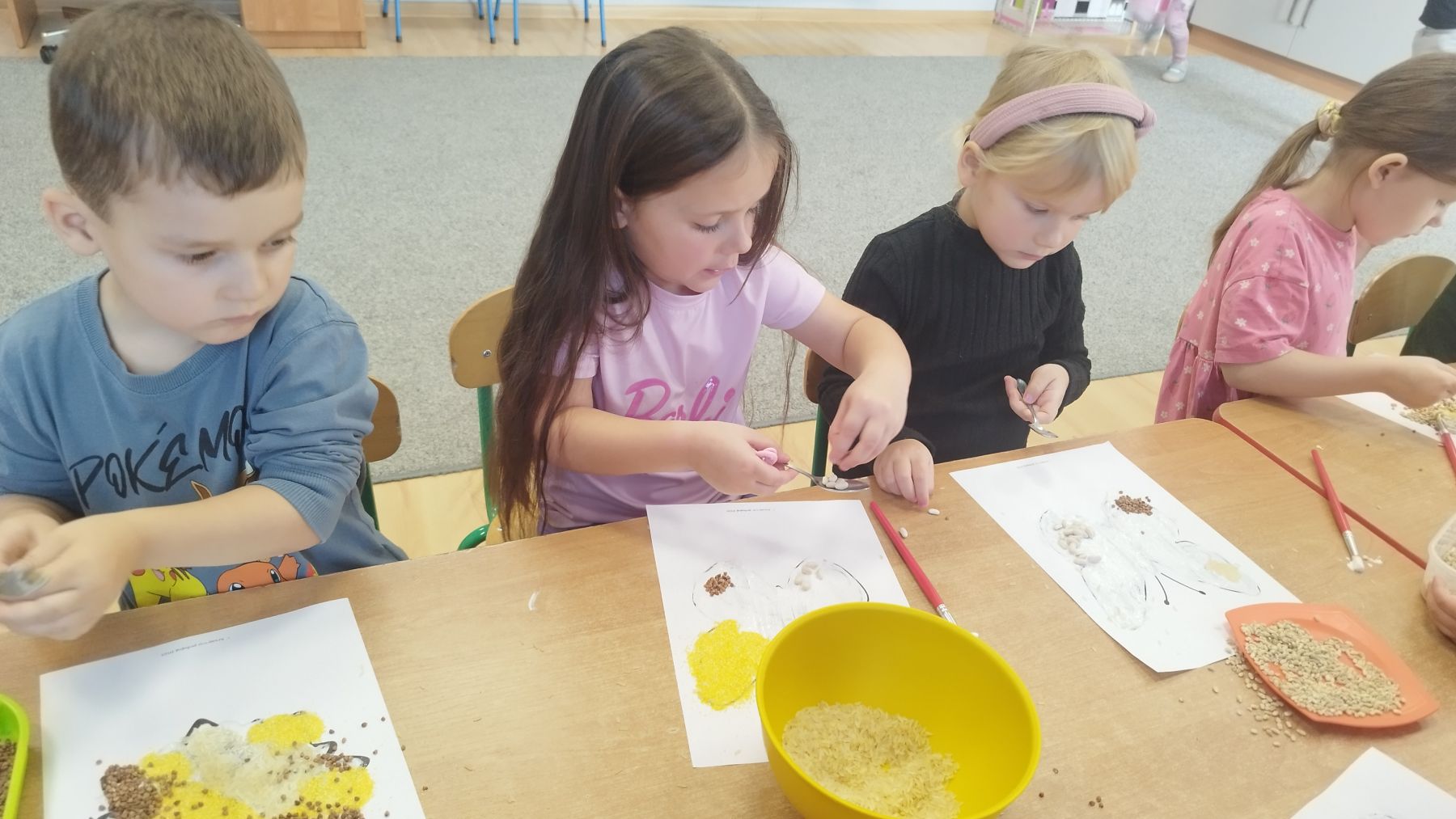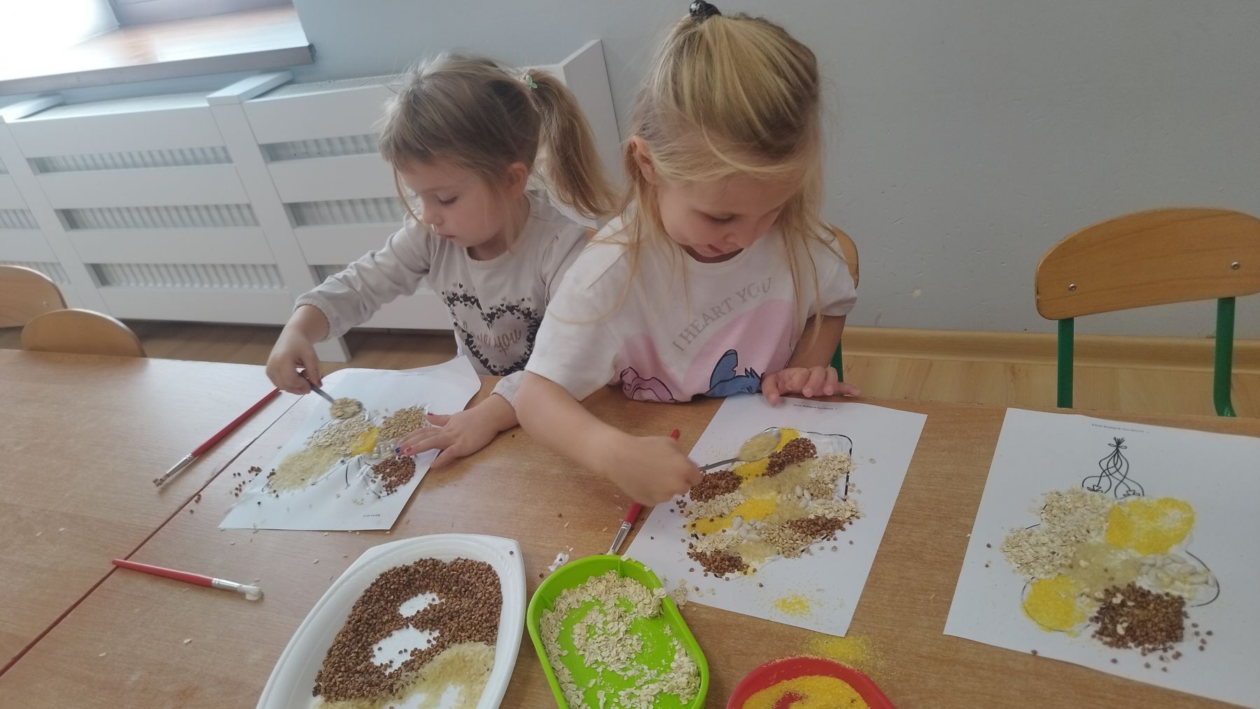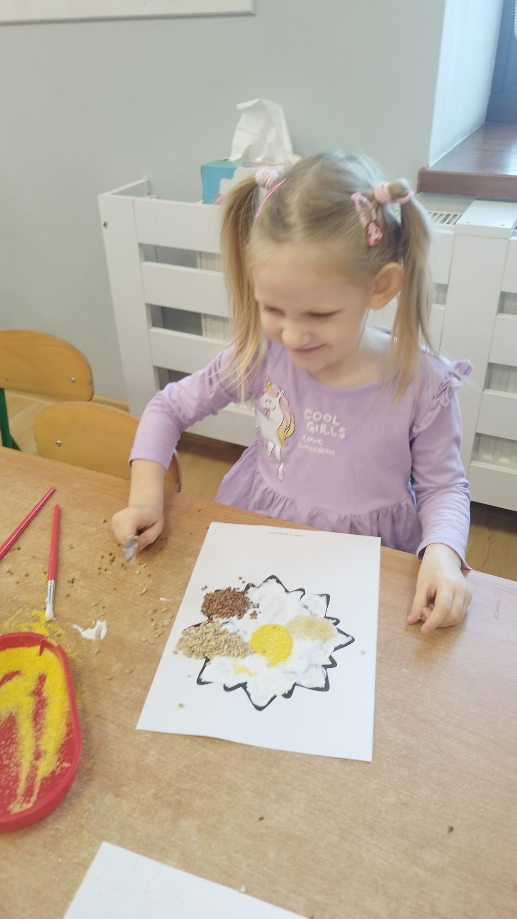 Zadanie dziec : Poproś dzieci,aby posmarowały szablon klejem i za pomocą sypkich produktów ozdobiły go według własnego pomysłu.