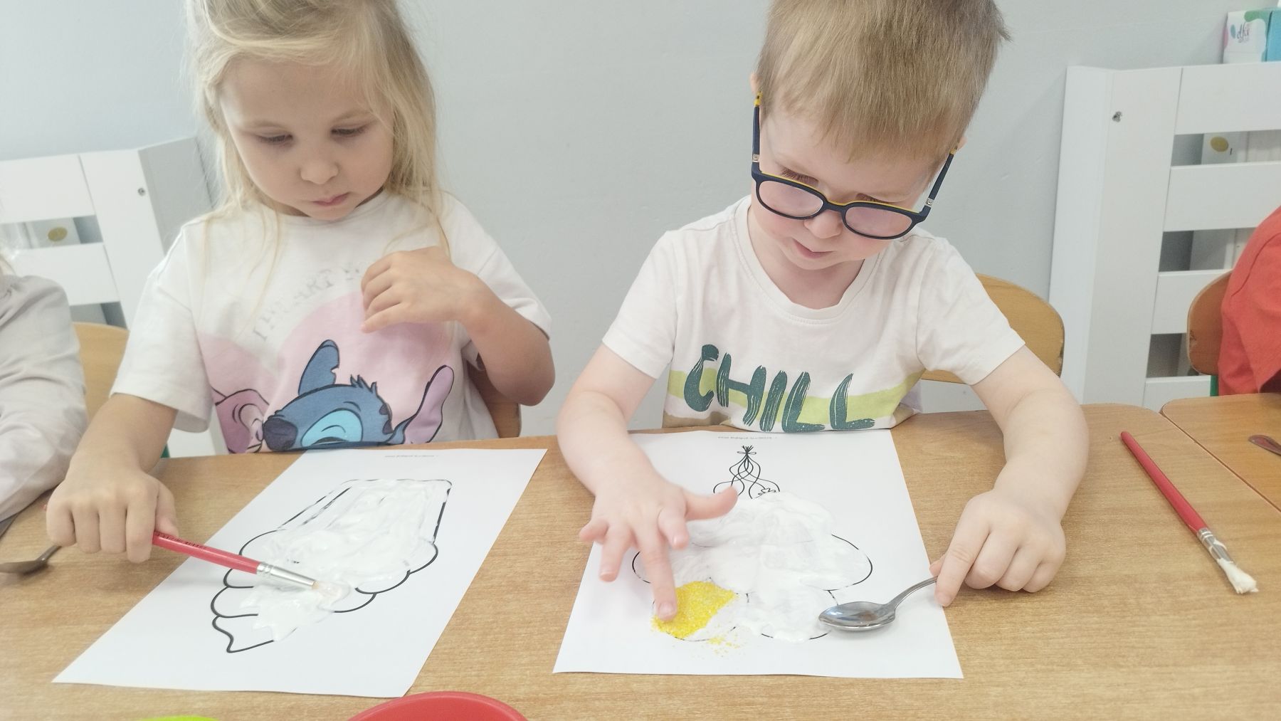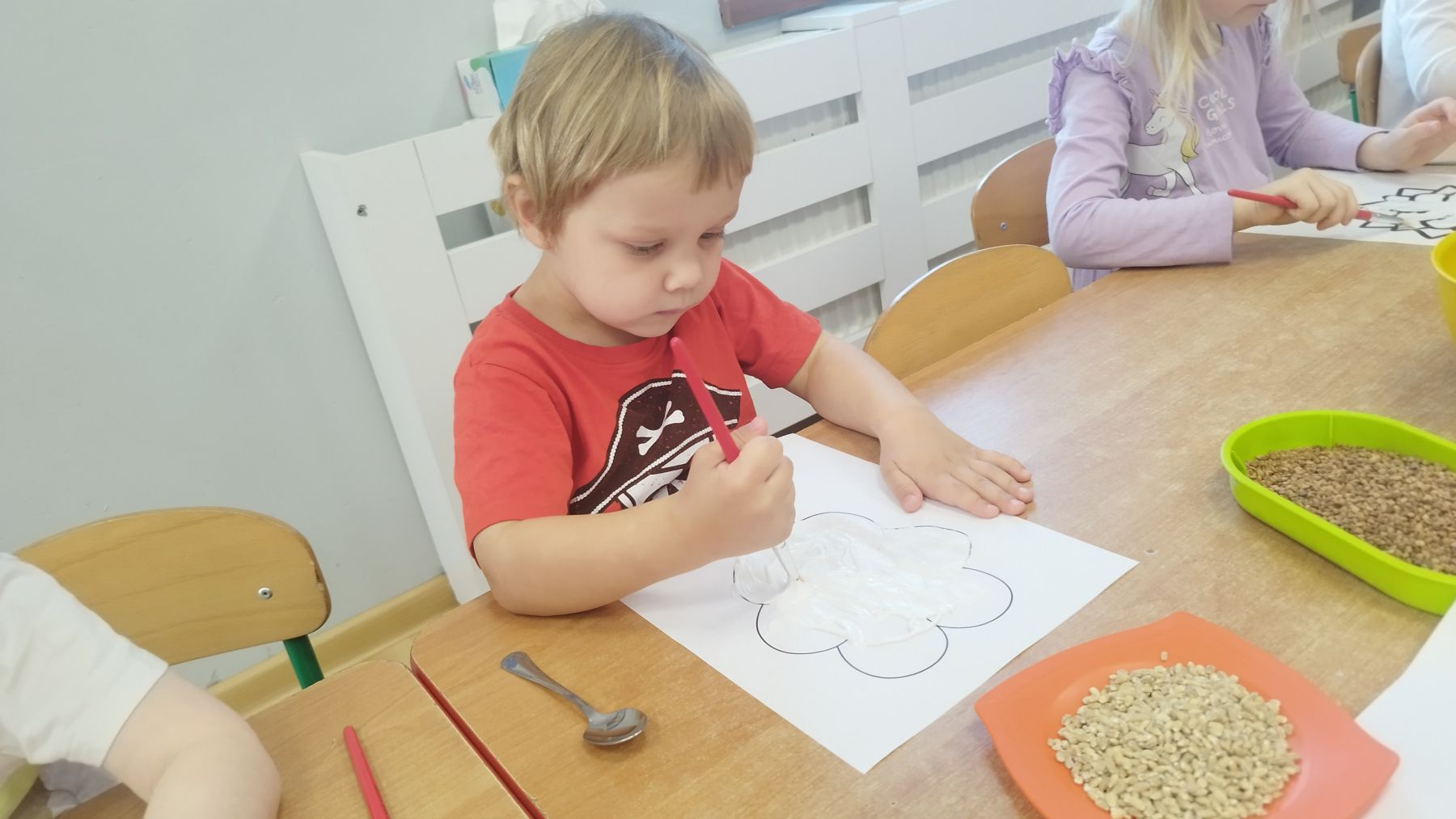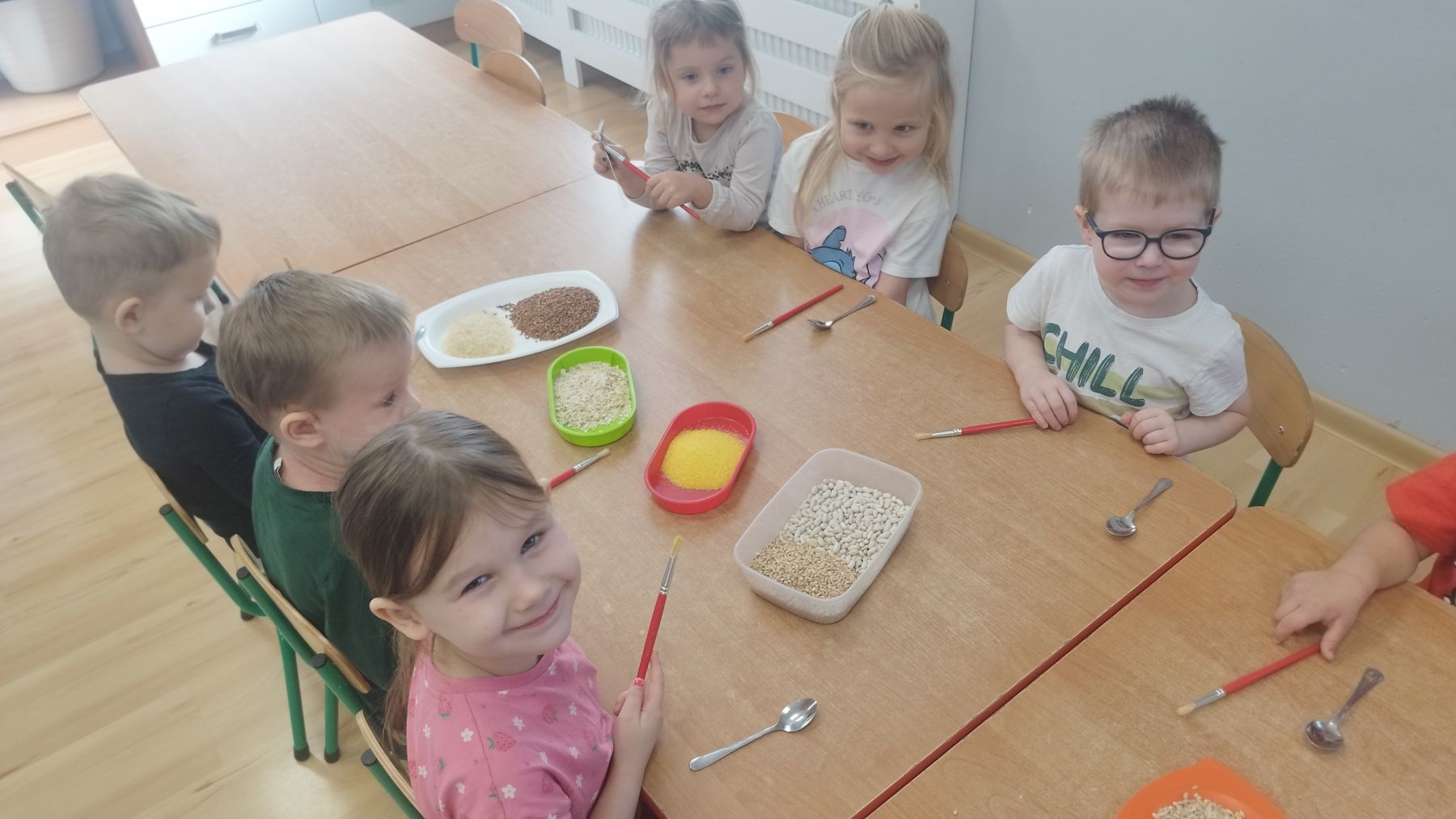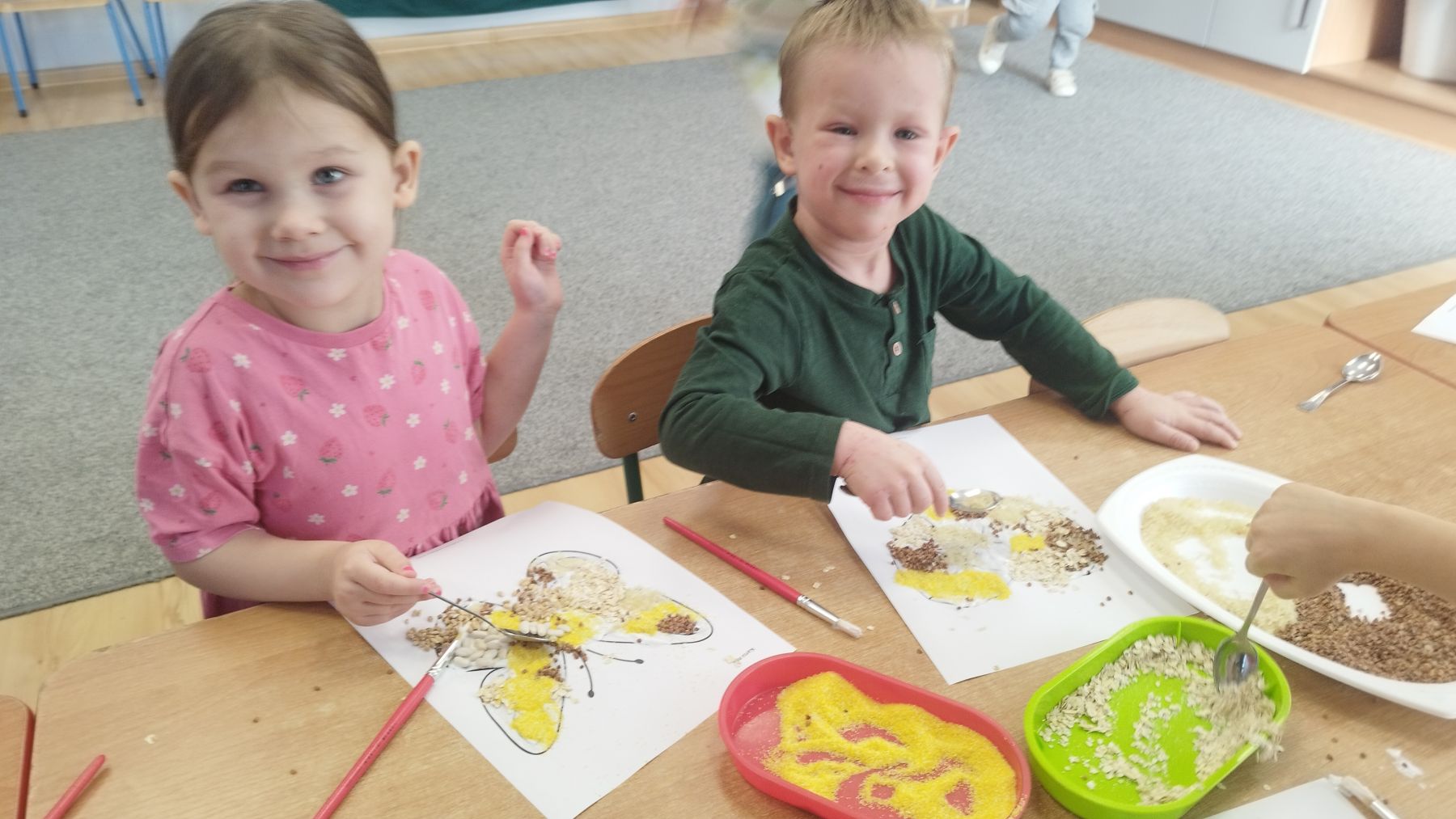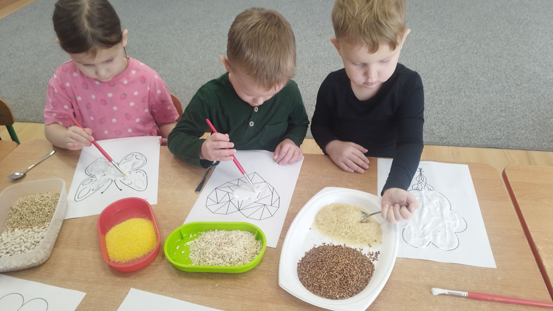 Zadanie dziec : Poproś dzieci,aby posmarowały szablon klejem i za pomocą sypkich produktów ozdobiły go według własnego pomysłu.