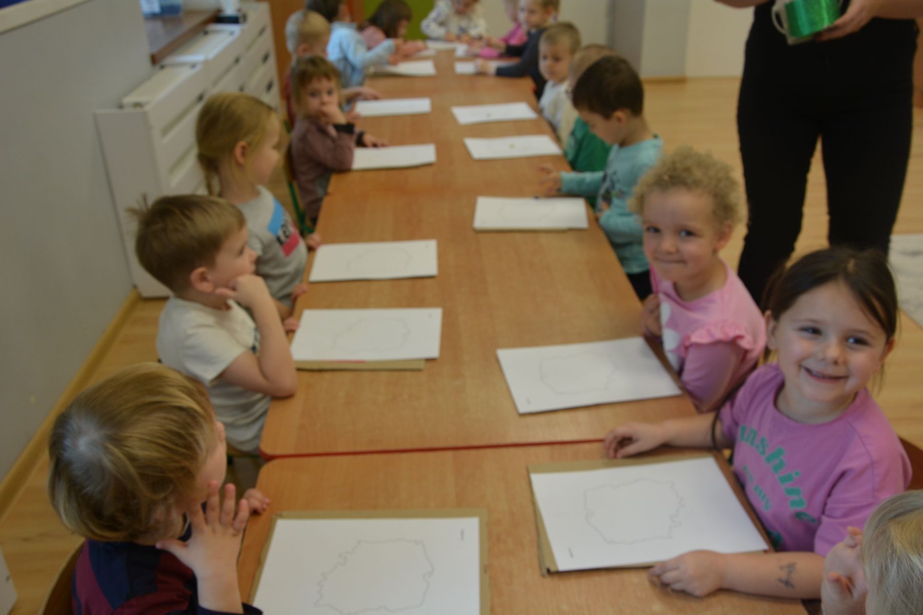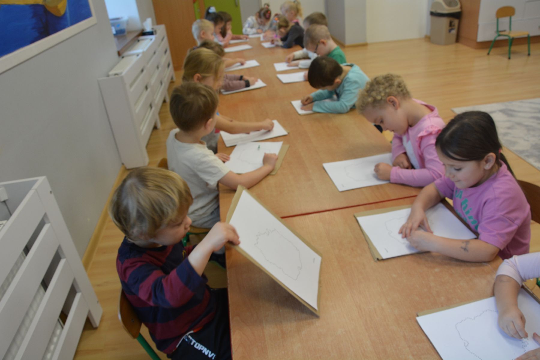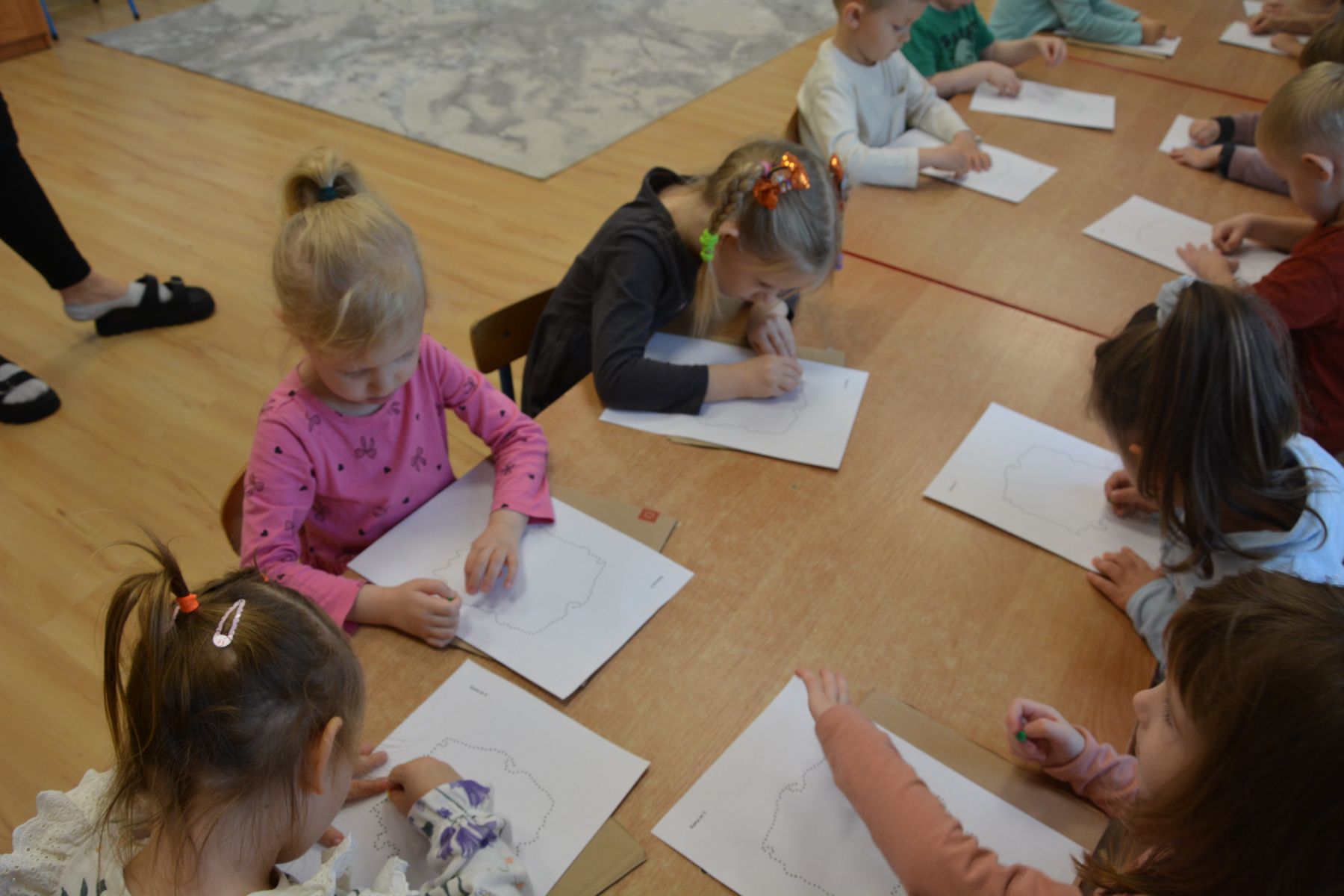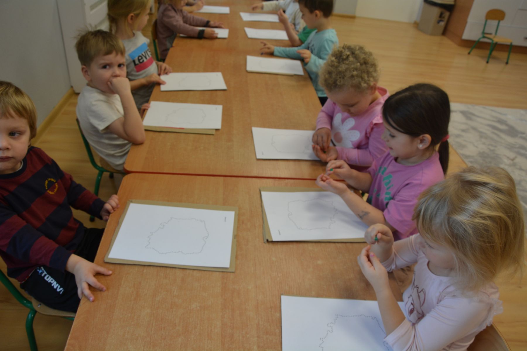 Zadaniem dzieci było nakłuwanie każdej kropki z konturu Mapy Polski. Oczywiście przypomniane były dzieciom zasady bezpieczeństwa, gdyż pinezki są
