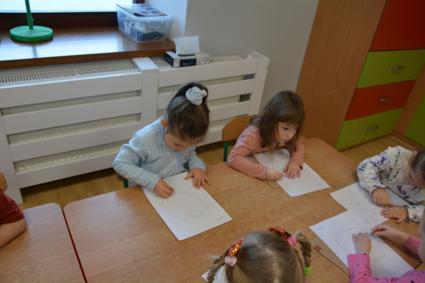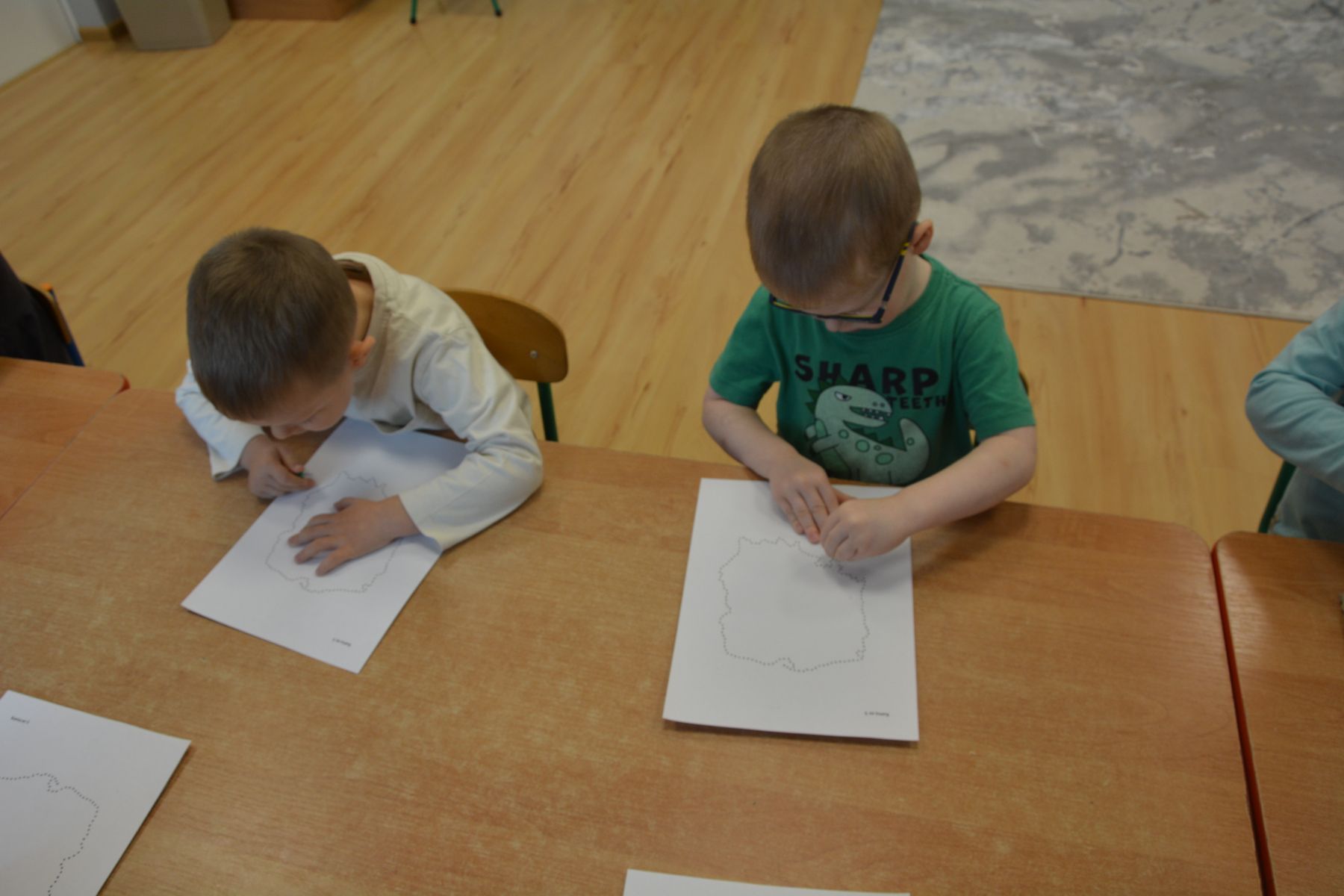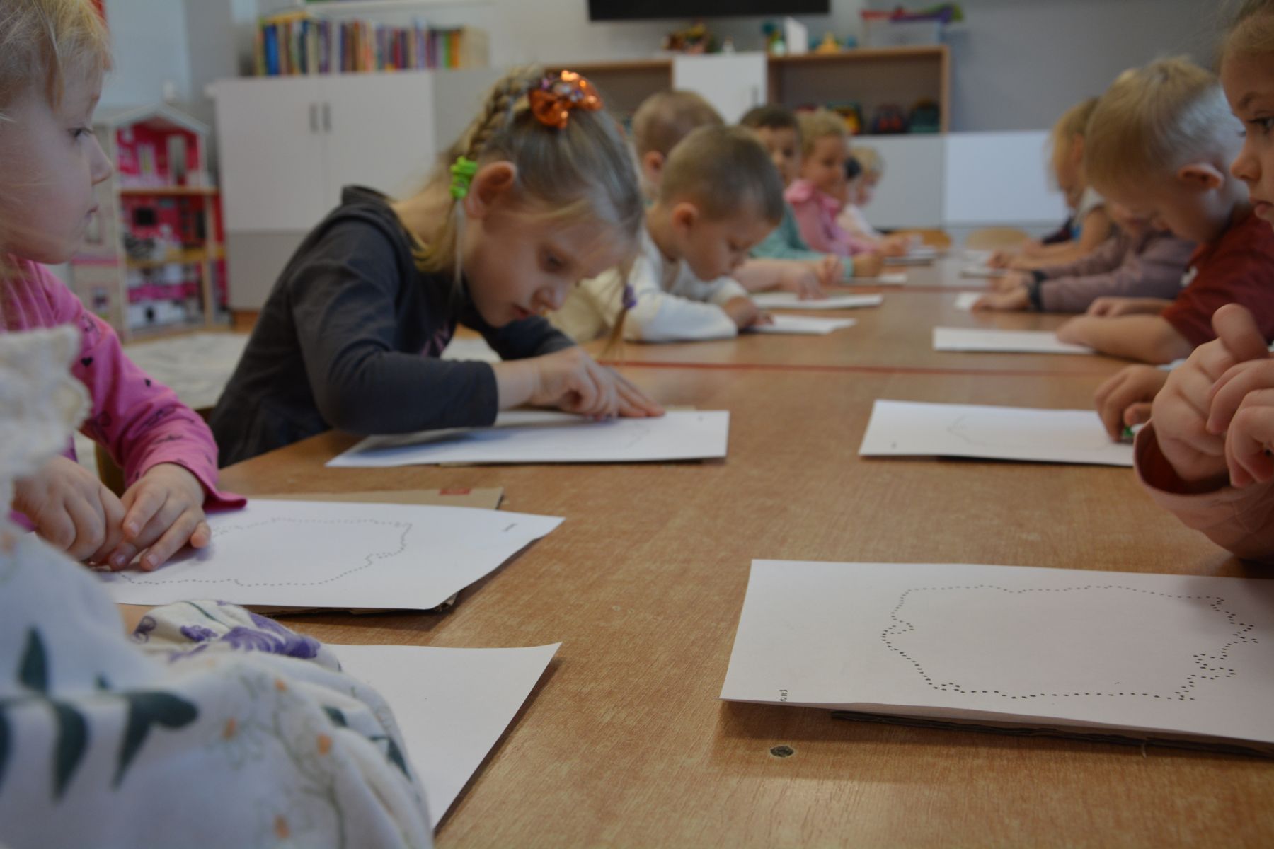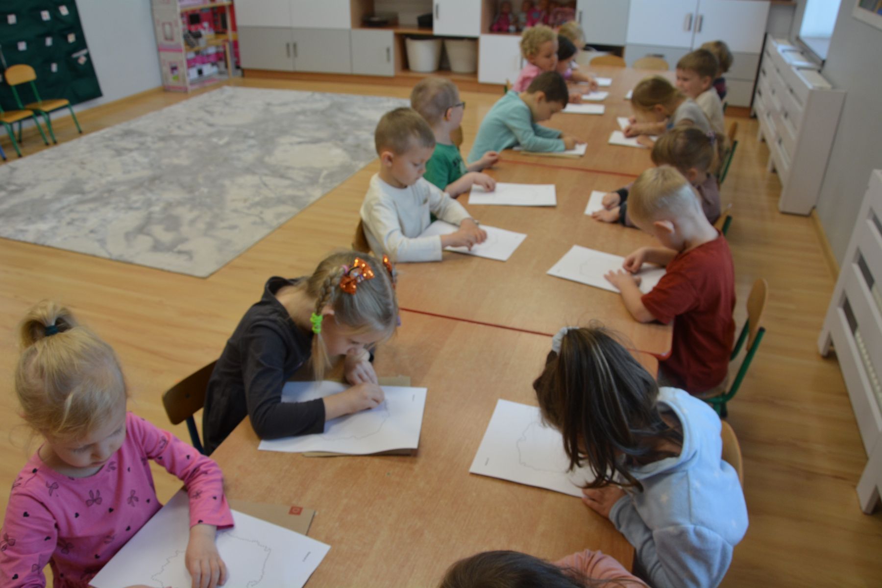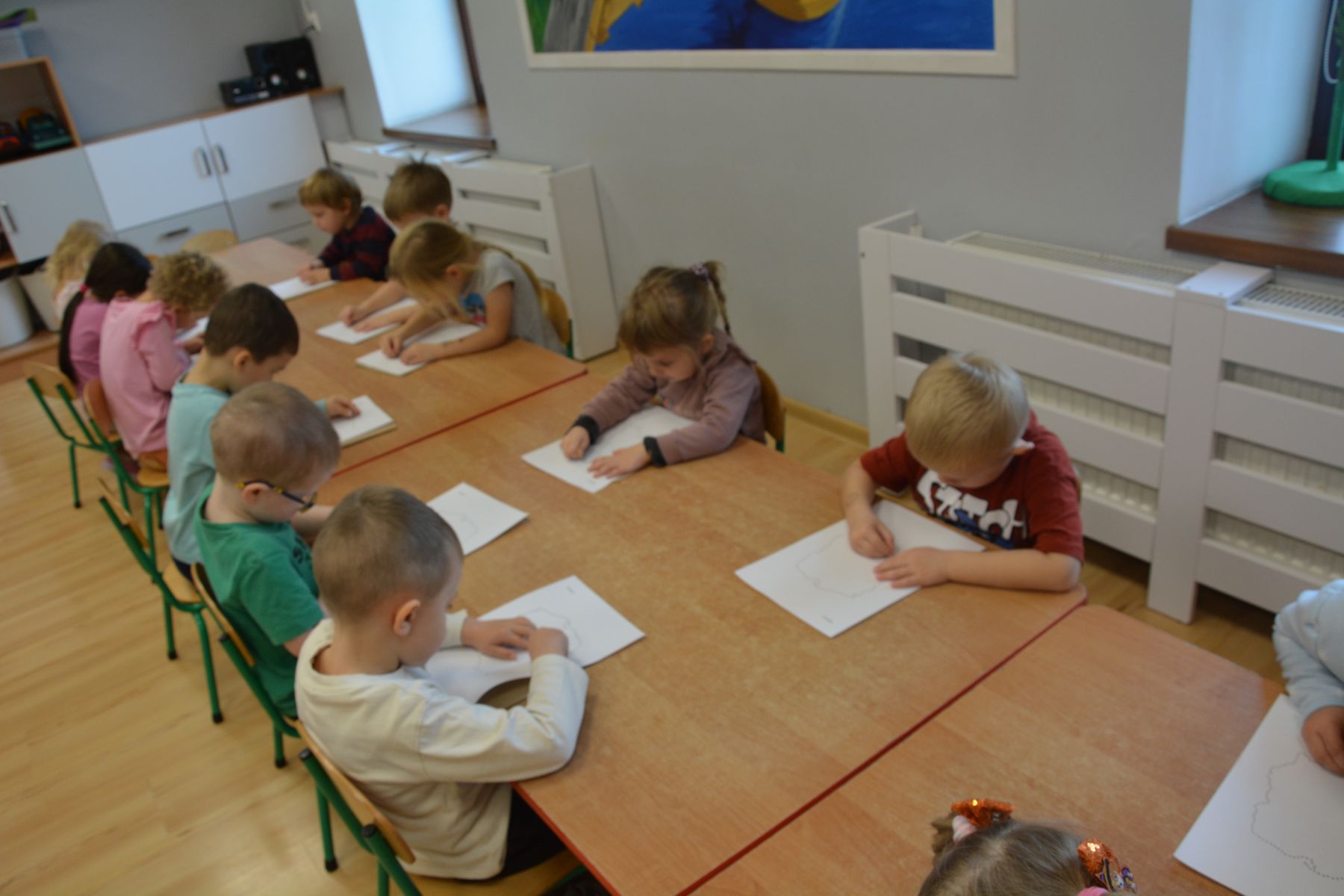 Zadaniem dzieci było nakłuwanie każdej kropki z konturu Mapy Polski. Oczywiście przypomniane były dzieciom zasady bezpieczeństwa, gdyż pinezki są