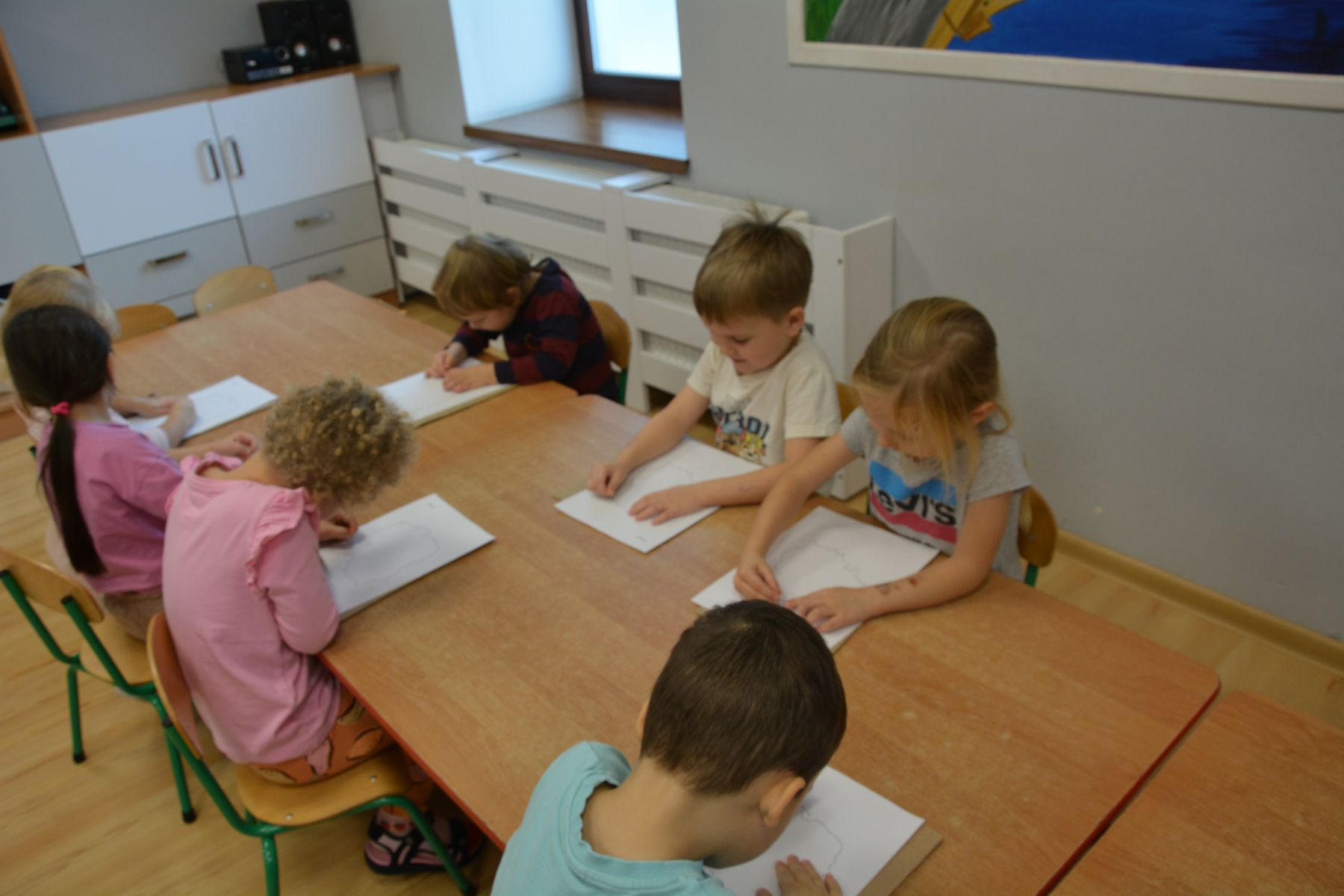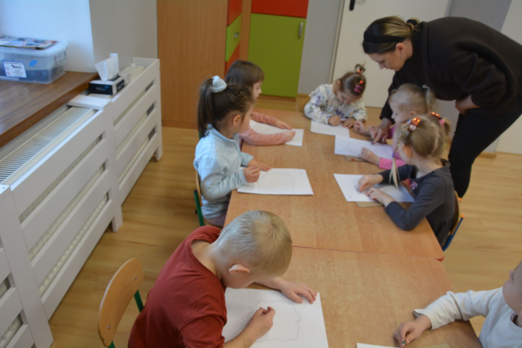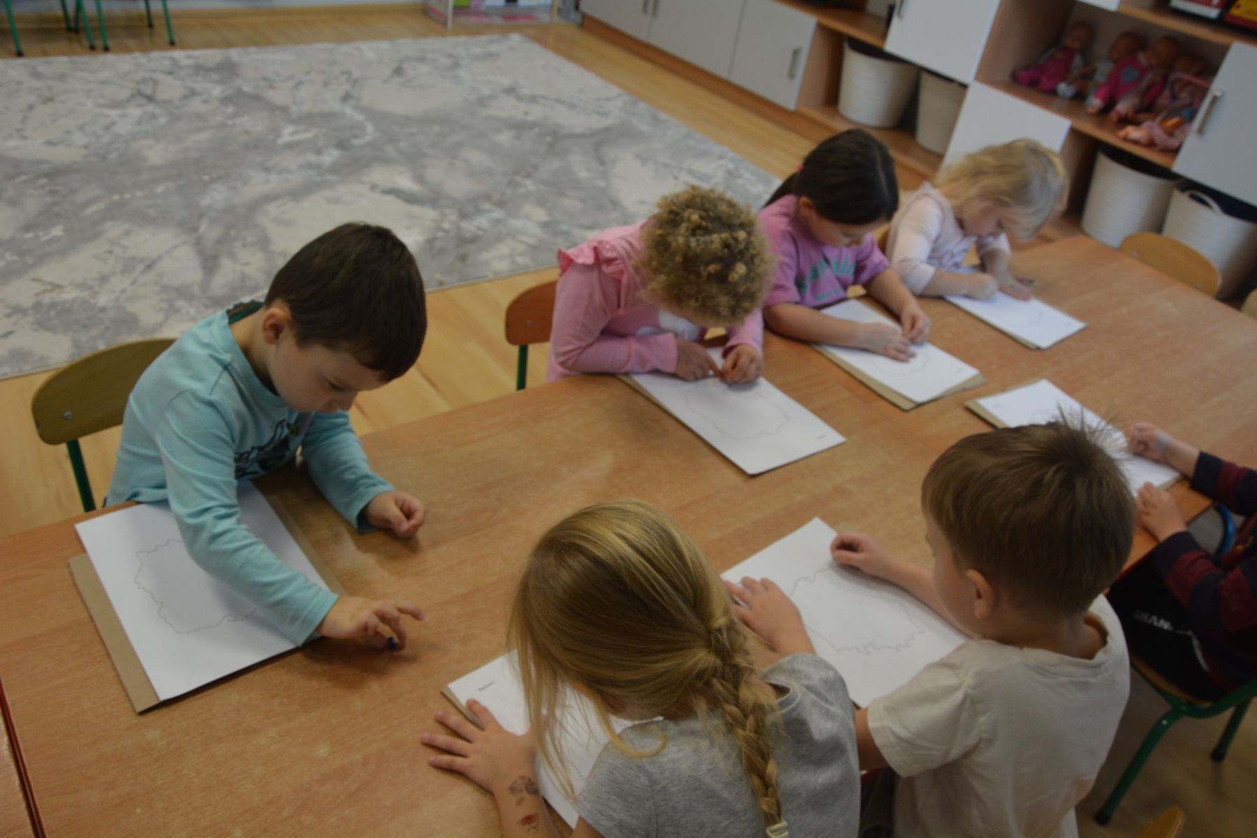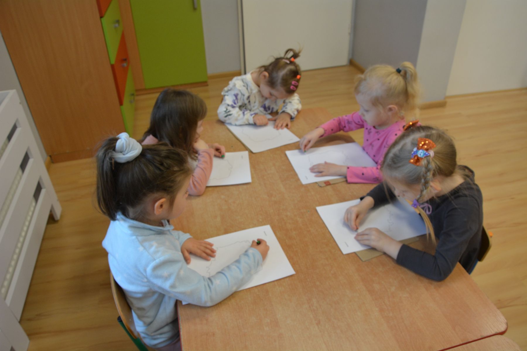 Zadaniem dzieci było nakłuwanie każdej kropki z konturu Mapy Polski. Oczywiście przypomniane były dzieciom zasady bezpieczeństwa, gdyż pinezki są