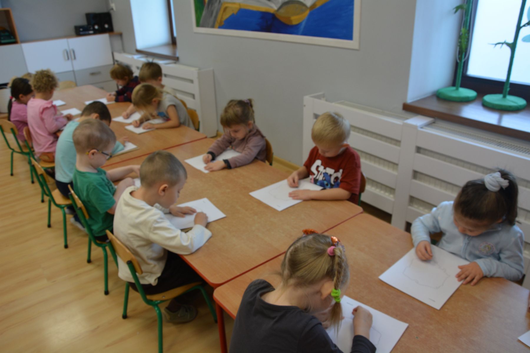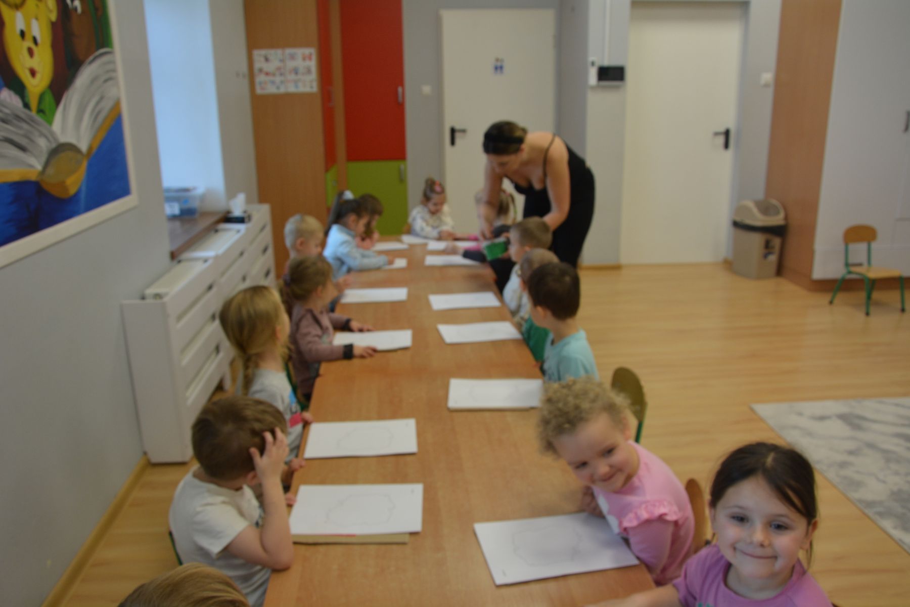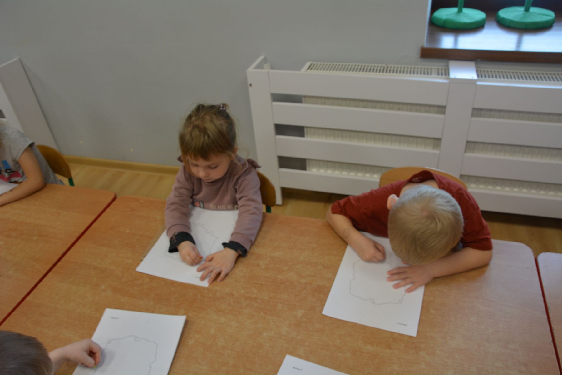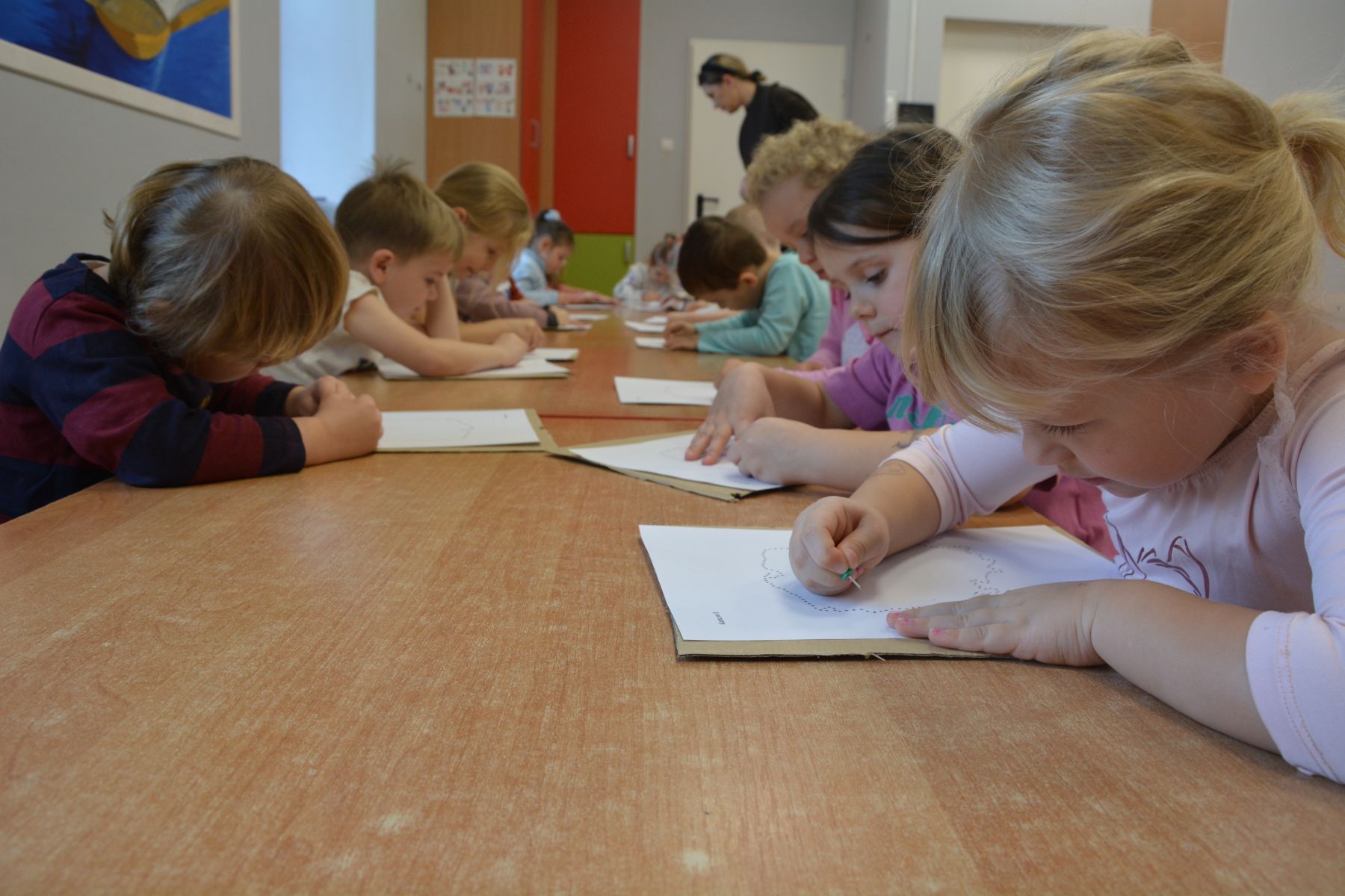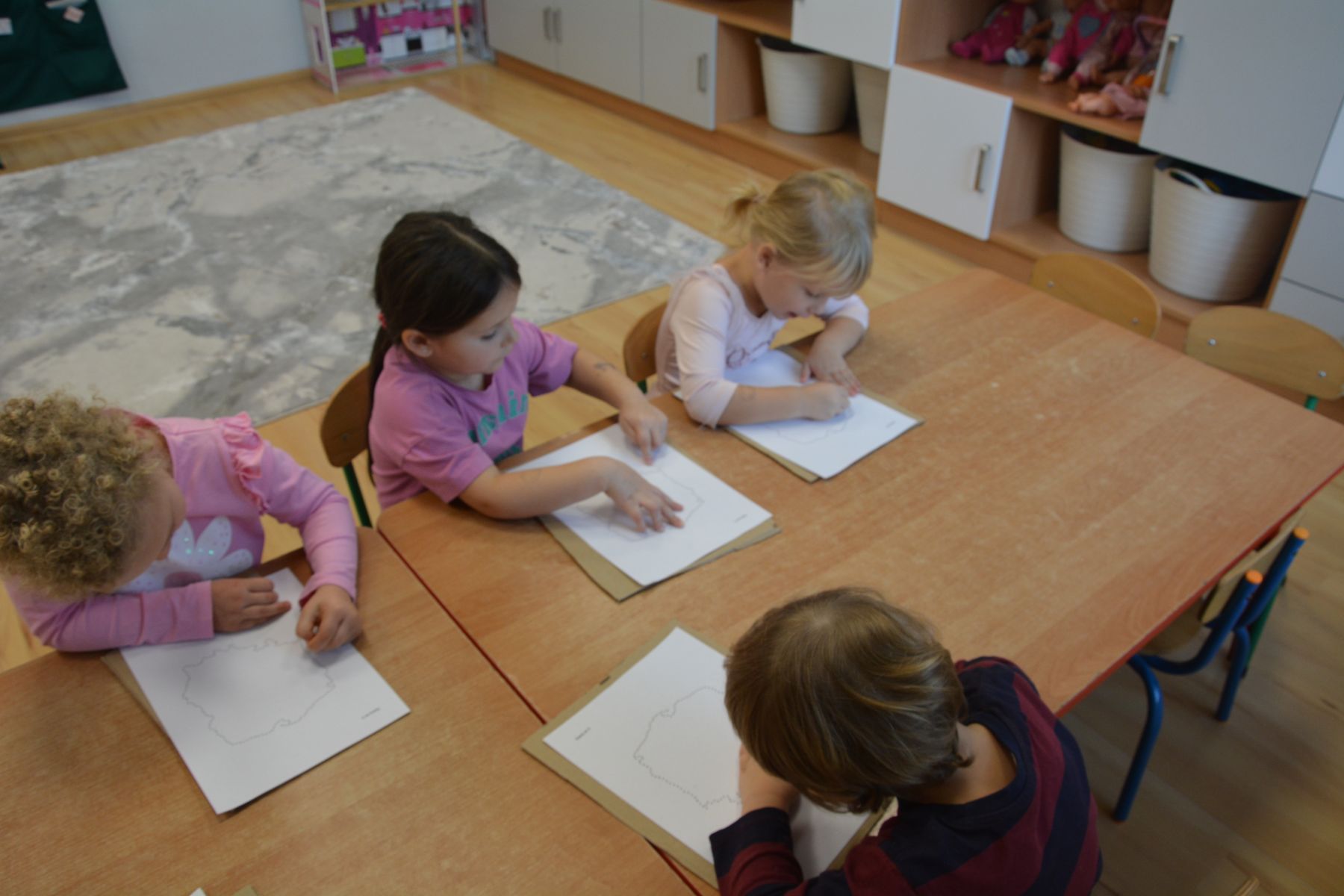 Zadaniem dzieci było nakłuwanie każdej kropki z konturu Mapy Polski. Oczywiście przypomniane były dzieciom zasady bezpieczeństwa, gdyż pinezki są