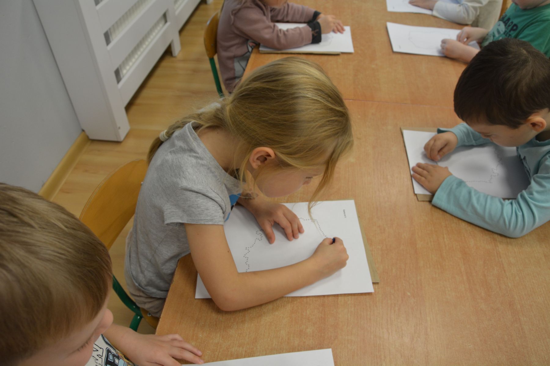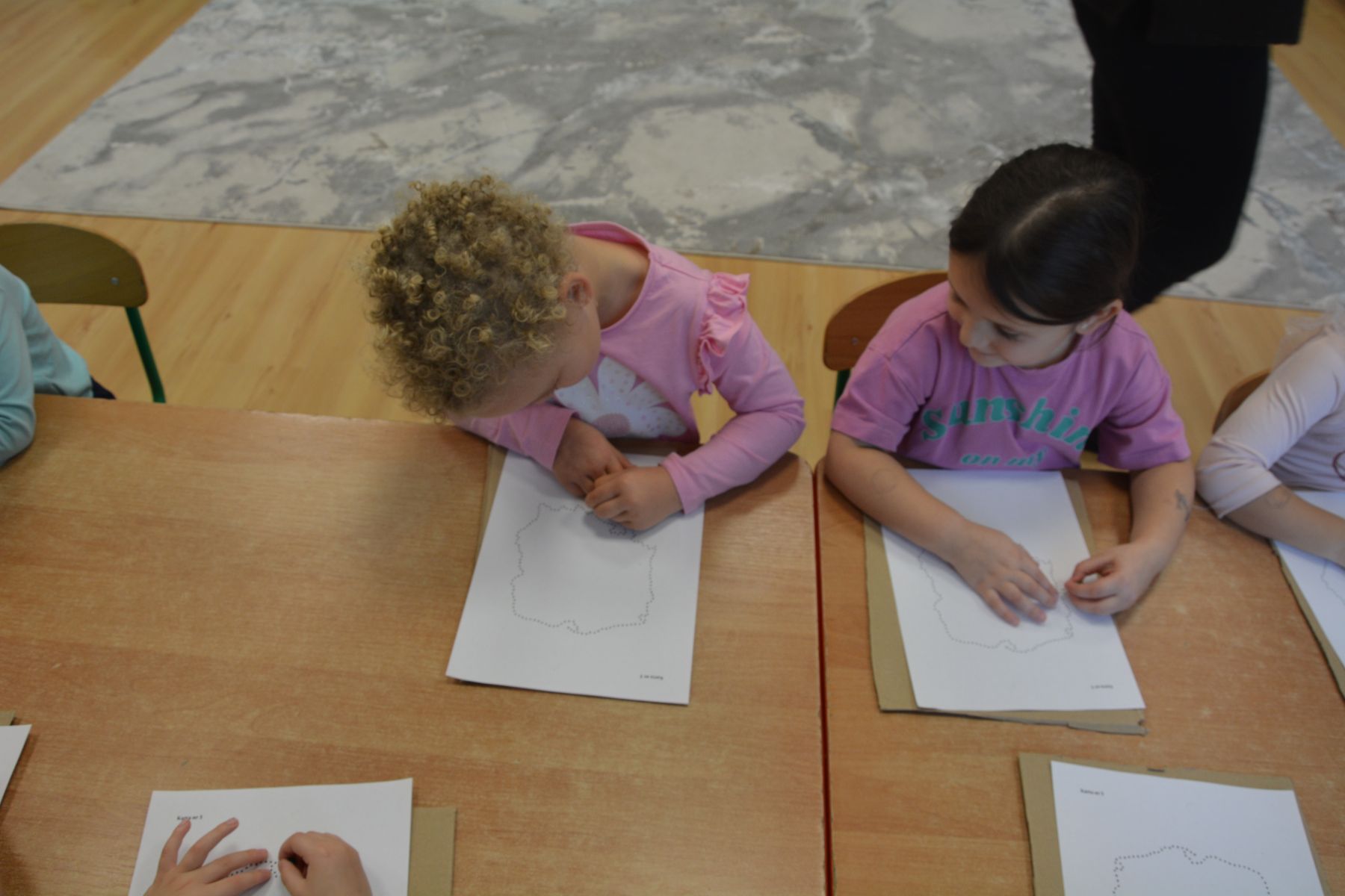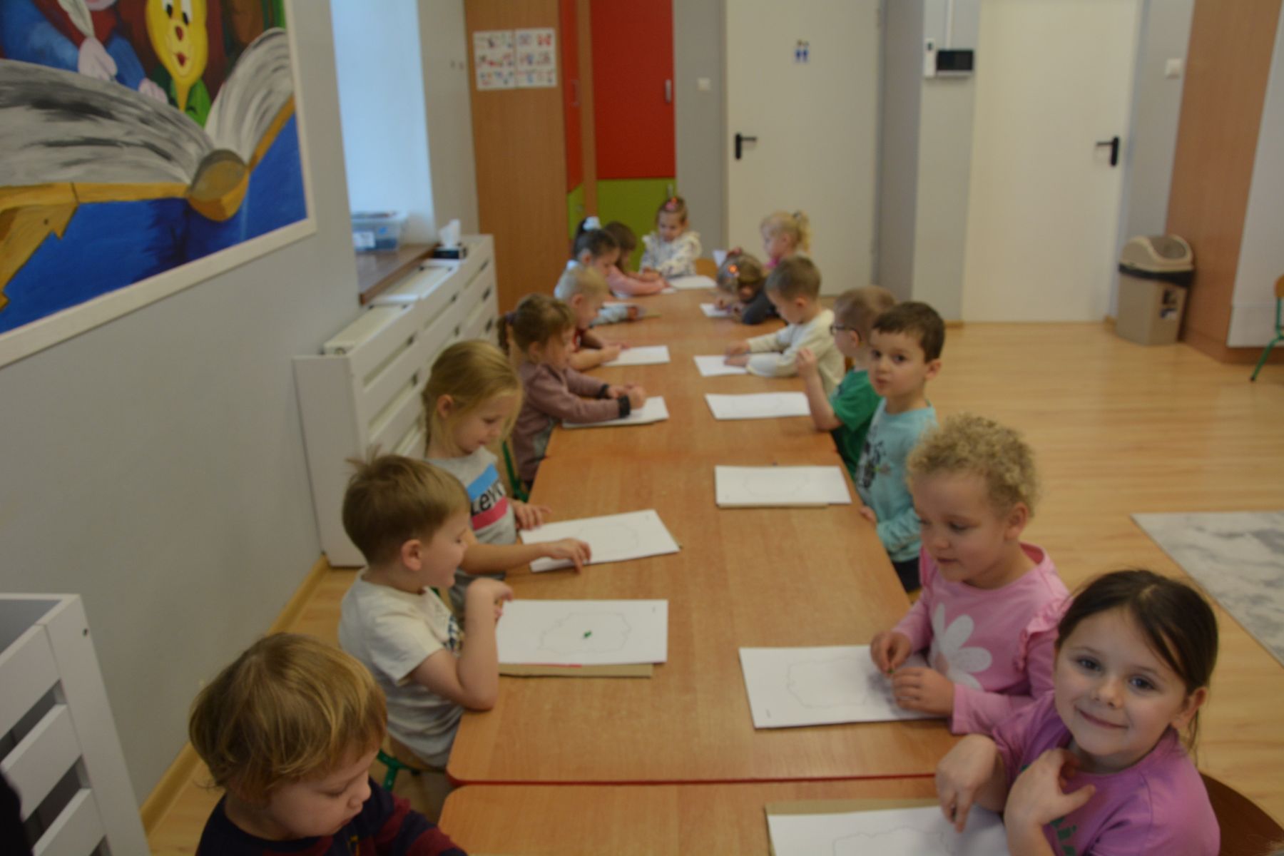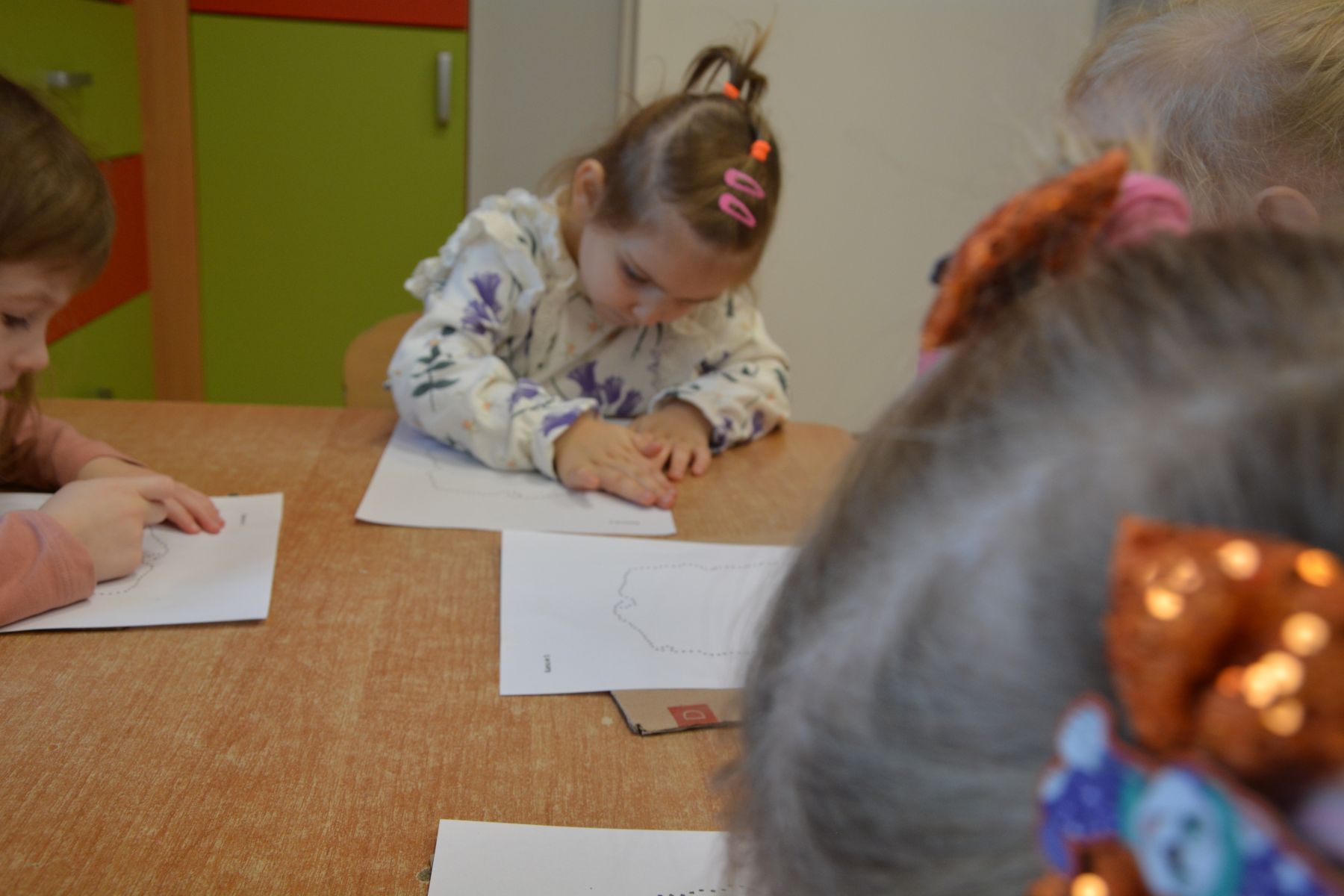 Zadaniem dzieci było nakłuwanie każdej kropki z konturu Mapy Polski. Oczywiście przypomniane były dzieciom zasady bezpieczeństwa, gdyż pinezki są