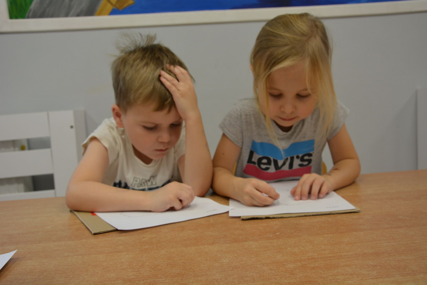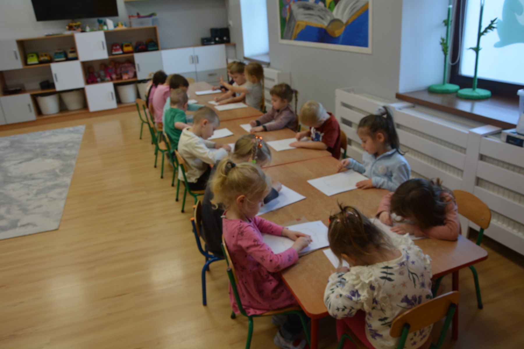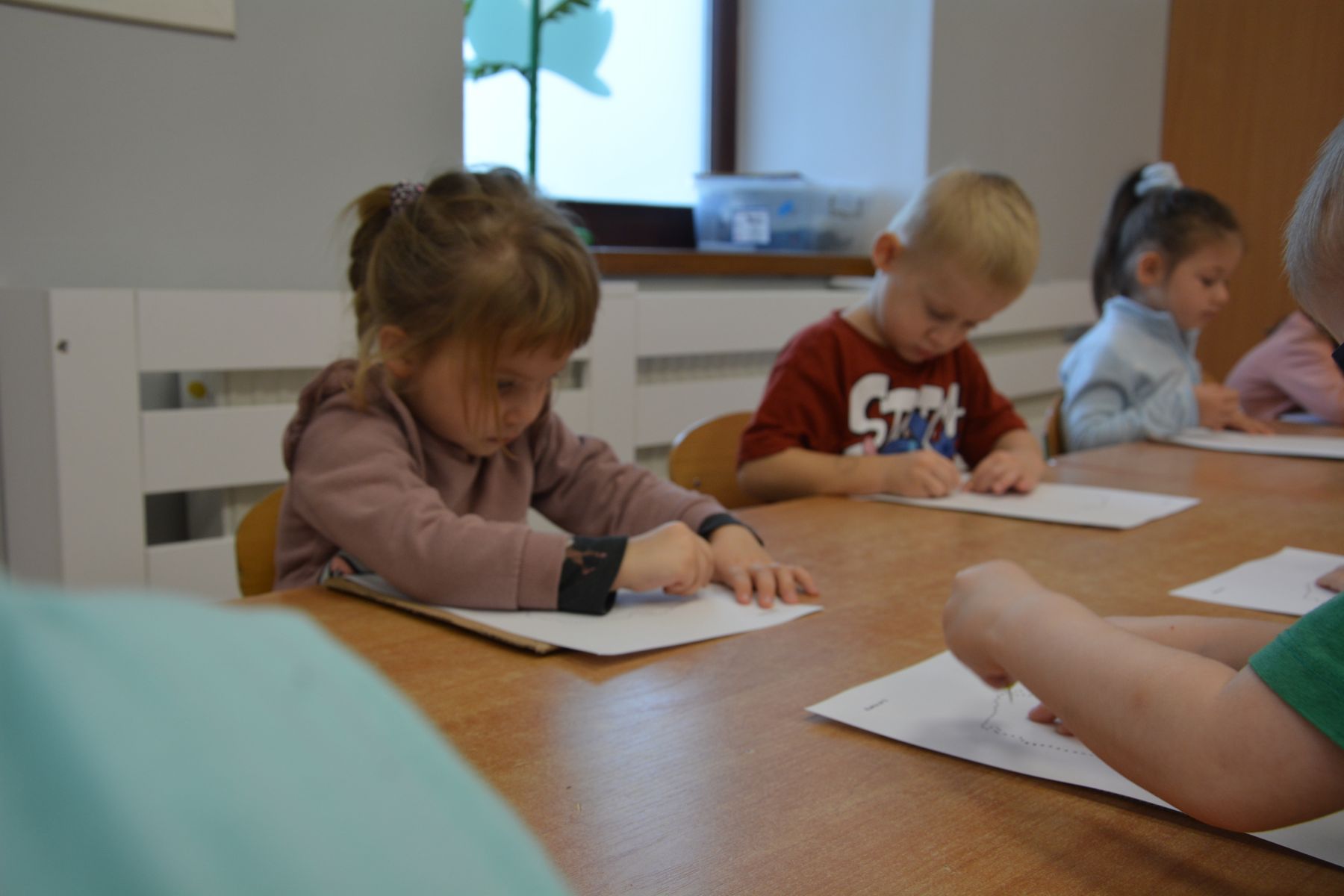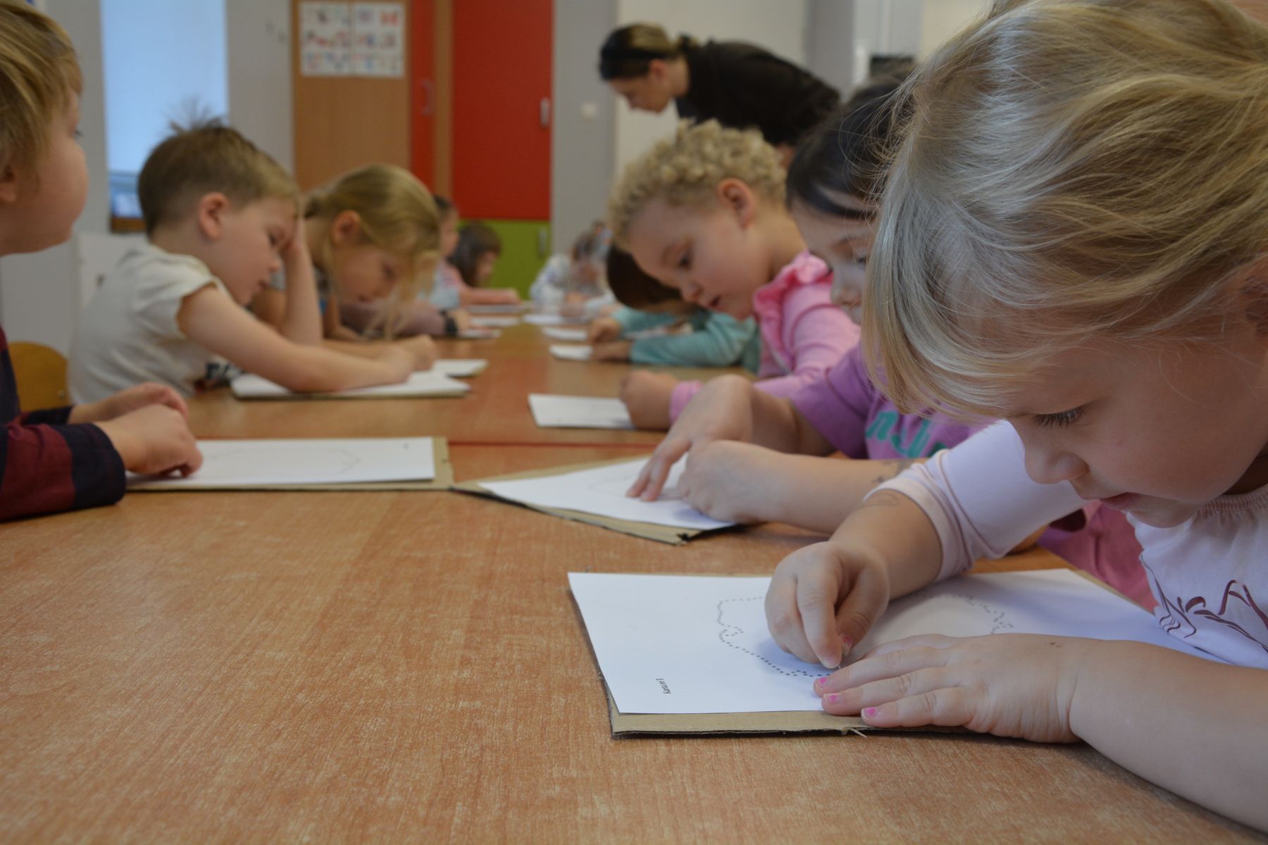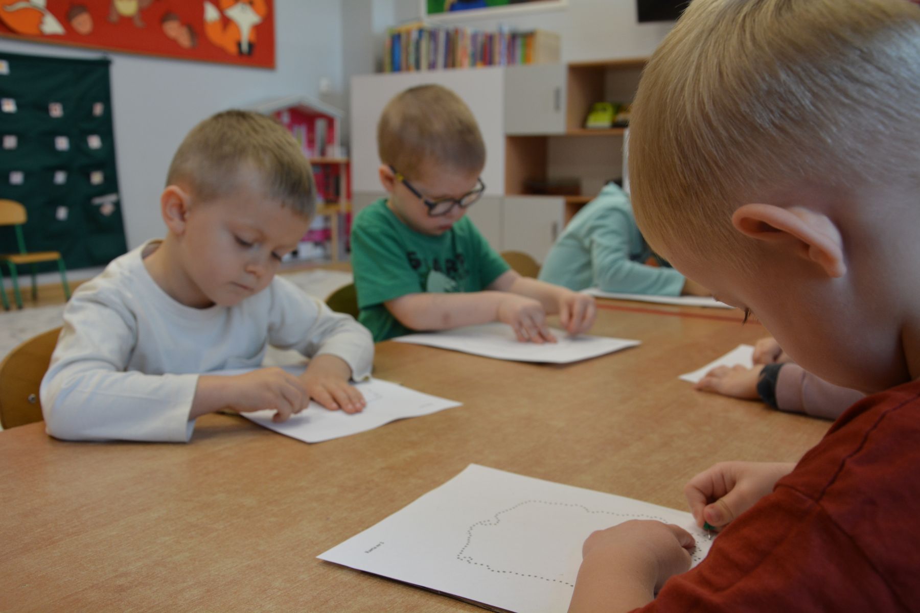 Zadaniem dzieci było nakłuwanie każdej kropki z konturu Mapy Polski. Oczywiście przypomniane były dzieciom zasady bezpieczeństwa, gdyż pinezki są