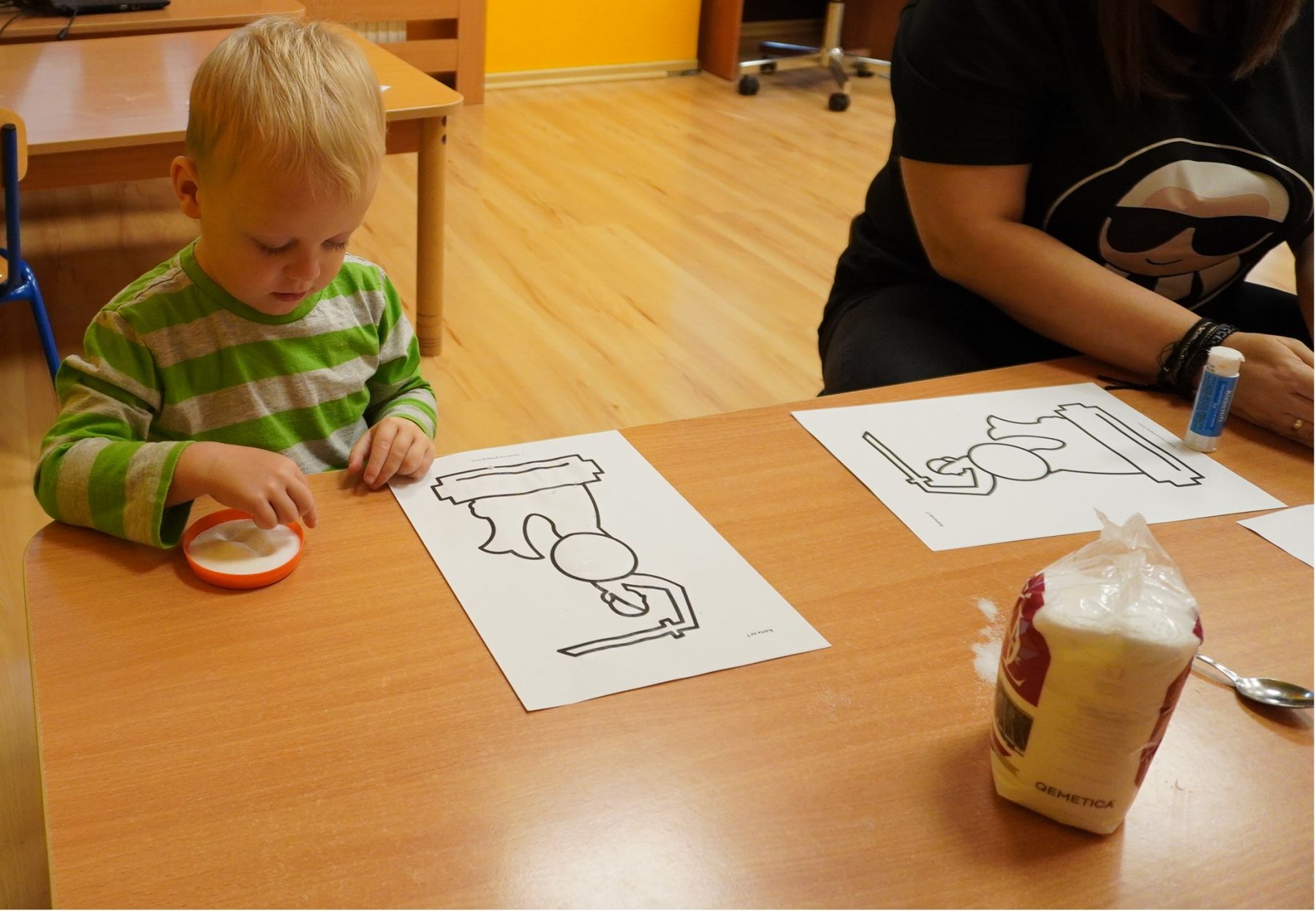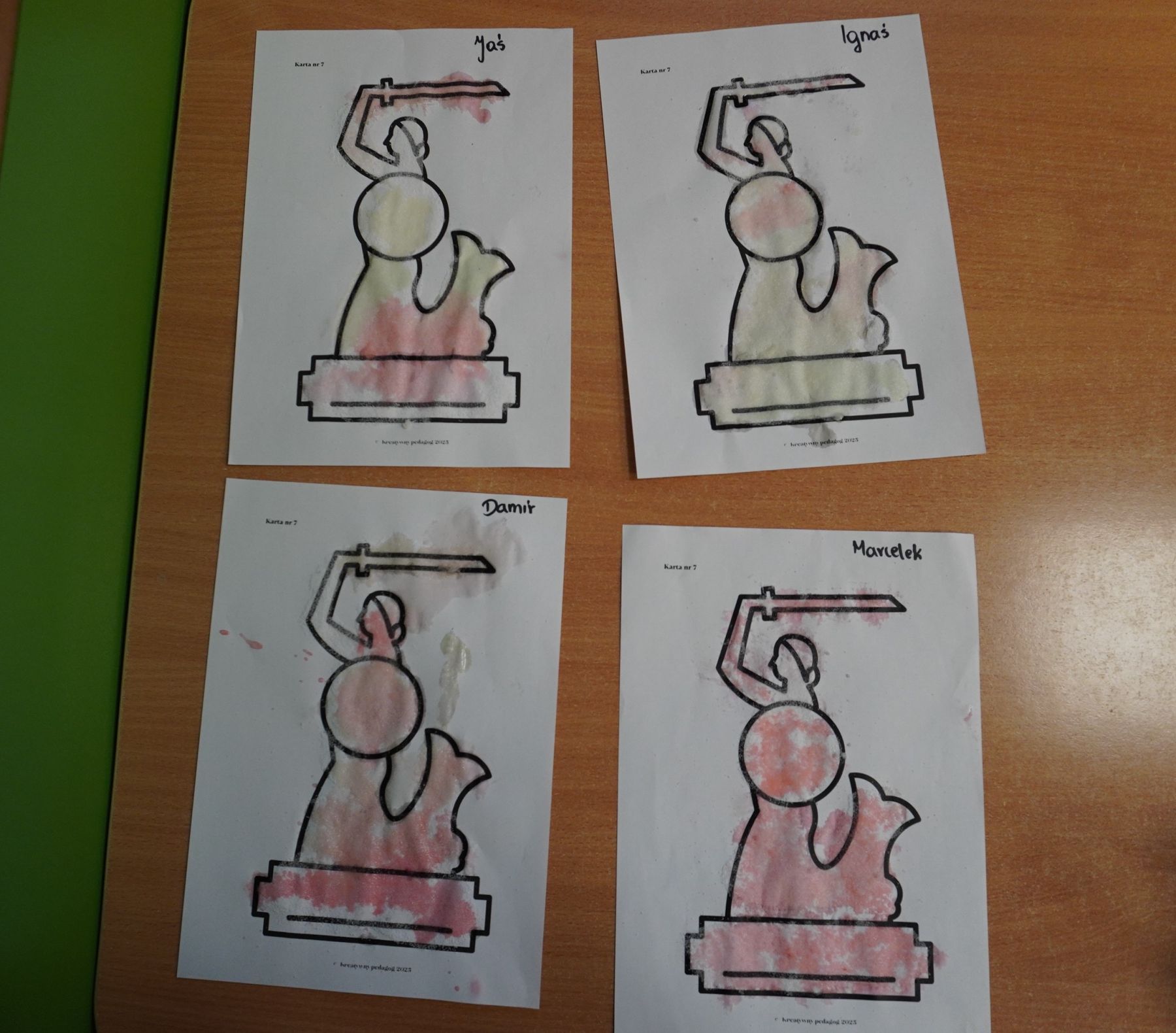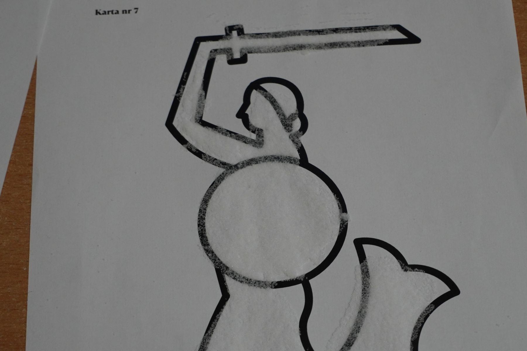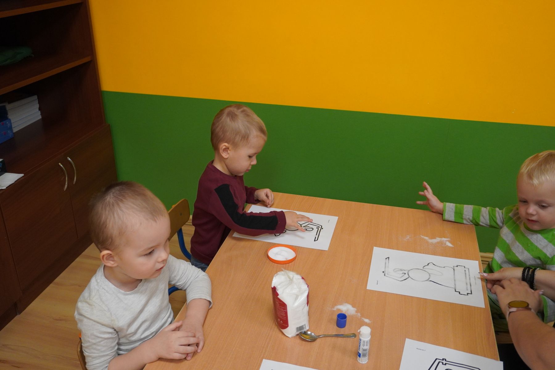 Zadaniem dzieci było obsypanie solą szablonu Syrenki Warszawskiej a następnie po wyschnięciu - pomalowanie jej farbami.