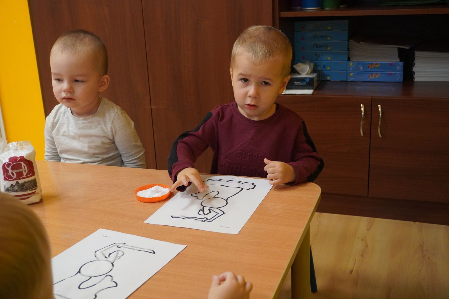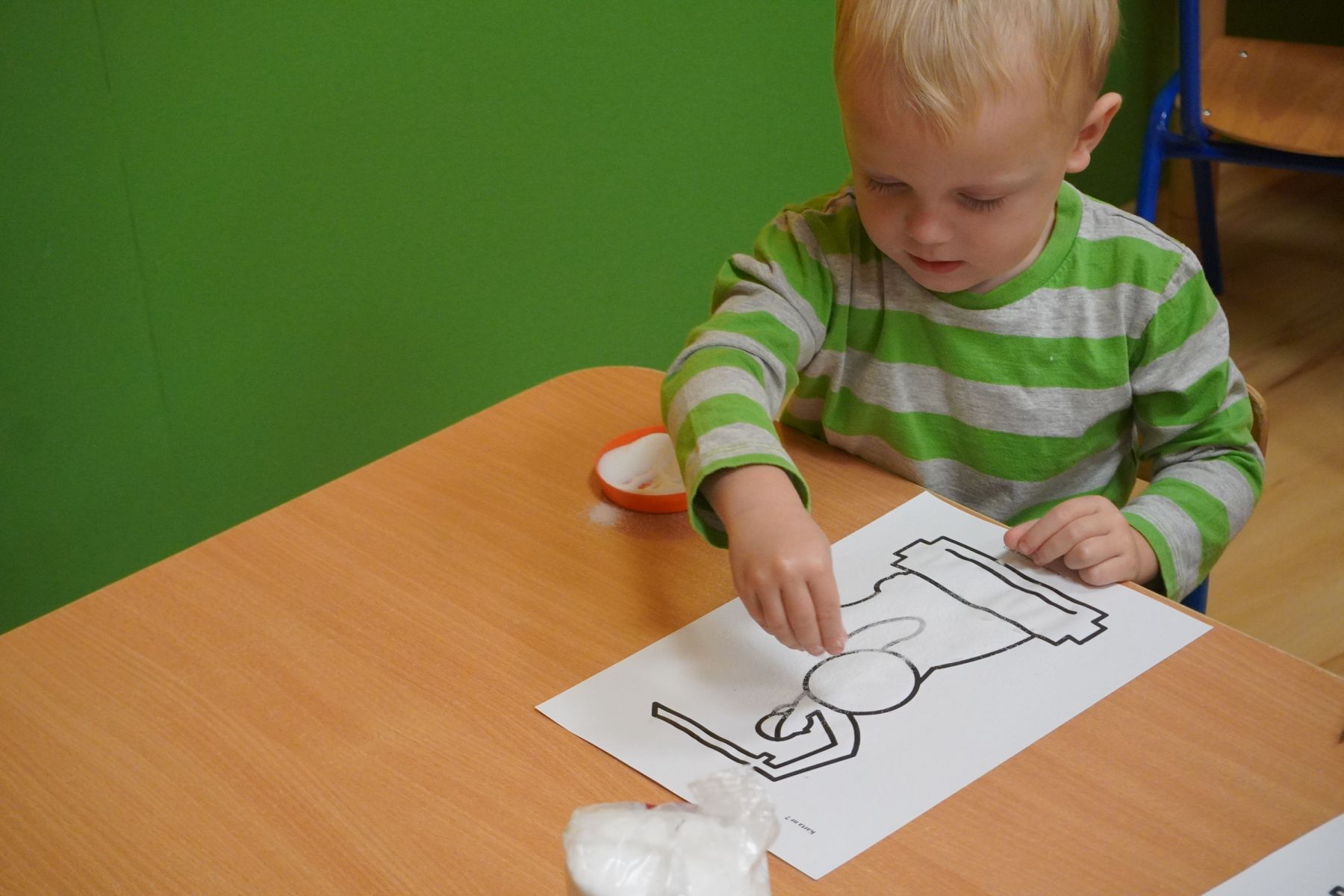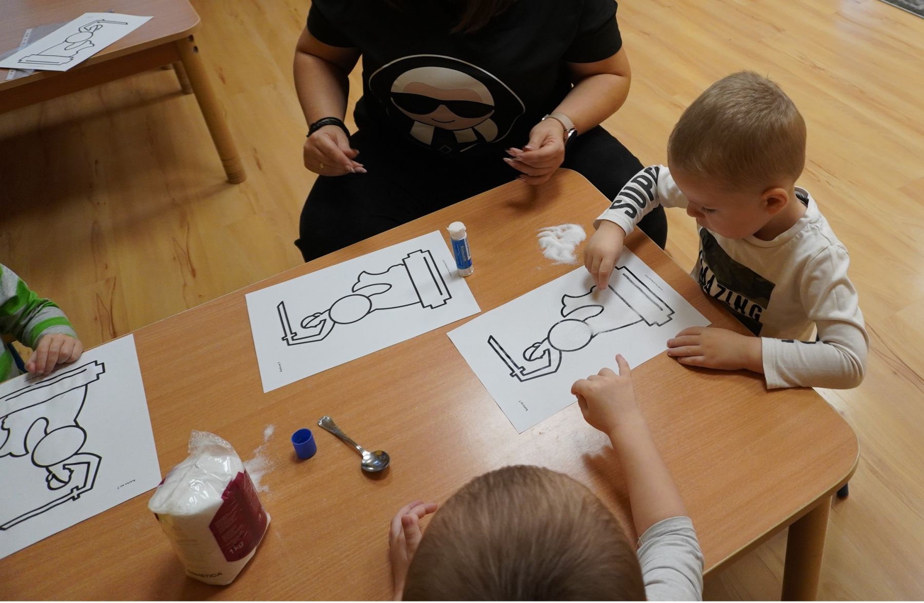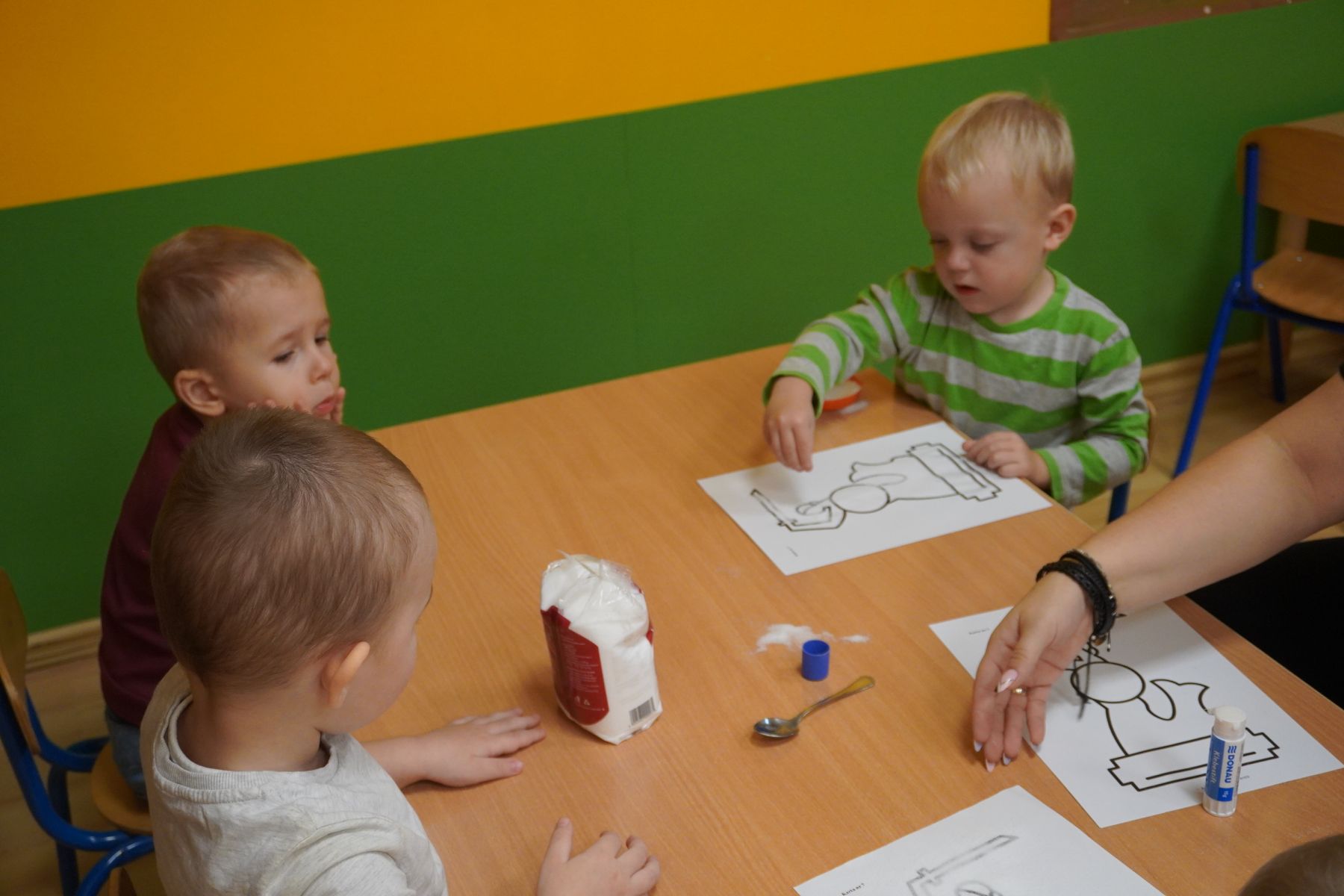 Zadaniem dzieci było obsypanie solą szablonu Syrenki Warszawskiej a następnie po wyschnięciu - pomalowanie jej farbami.