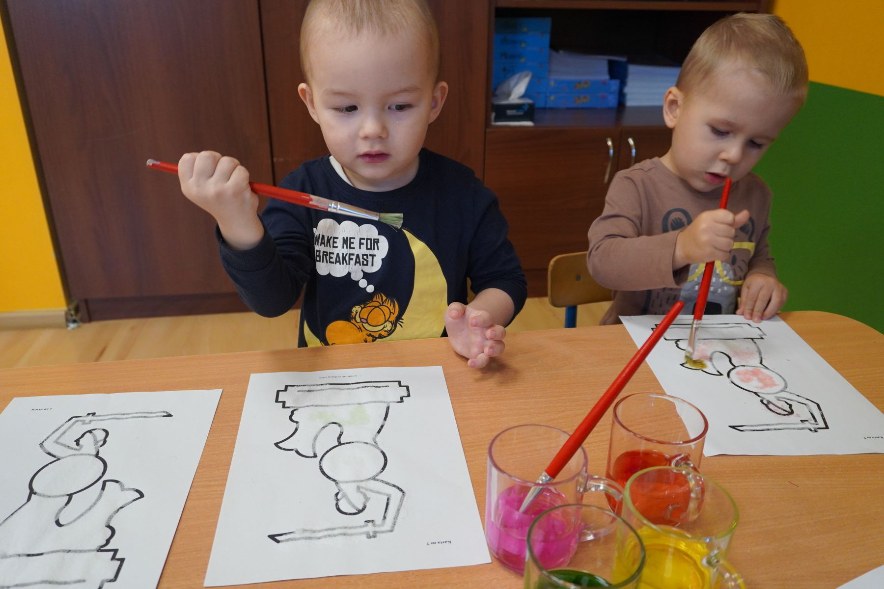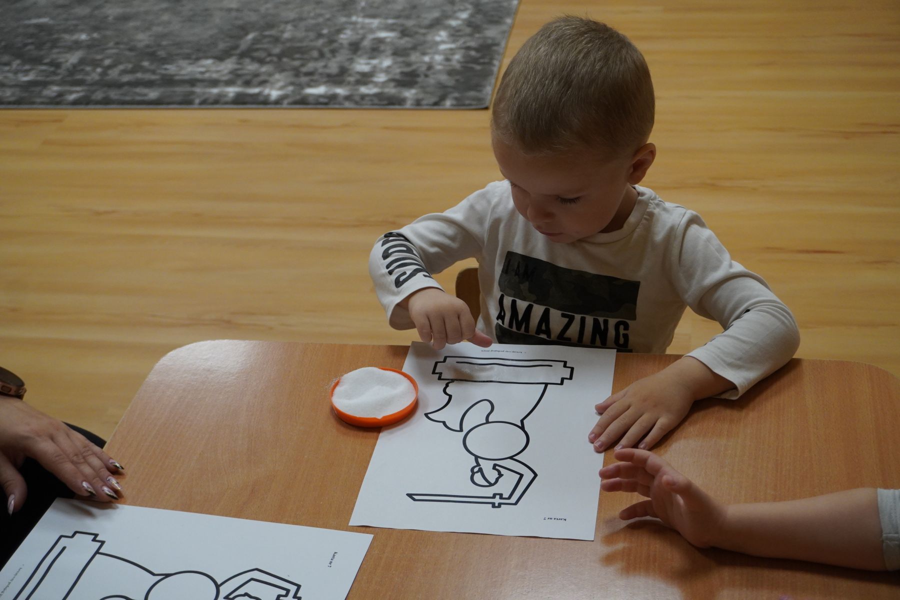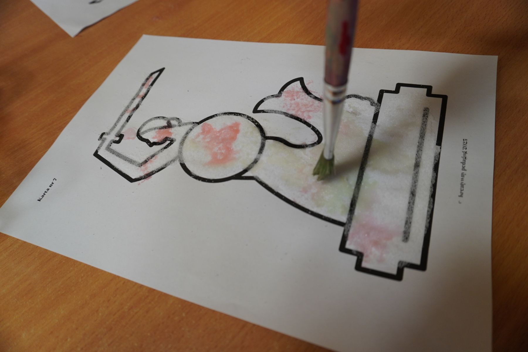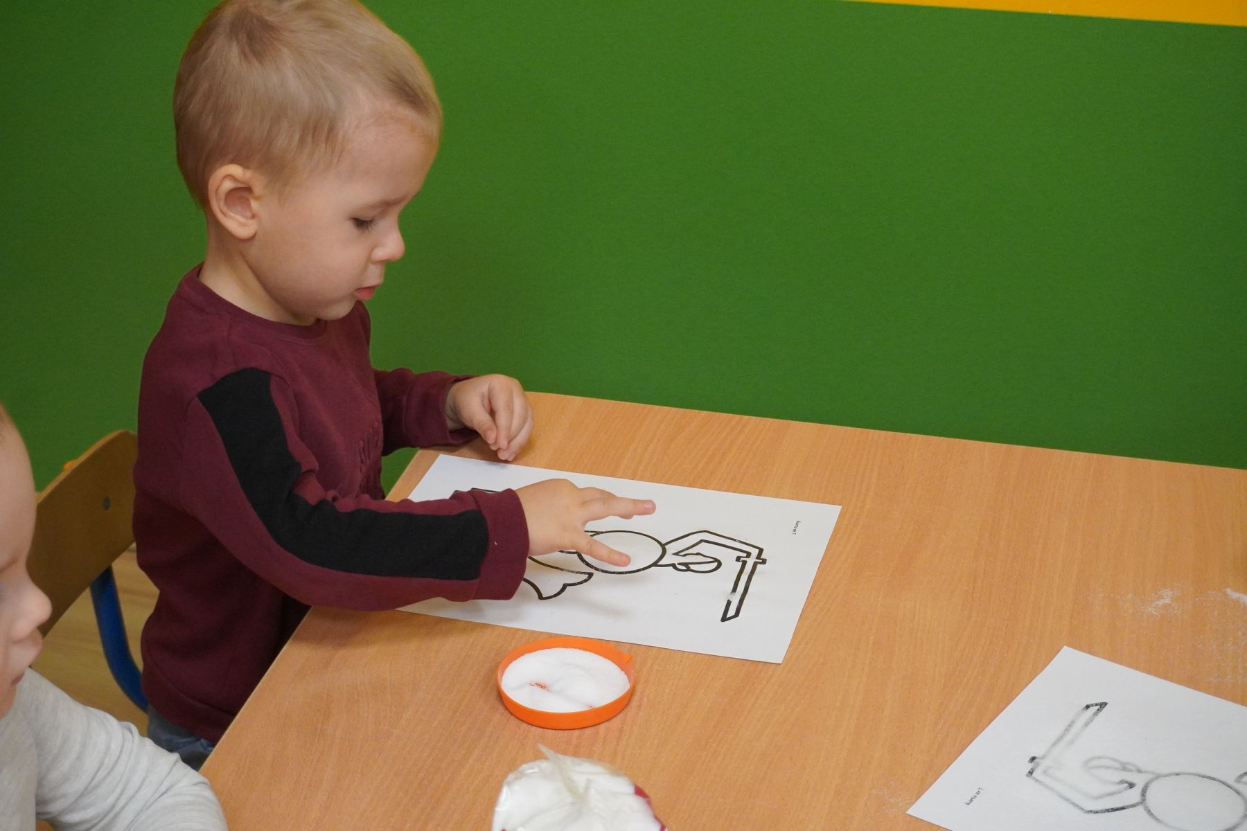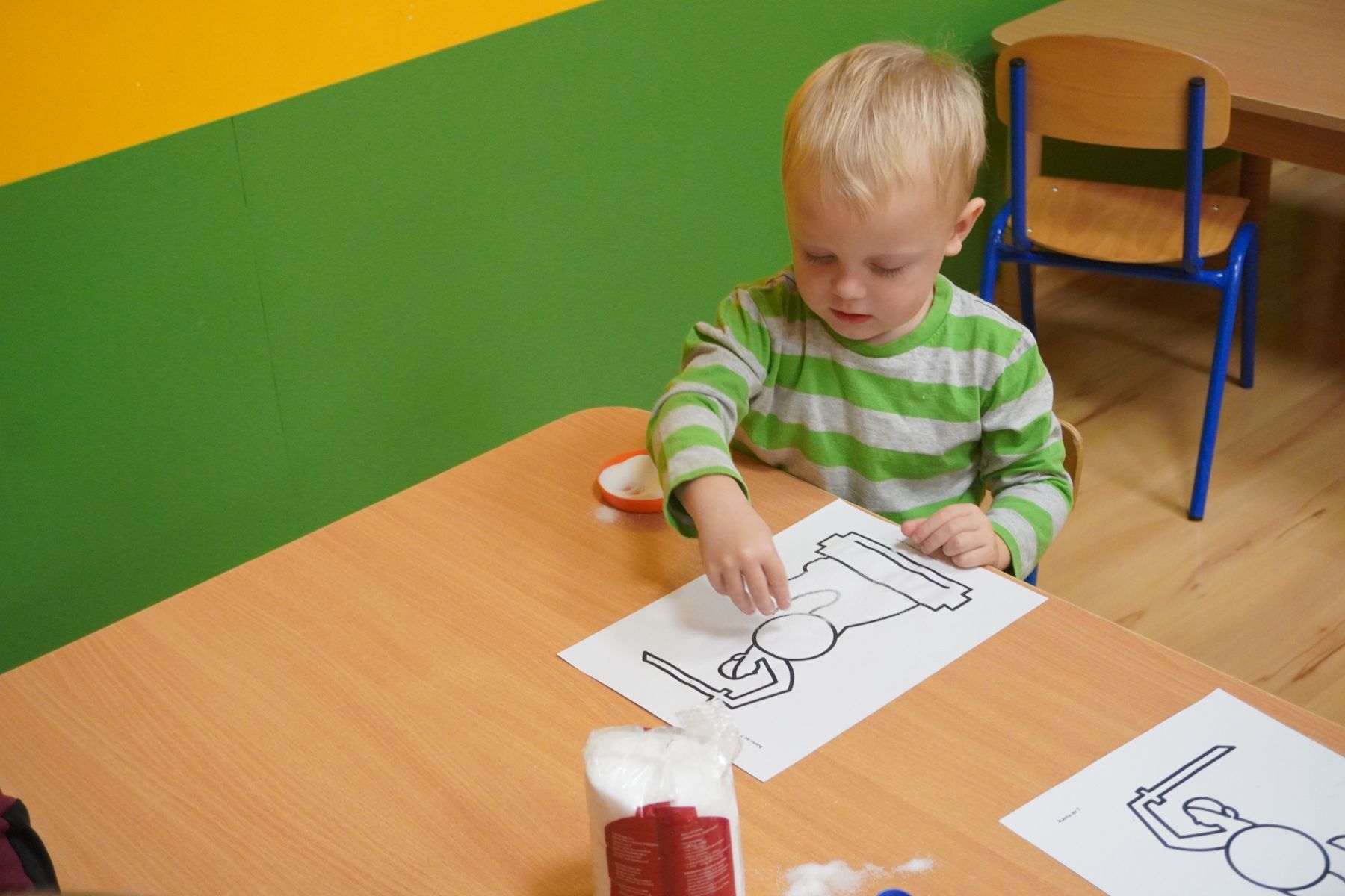 Zadaniem dzieci było obsypanie solą szablonu Syrenki Warszawskiej a następnie po wyschnięciu - pomalowanie jej farbami.