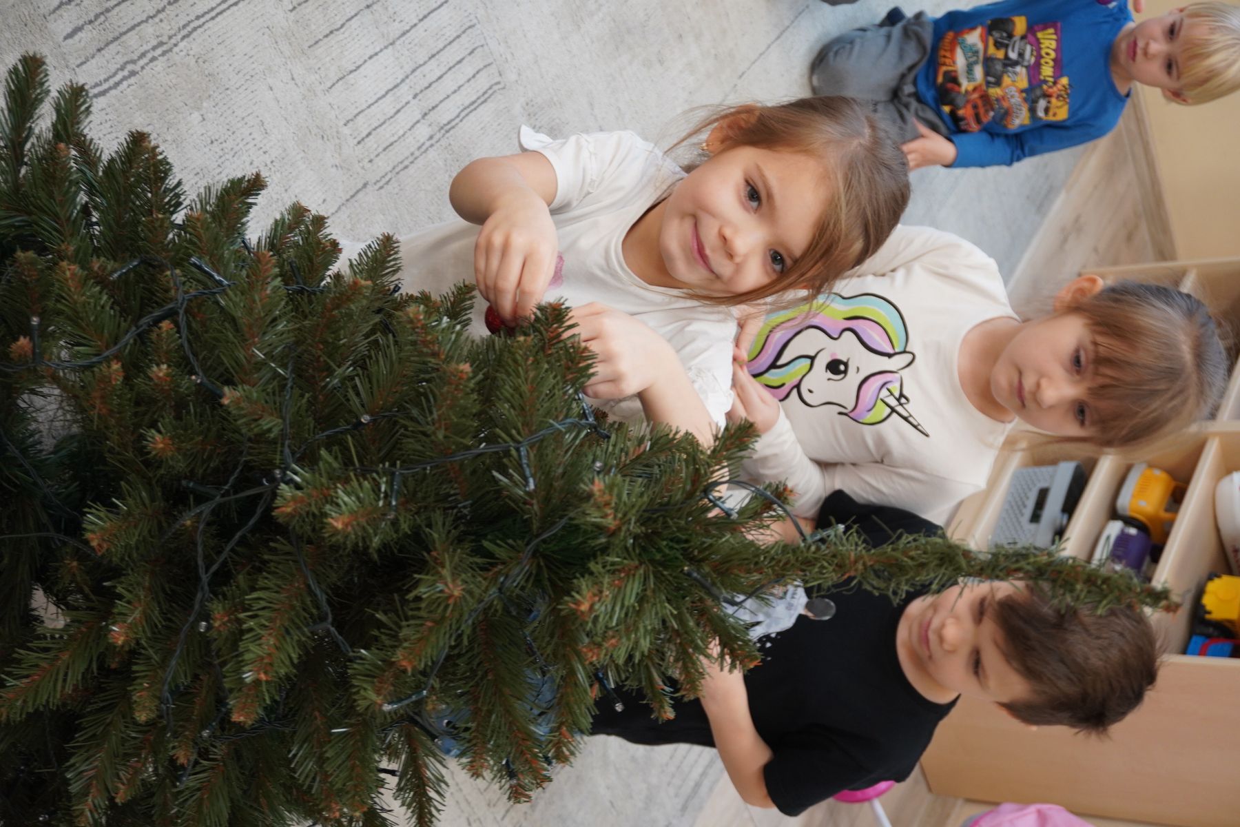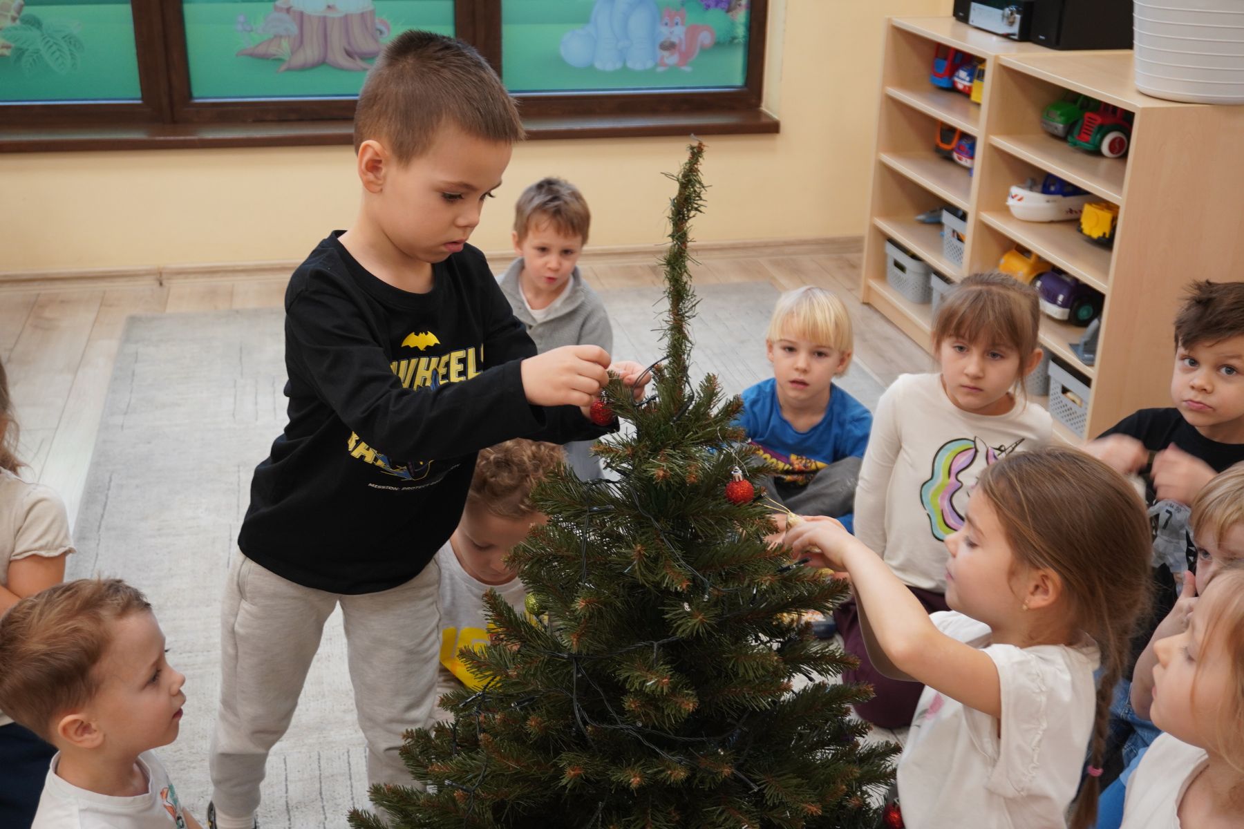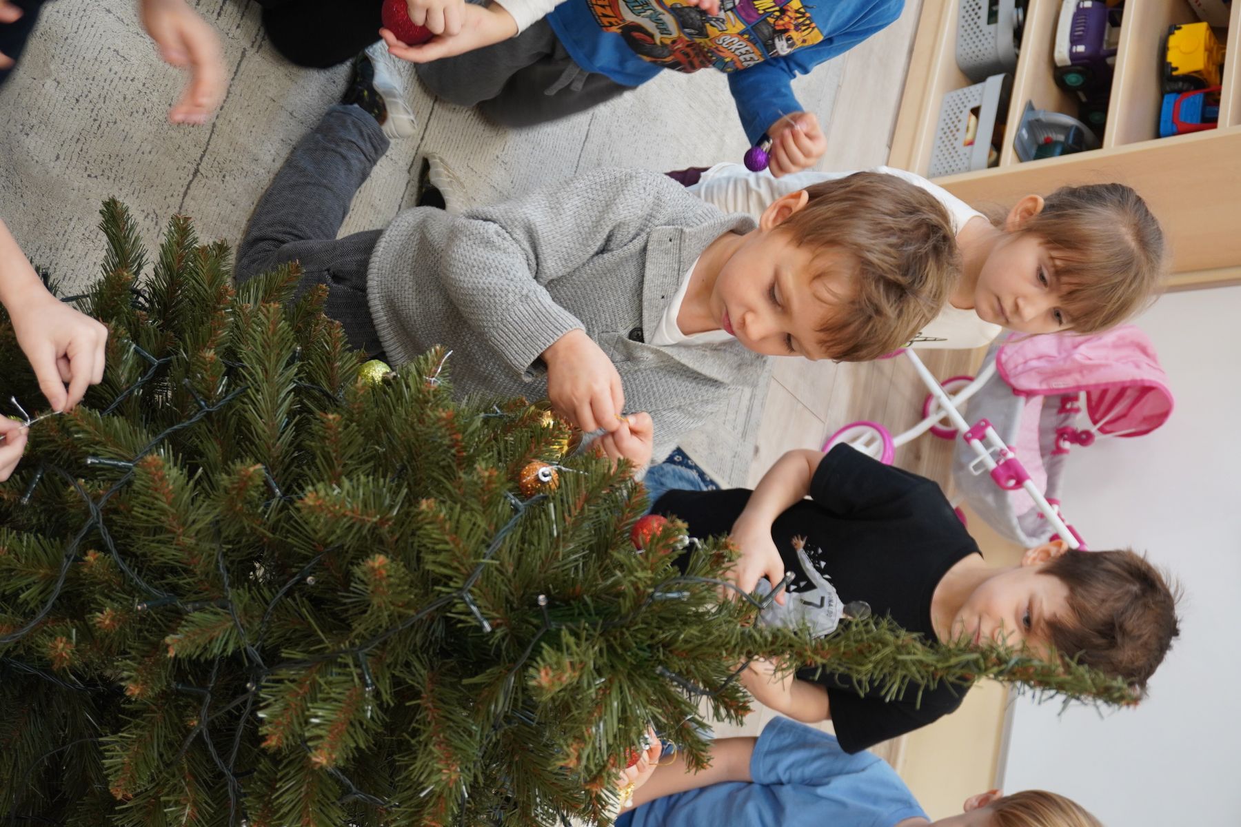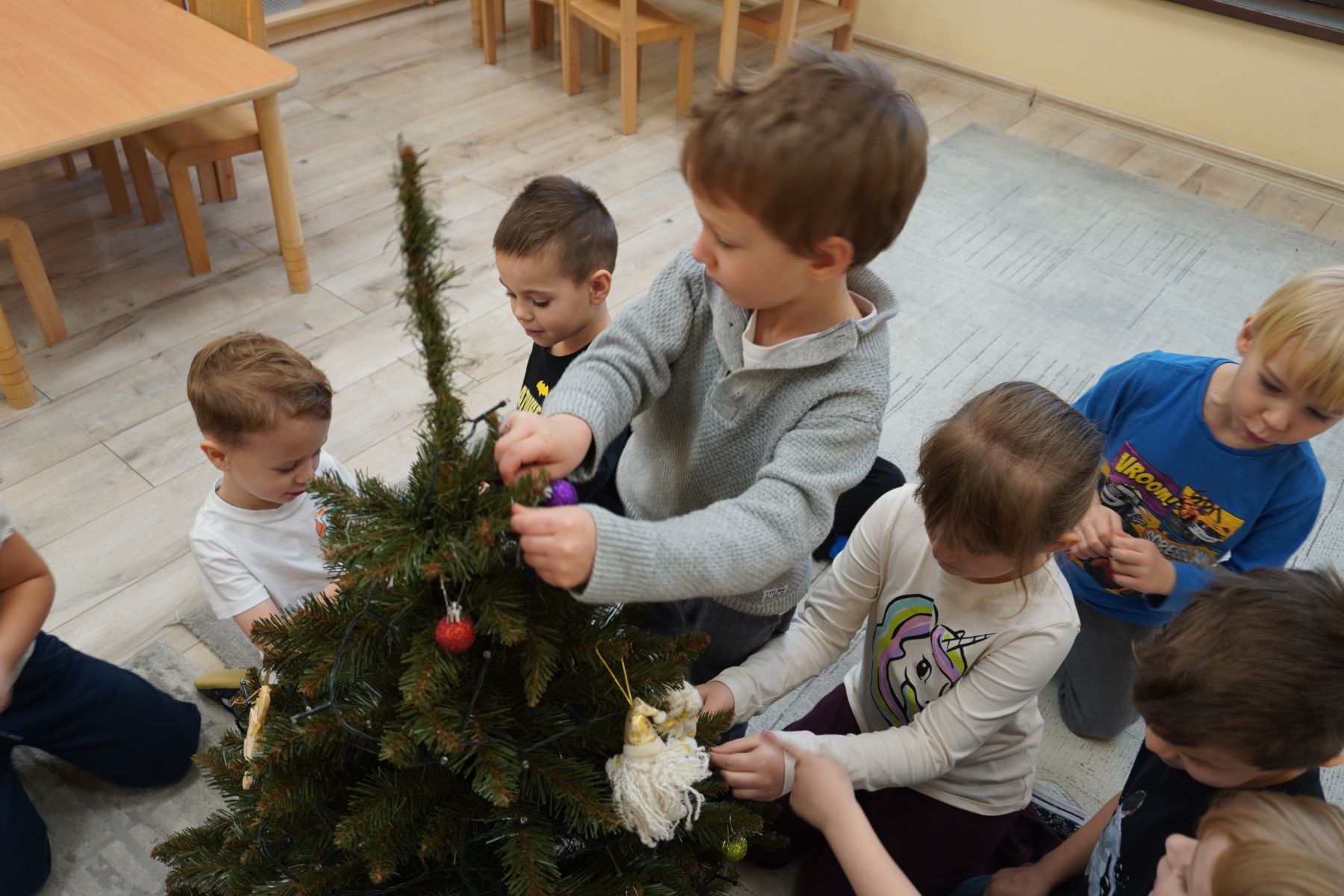 Dzieci z grupy Smerfy z radością przygotowały się do udekorowania choinki. Każde dziecko wybrało swoją ozdobę i z uśmiechem zawiesiło ją na gałązkach. Jedni wieszali bombki wysoko, inni nisko, tak aby cała choinka była pięknie przystrojona. W tle słychać było wesołą świąteczną muzykę, a w powietrzu unosiła się atmosfera radości i oczekiwania.