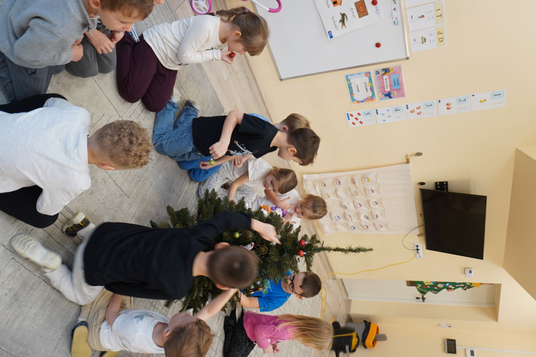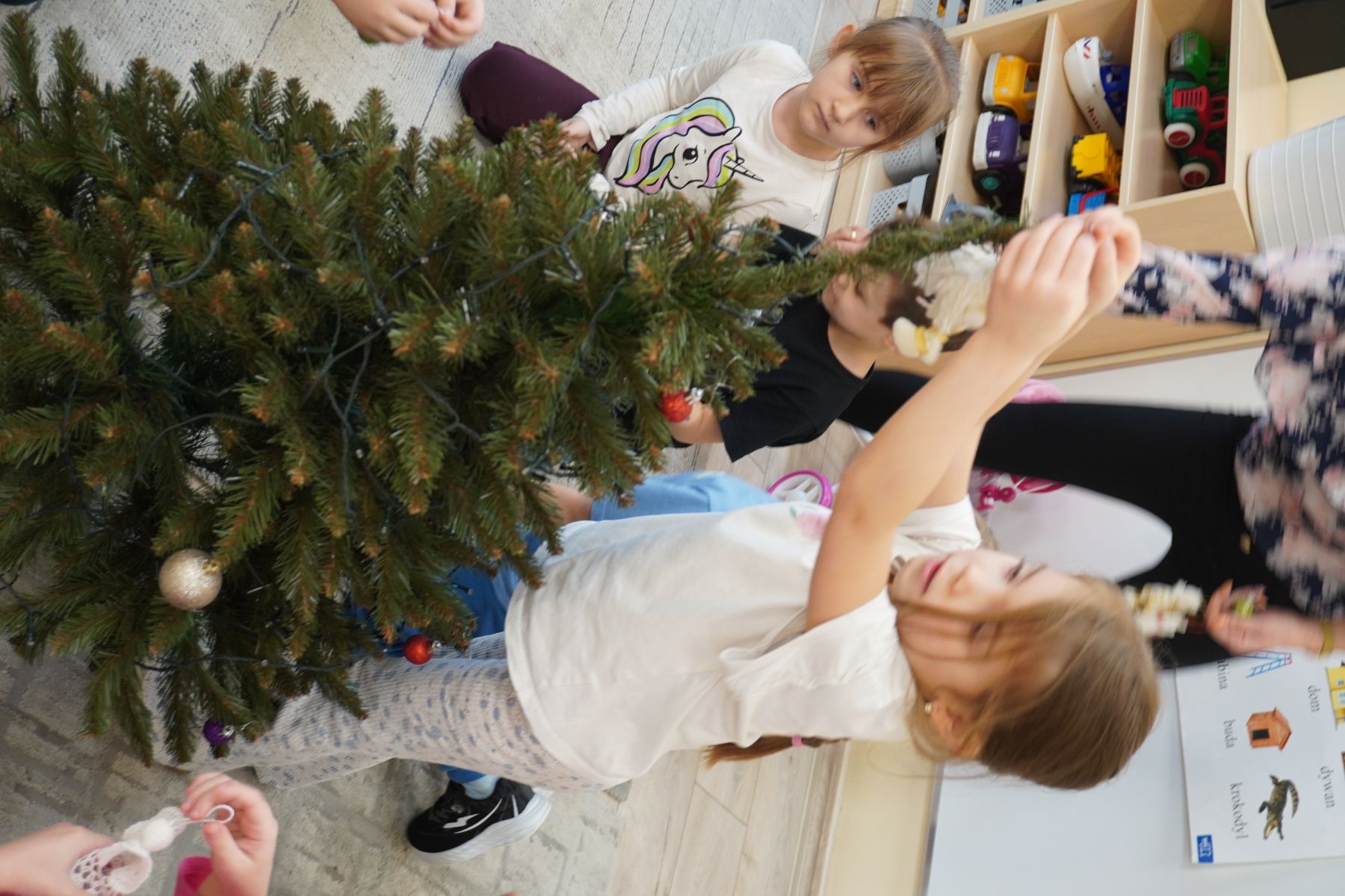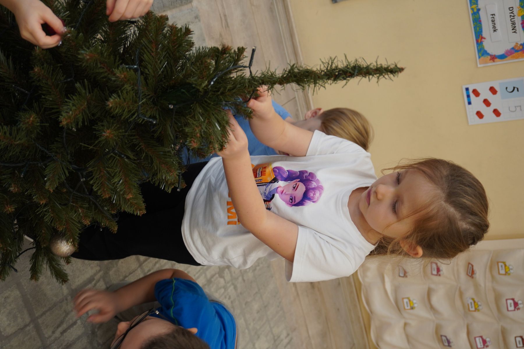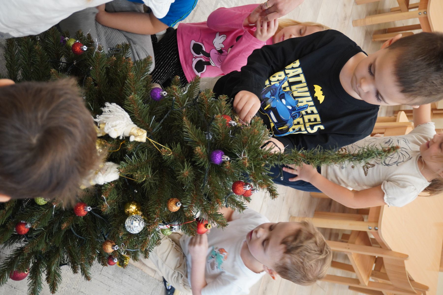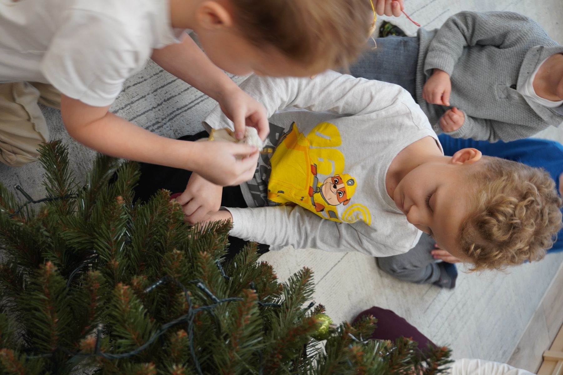 Dzieci z grupy Smerfy z radością przygotowały się do udekorowania choinki. Każde dziecko wybrało swoją ozdobę i z uśmiechem zawiesiło ją na gałązkach. Jedni wieszali bombki wysoko, inni nisko, tak aby cała choinka była pięknie przystrojona. W tle słychać było wesołą świąteczną muzykę, a w powietrzu unosiła się atmosfera radości i oczekiwania.