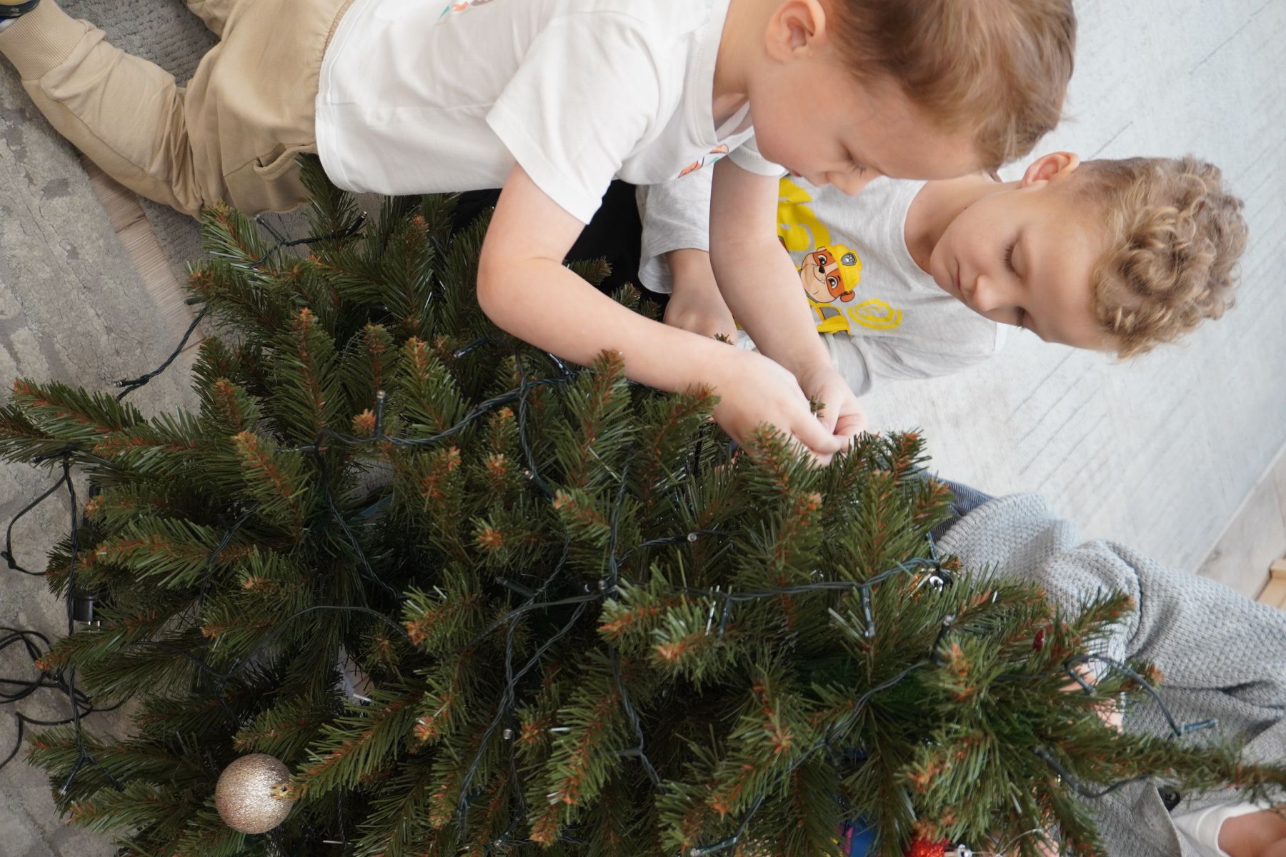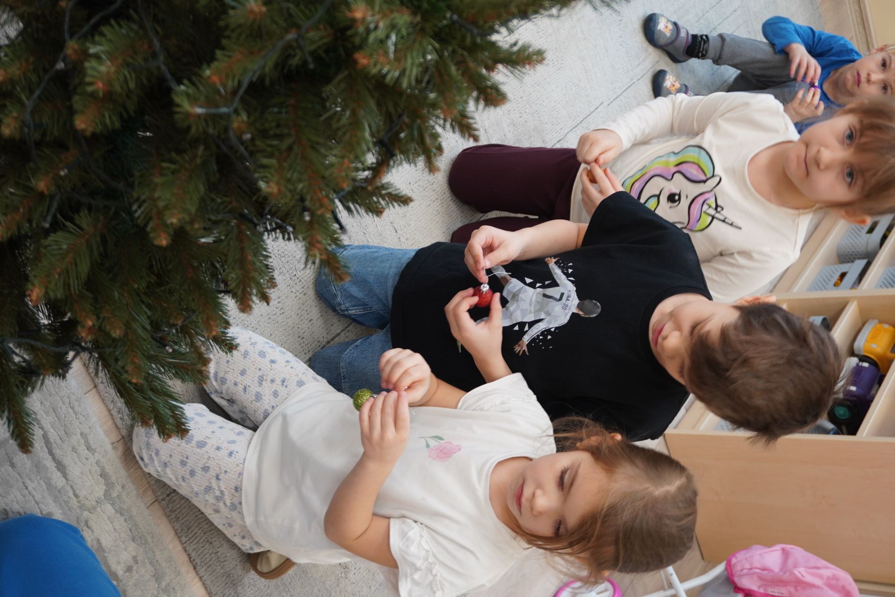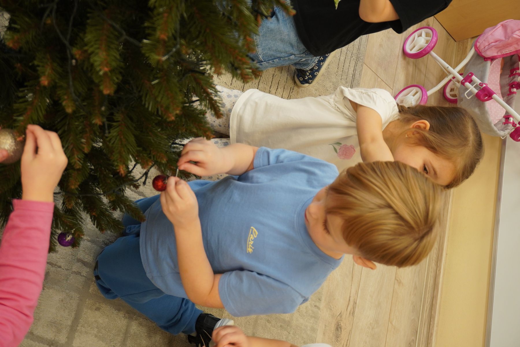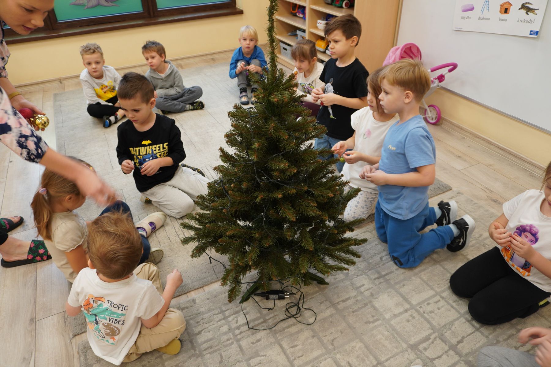 Dzieci z grupy Smerfy z radością przygotowały się do udekorowania choinki. Każde dziecko wybrało swoją ozdobę i z uśmiechem zawiesiło ją na gałązkach. Jedni wieszali bombki wysoko, inni nisko, tak aby cała choinka była pięknie przystrojona. W tle słychać było wesołą świąteczną muzykę, a w powietrzu unosiła się atmosfera radości i oczekiwania.