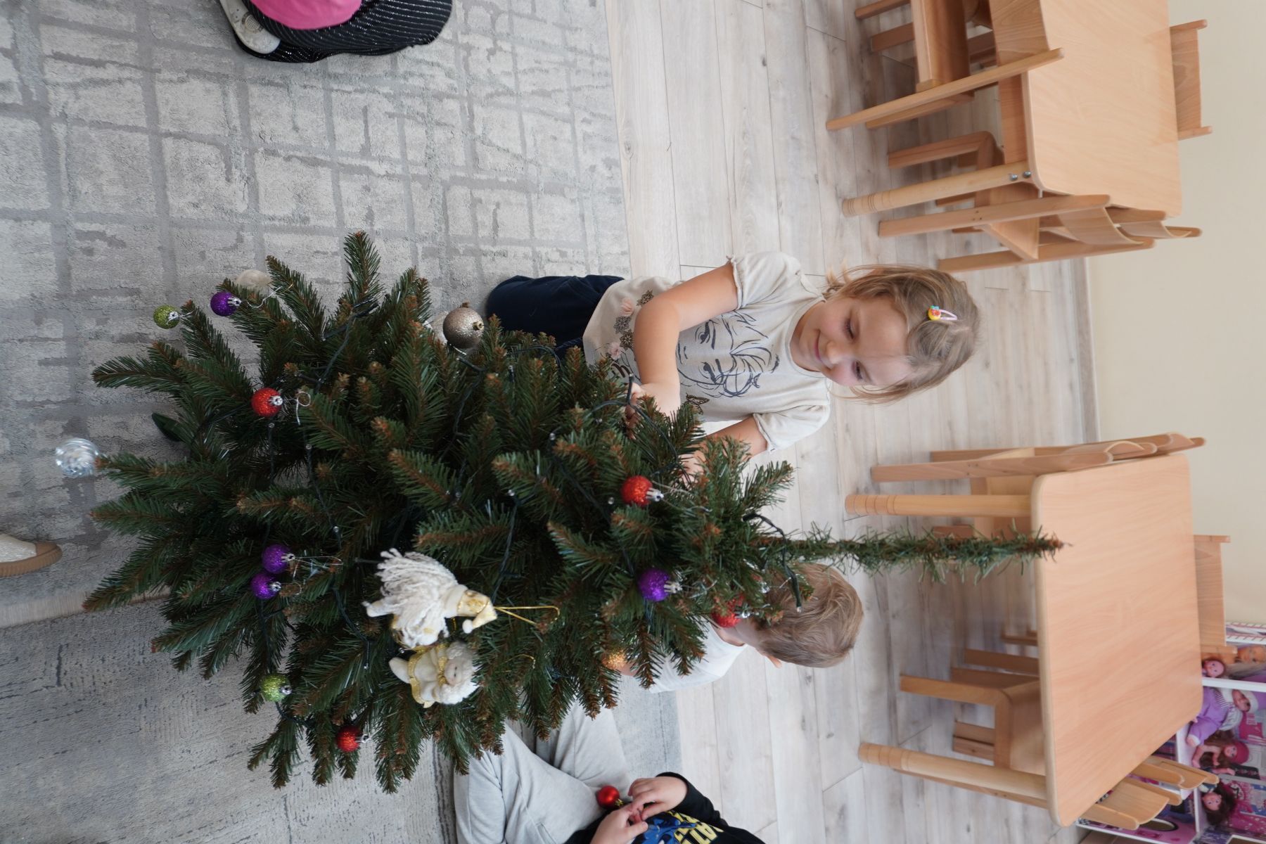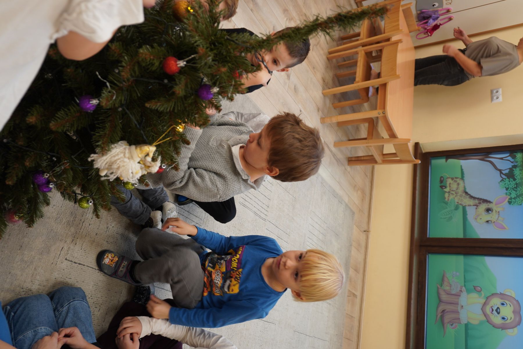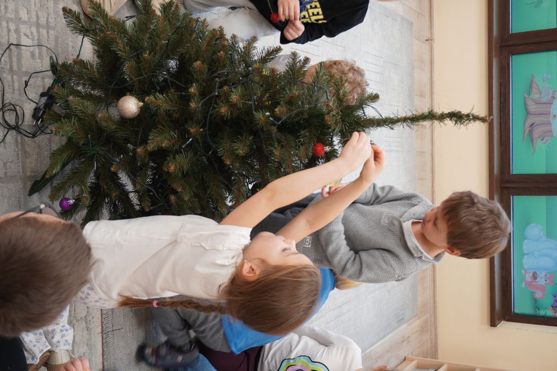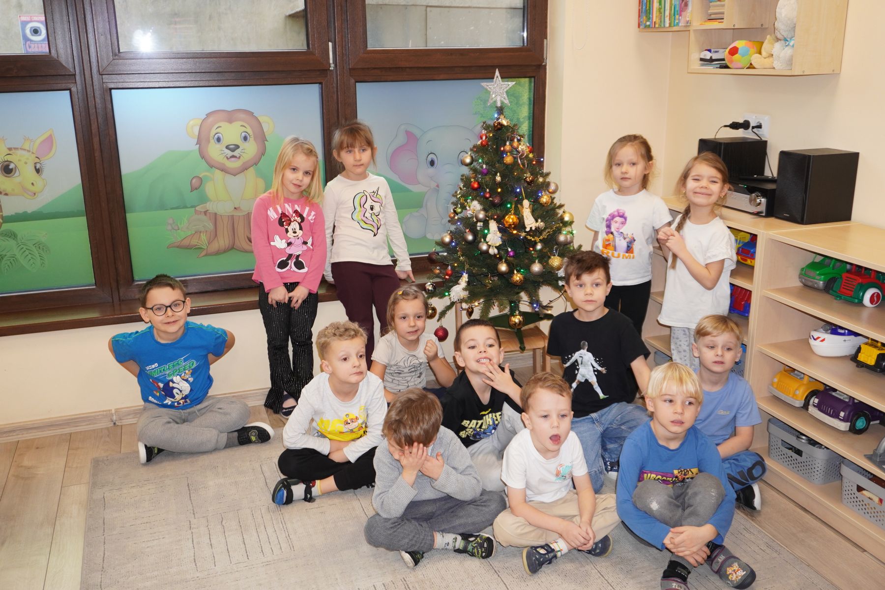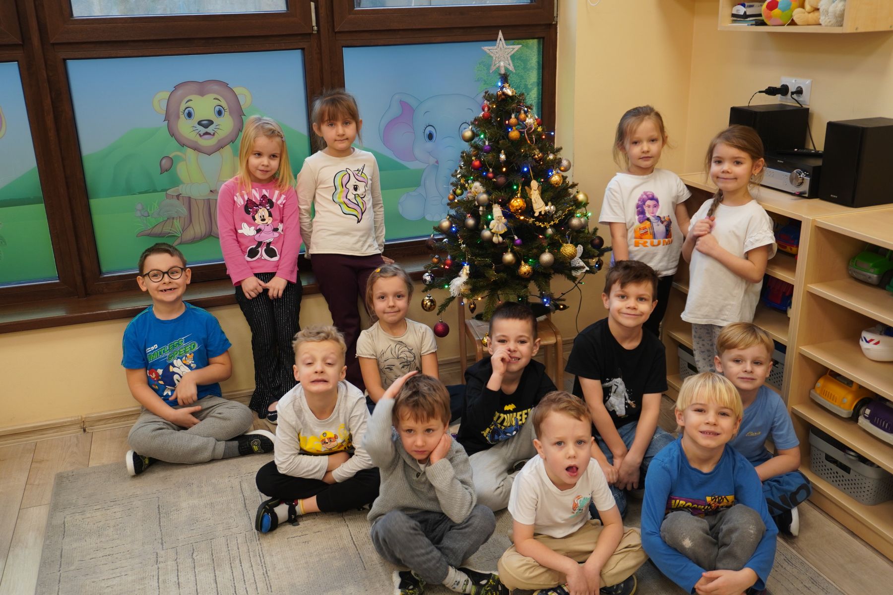 Dzieci z grupy Smerfy z radością przygotowały się do udekorowania choinki. Każde dziecko wybrało swoją ozdobę i z uśmiechem zawiesiło ją na gałązkach. Jedni wieszali bombki wysoko, inni nisko, tak aby cała choinka była pięknie przystrojona. W tle słychać było wesołą świąteczną muzykę, a w powietrzu unosiła się atmosfera radości i oczekiwania.