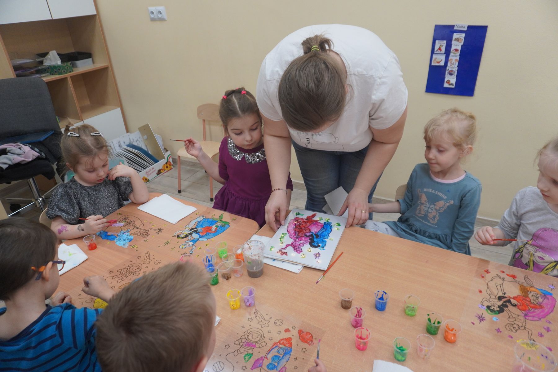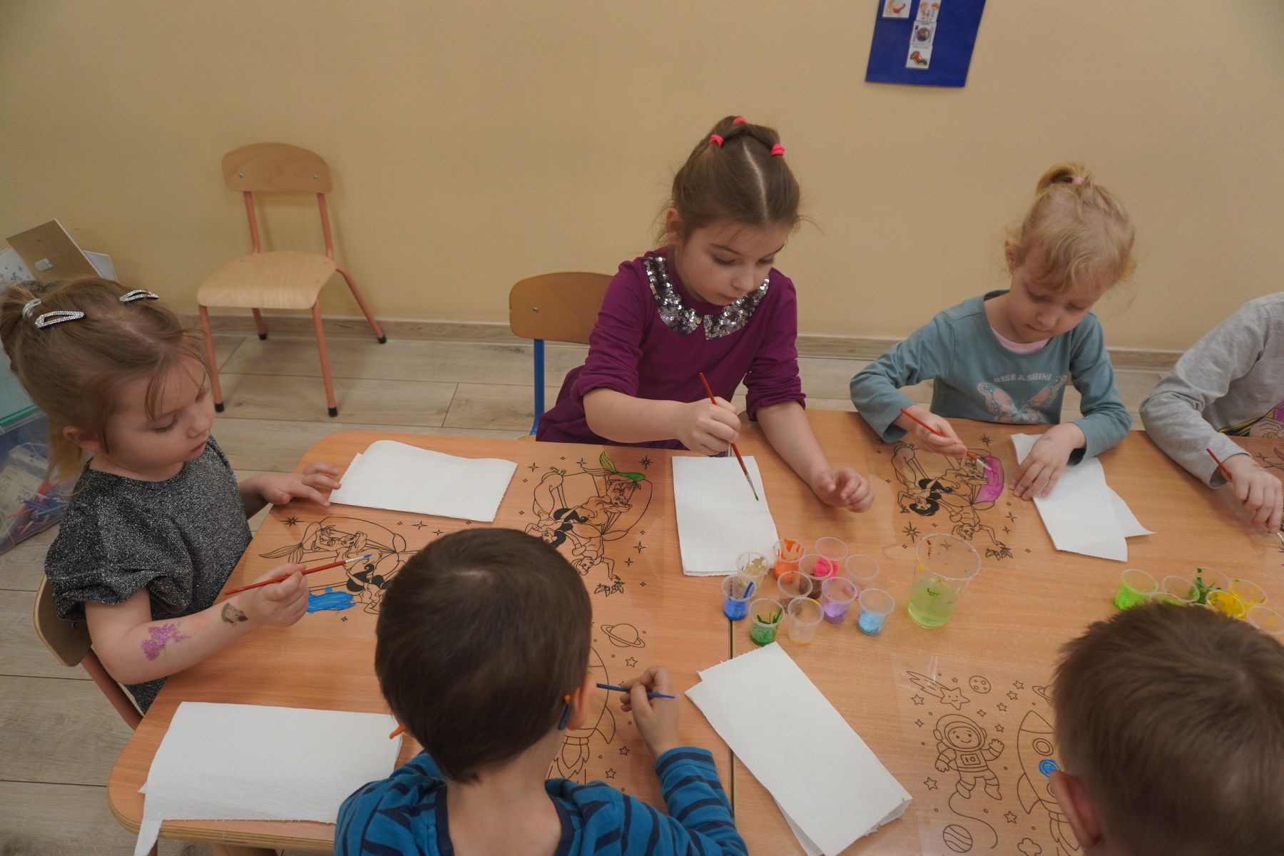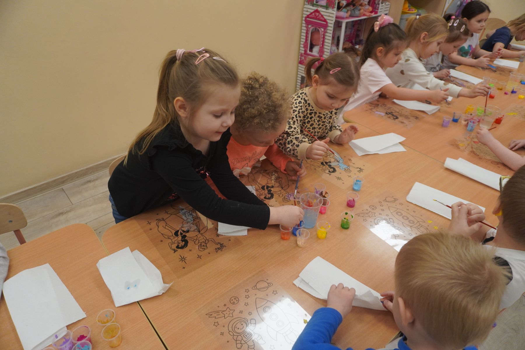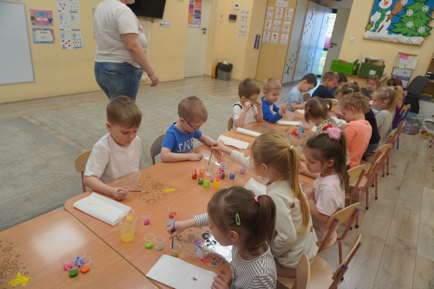 Radość dzieci była ogromna – z entuzjazmem mieszały barwy, eksperymentowały z kształtami i z dumą prezentowały swoje kolorowe obrazki.