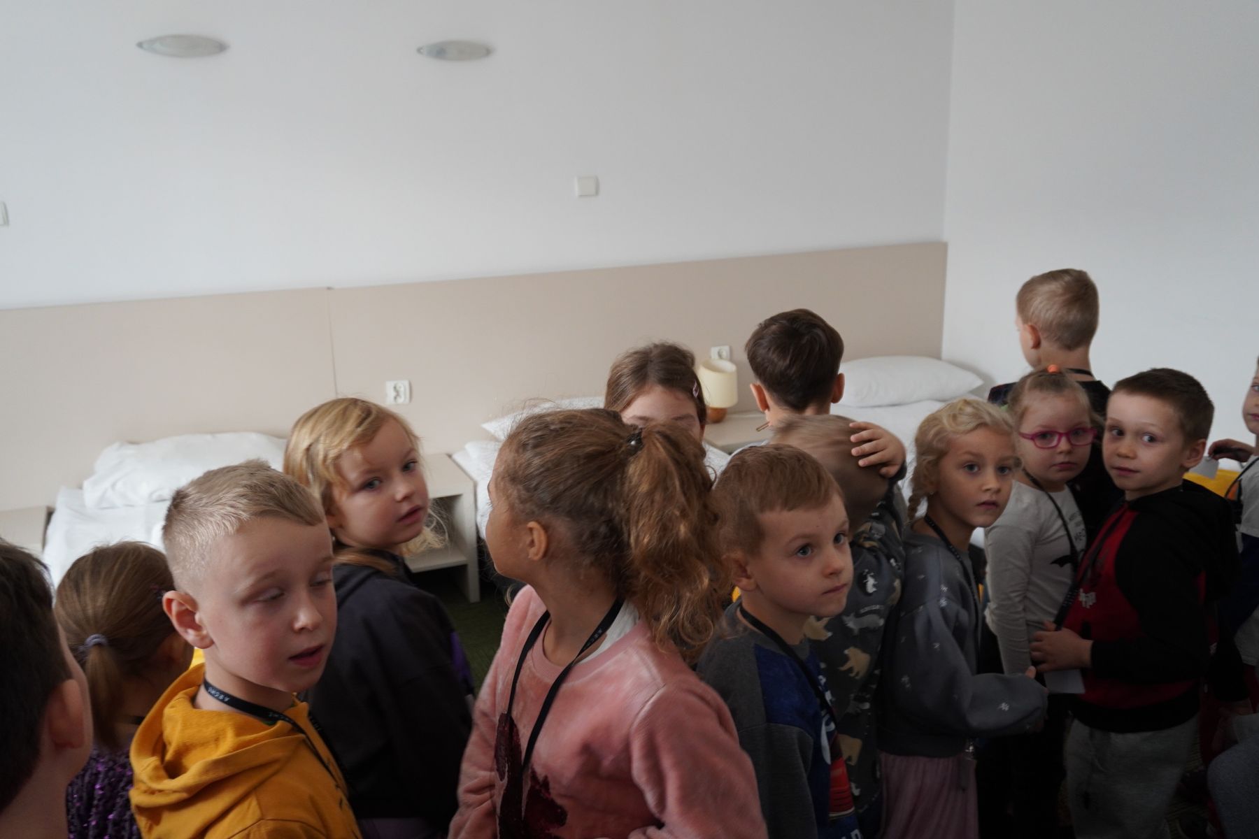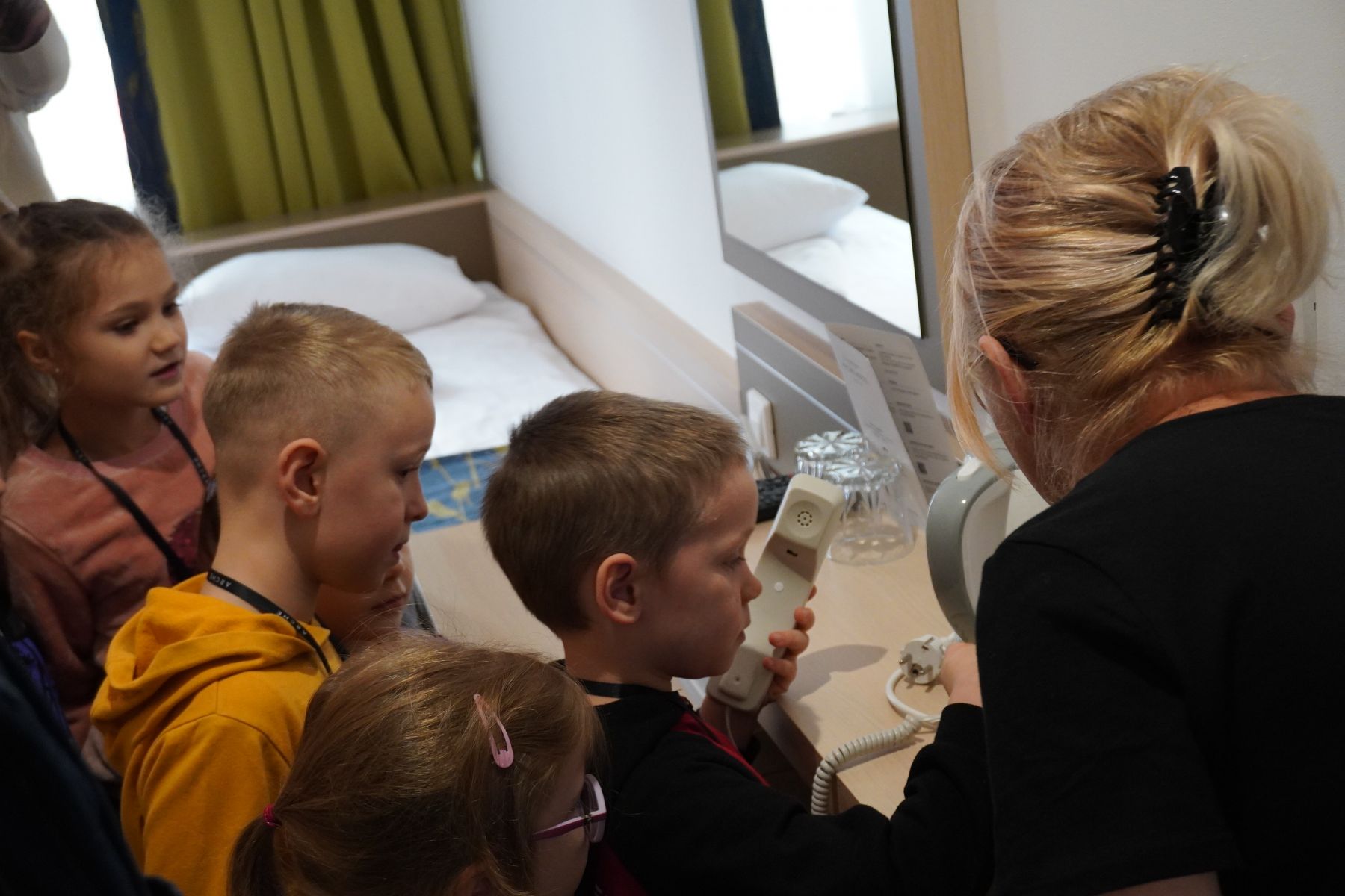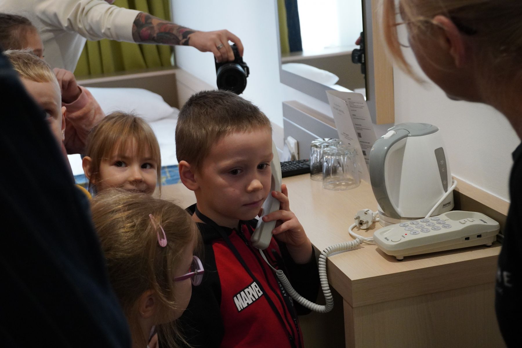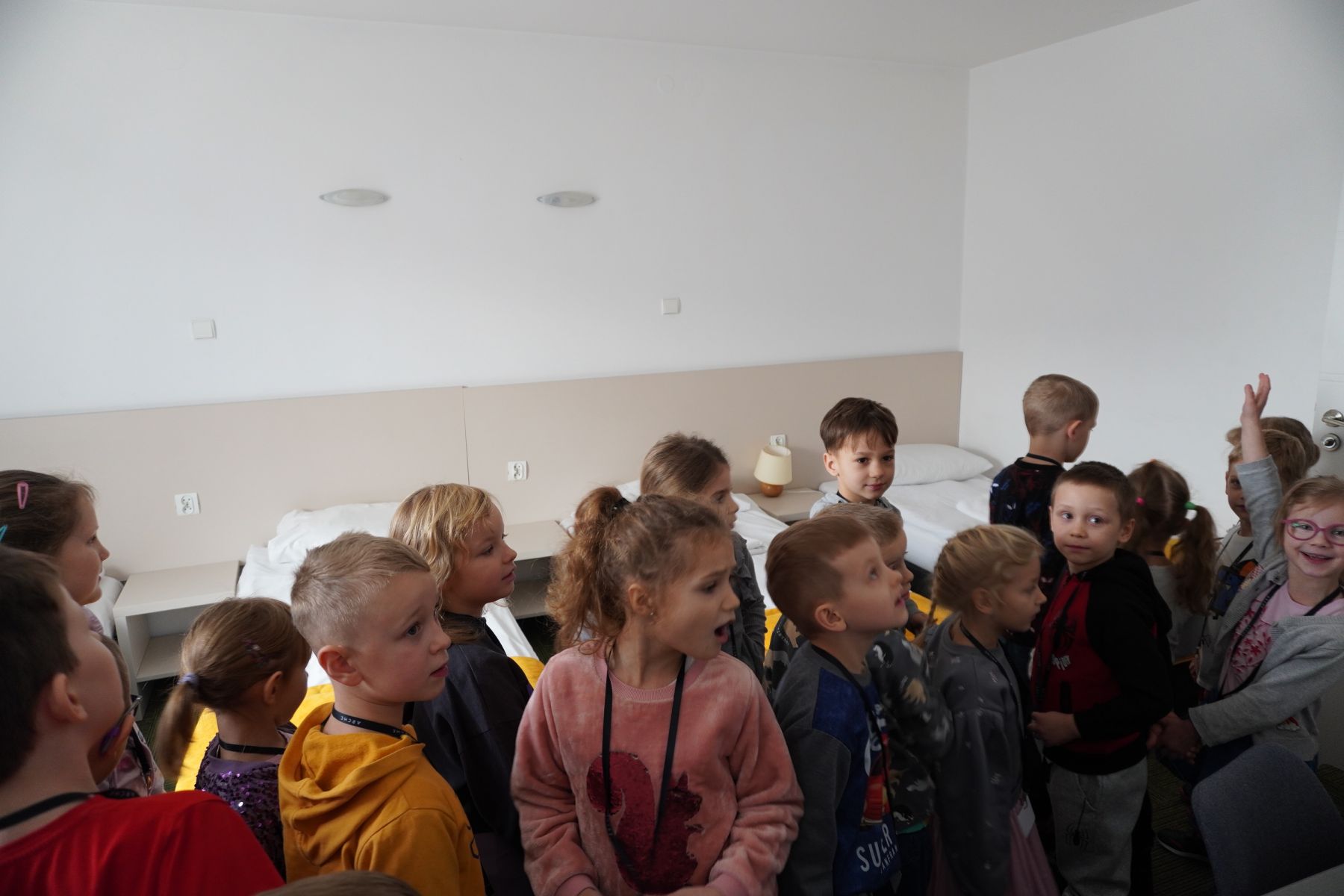 Zwiedzanie rozpoczęło się od recepcji, później dzieci przeszły do pokoi gościnnych – każdy z nich urządzony ze smakiem, nowoczesny, a jednocześnie przytulny. Wygodne łóżka, piękne widoki z okien i dbałość o każdy detal sprawiały, że chciało się tam zostać na dłużej.