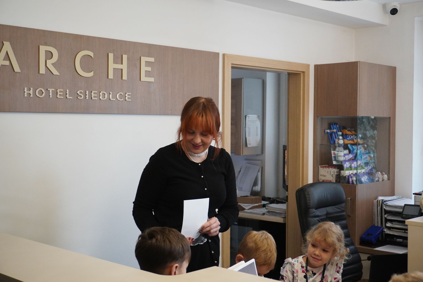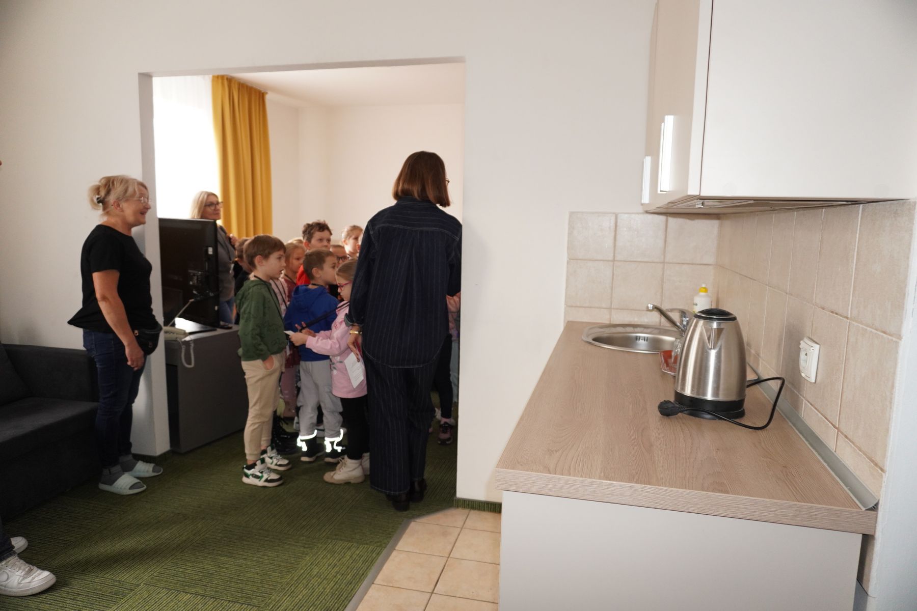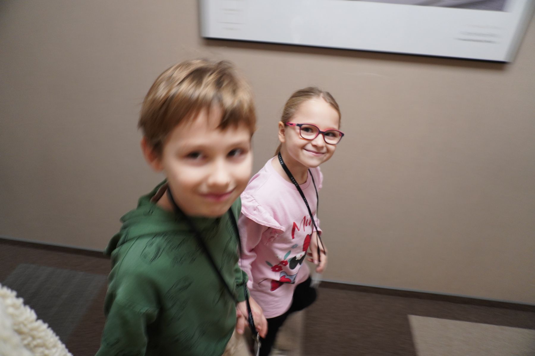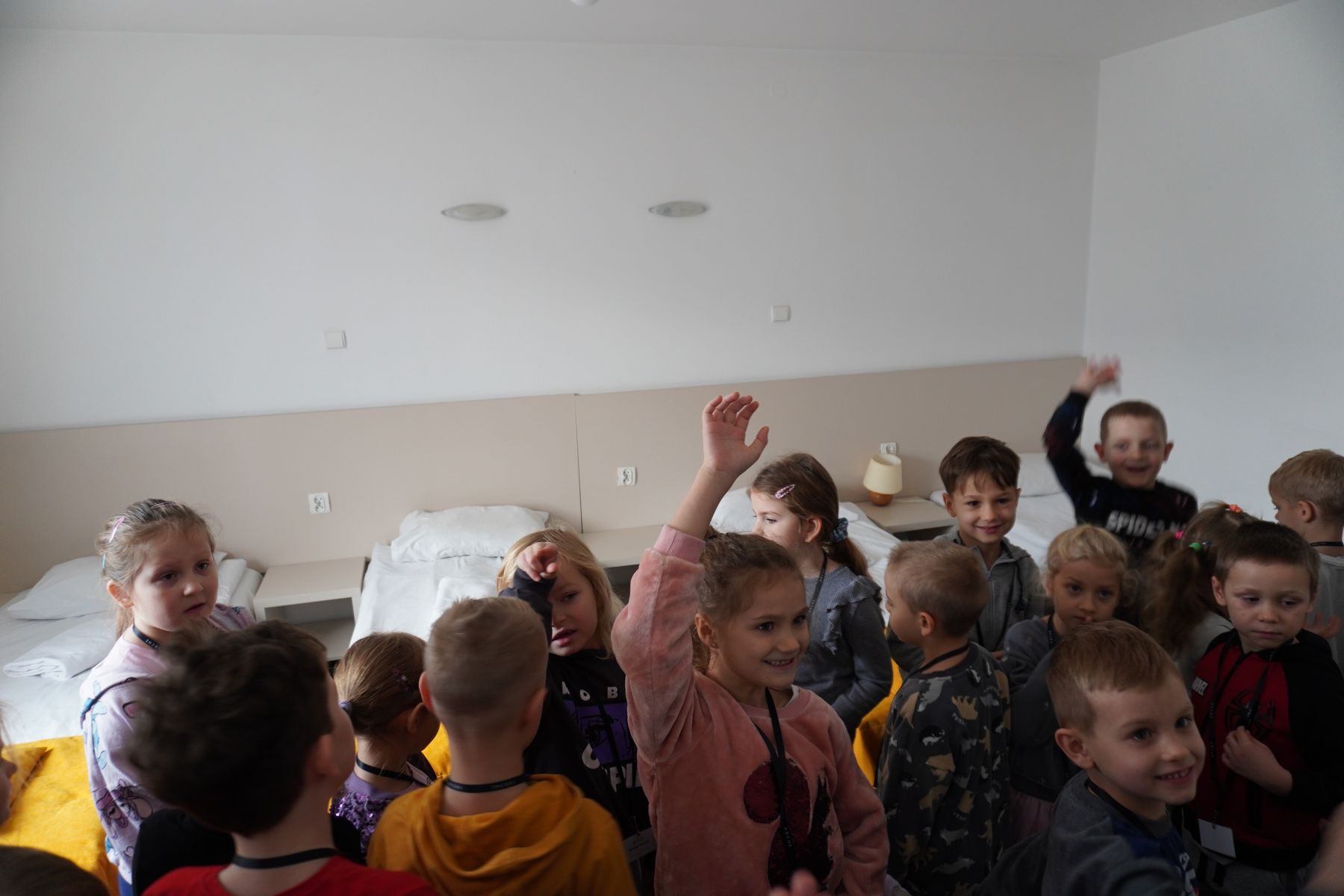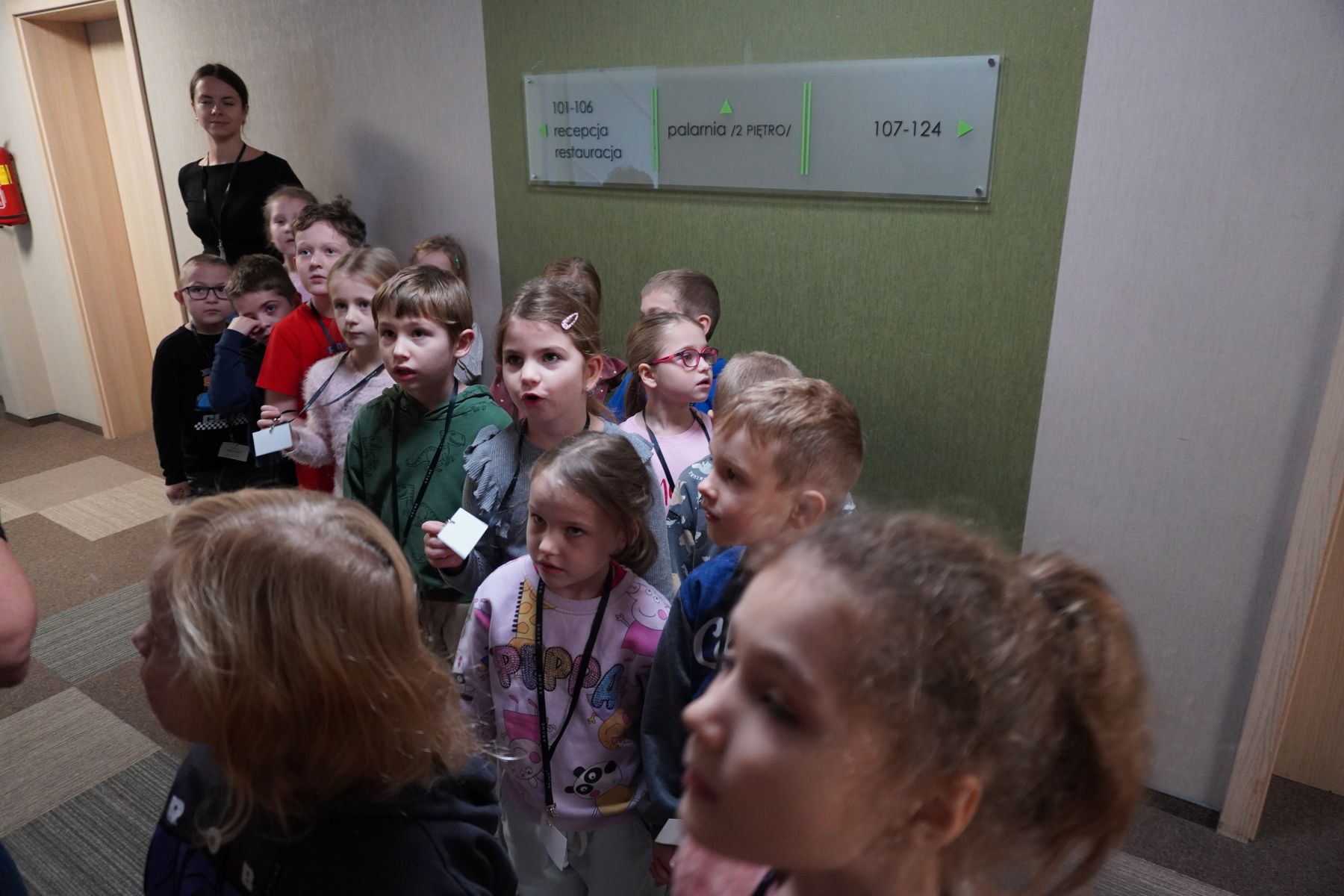 Zwiedzanie rozpoczęło się od recepcji, później dzieci przeszły do pokoi gościnnych – każdy z nich urządzony ze smakiem, nowoczesny, a jednocześnie przytulny. Wygodne łóżka, piękne widoki z okien i dbałość o każdy detal sprawiały, że chciało się tam zostać na dłużej.