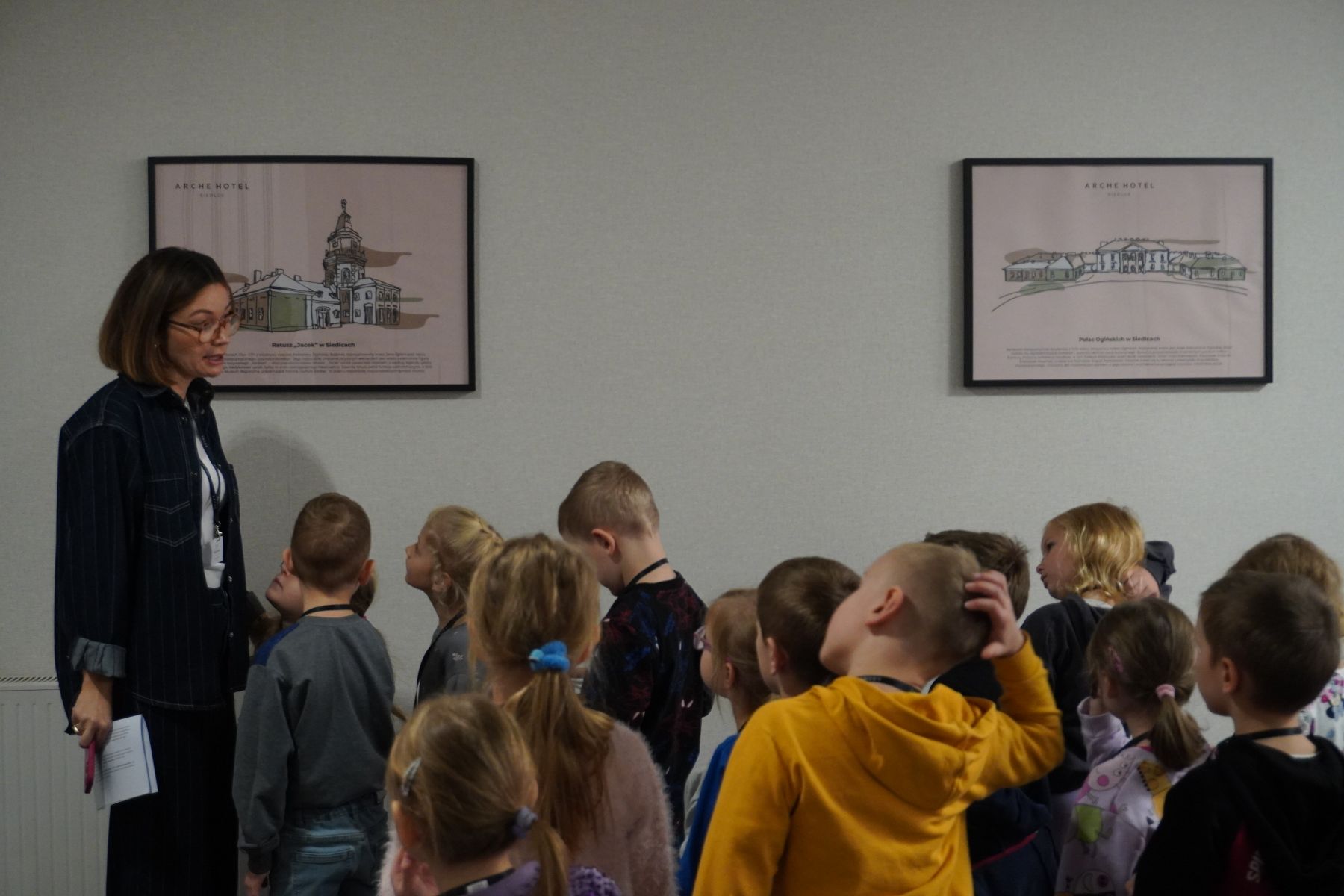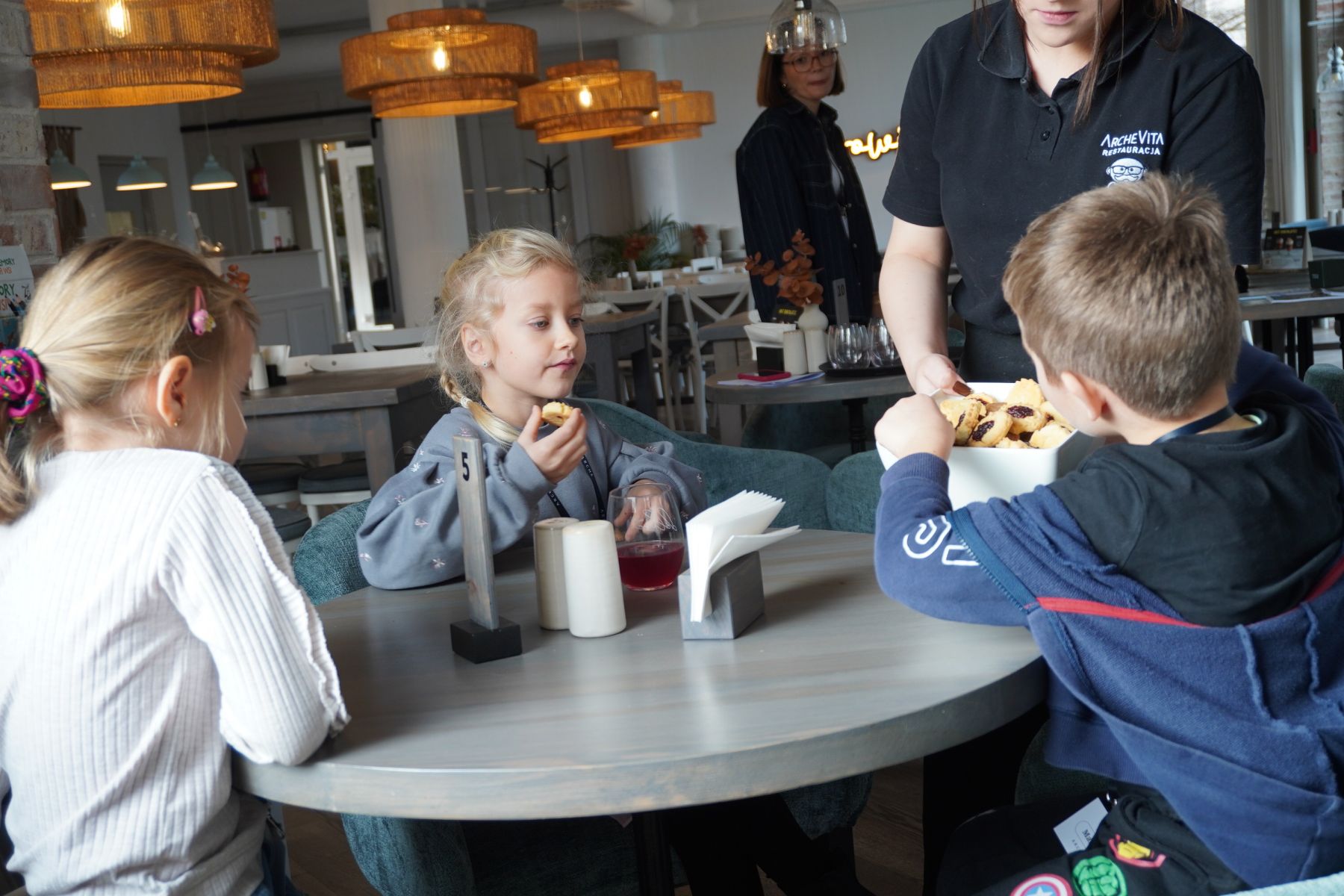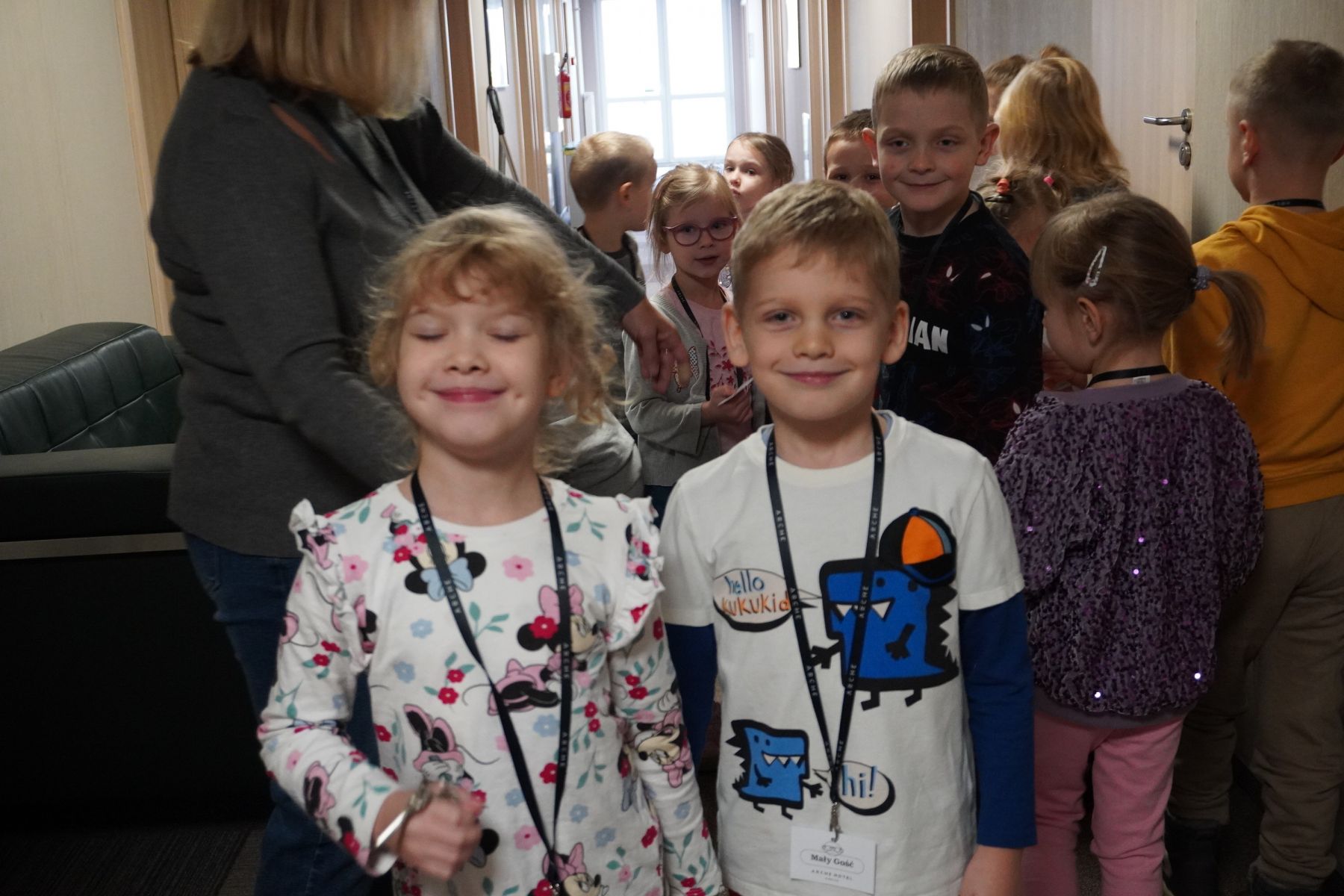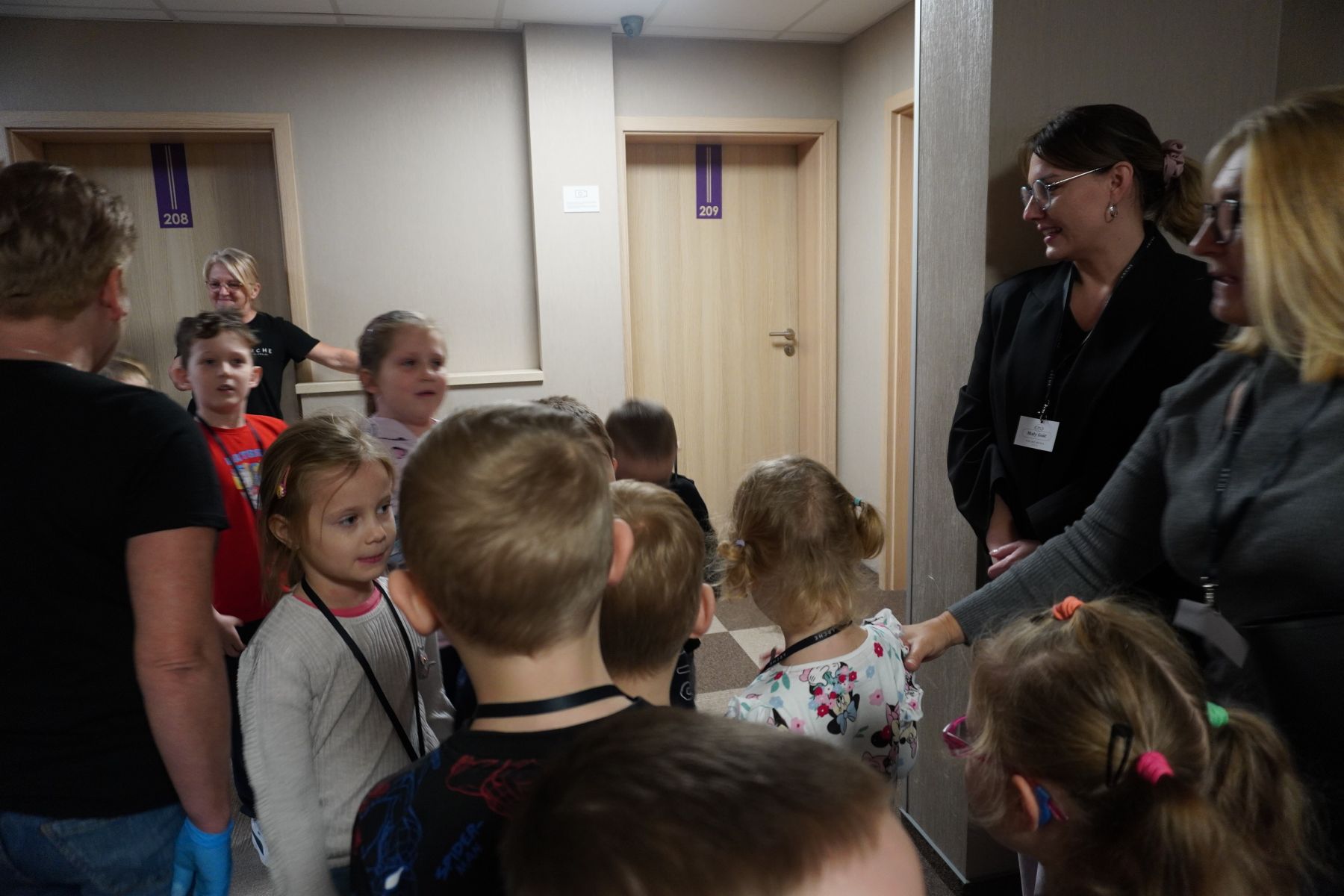 Zwiedzanie rozpoczęło się od recepcji, później dzieci przeszły do pokoi gościnnych – każdy z nich urządzony ze smakiem, nowoczesny, a jednocześnie przytulny. Wygodne łóżka, piękne widoki z okien i dbałość o każdy detal sprawiały, że chciało się tam zostać na dłużej.