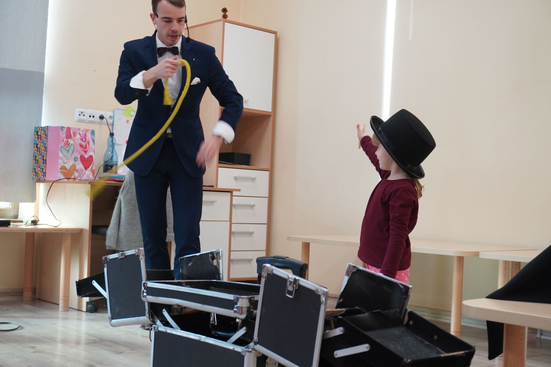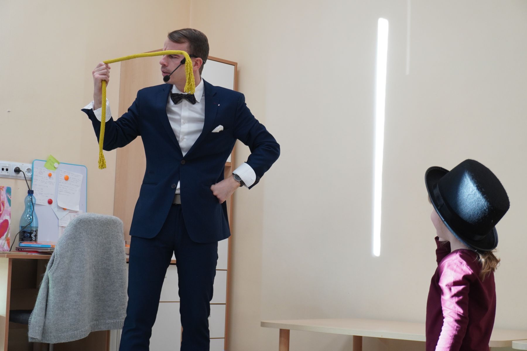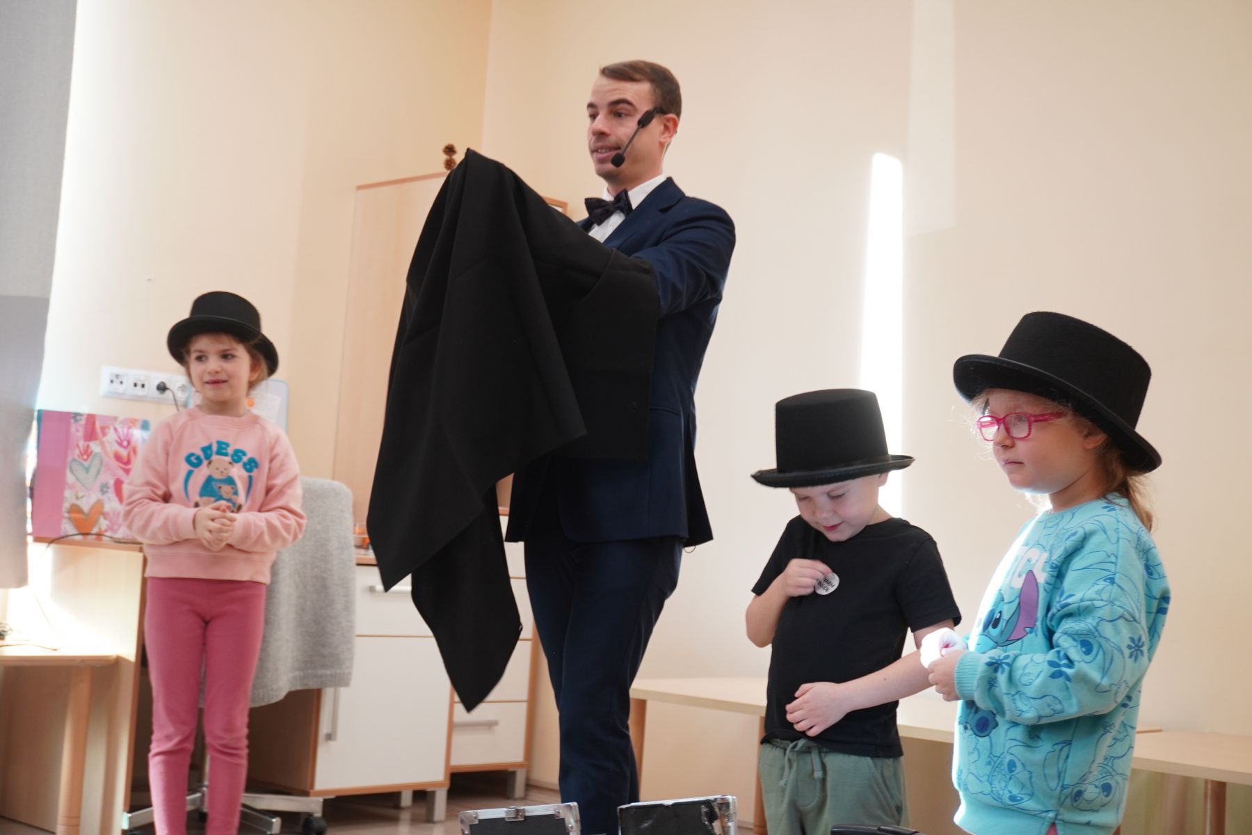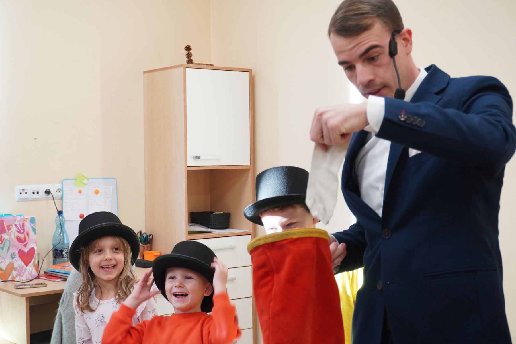 Iluzjonista wciągnął dzieci do wspólnej zabawy, pozwalając im stać się małymi asystentami w swoich pokazach. Każdy występ wywoływał salwy śmiechu i zachwytu, a atmosfera w sali była pełna pozytywnej energii. Dzieci z zapartym tchem obserwowały każdy ruch magika, próbując odkryć tajemnice jego sztuczek.