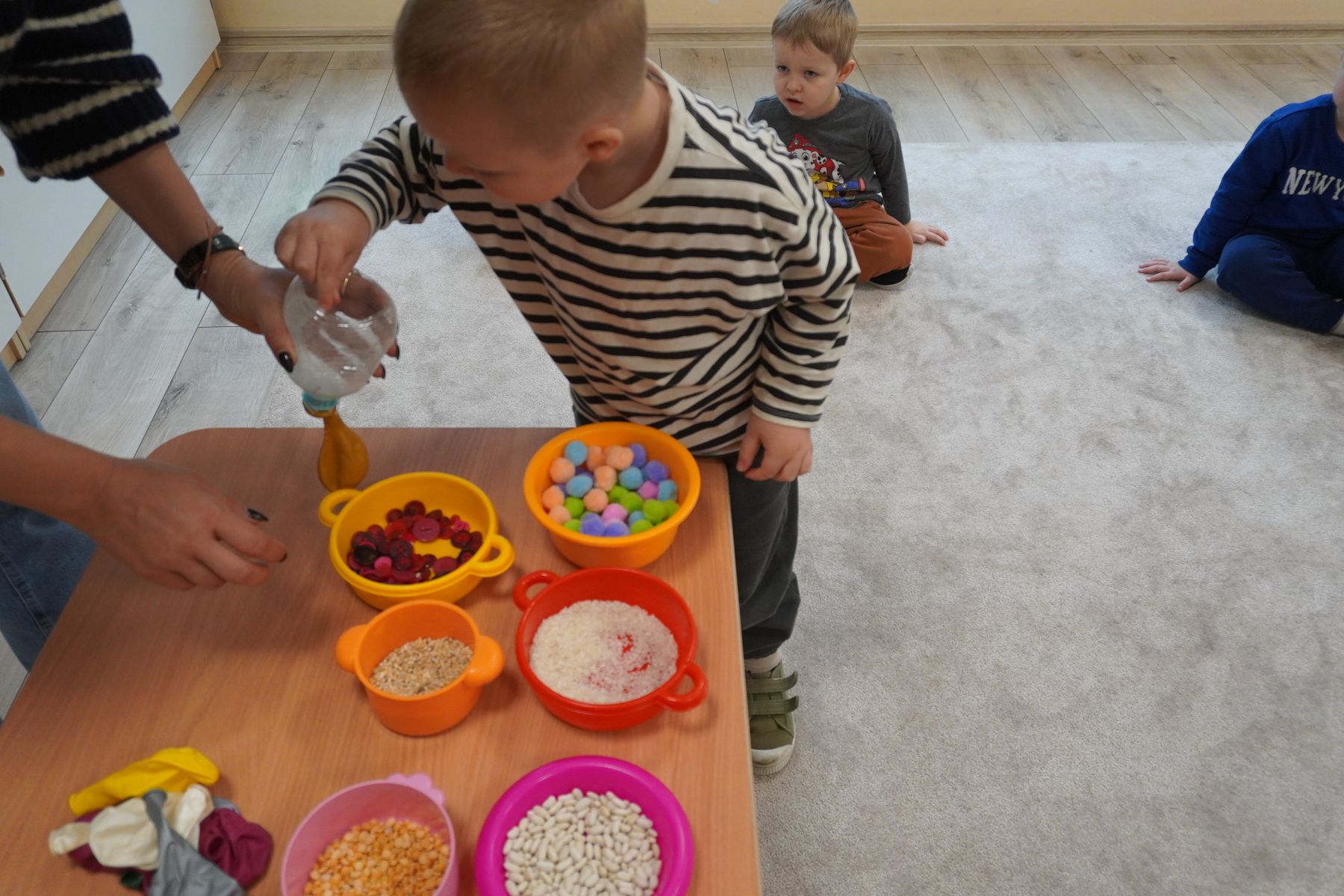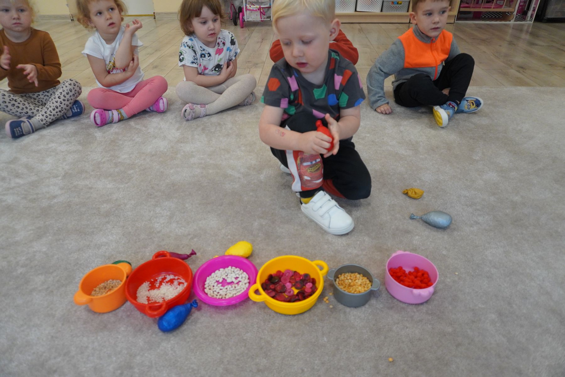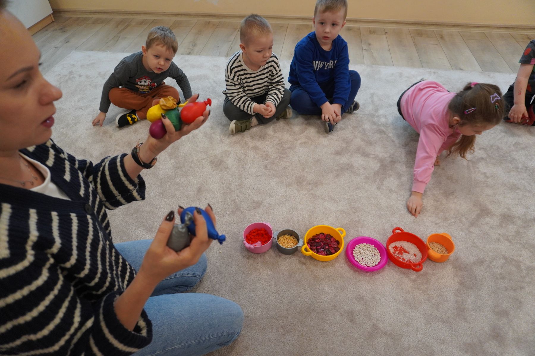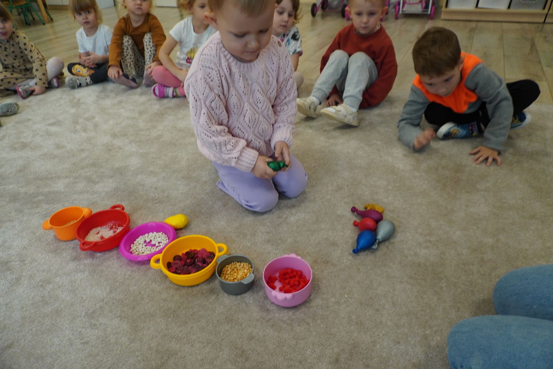 Zadaniem dzieci było za pomocą dotyku odgadnięcie, który produkt z przedstawionych na kartoniku ukrył się w balonie.
