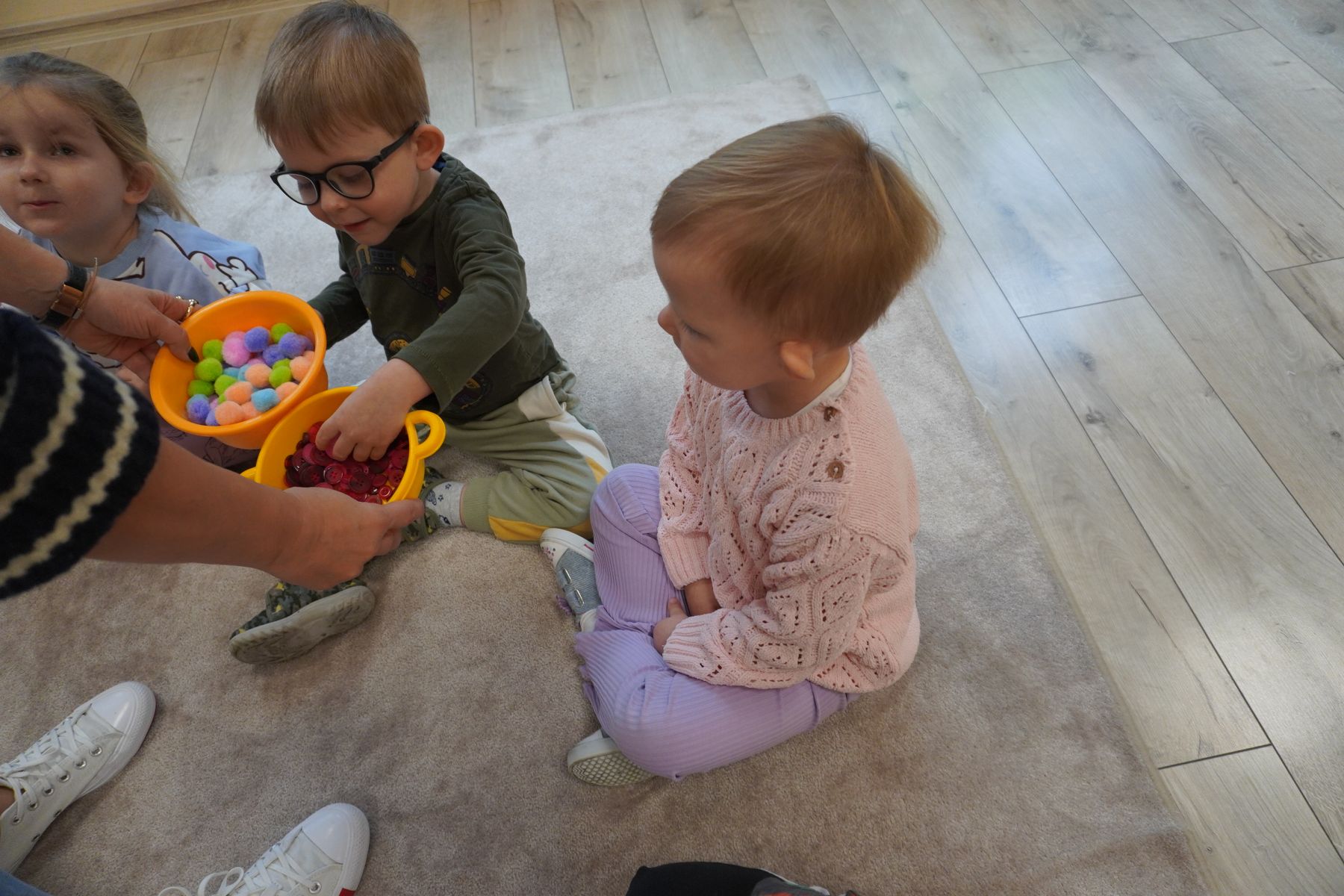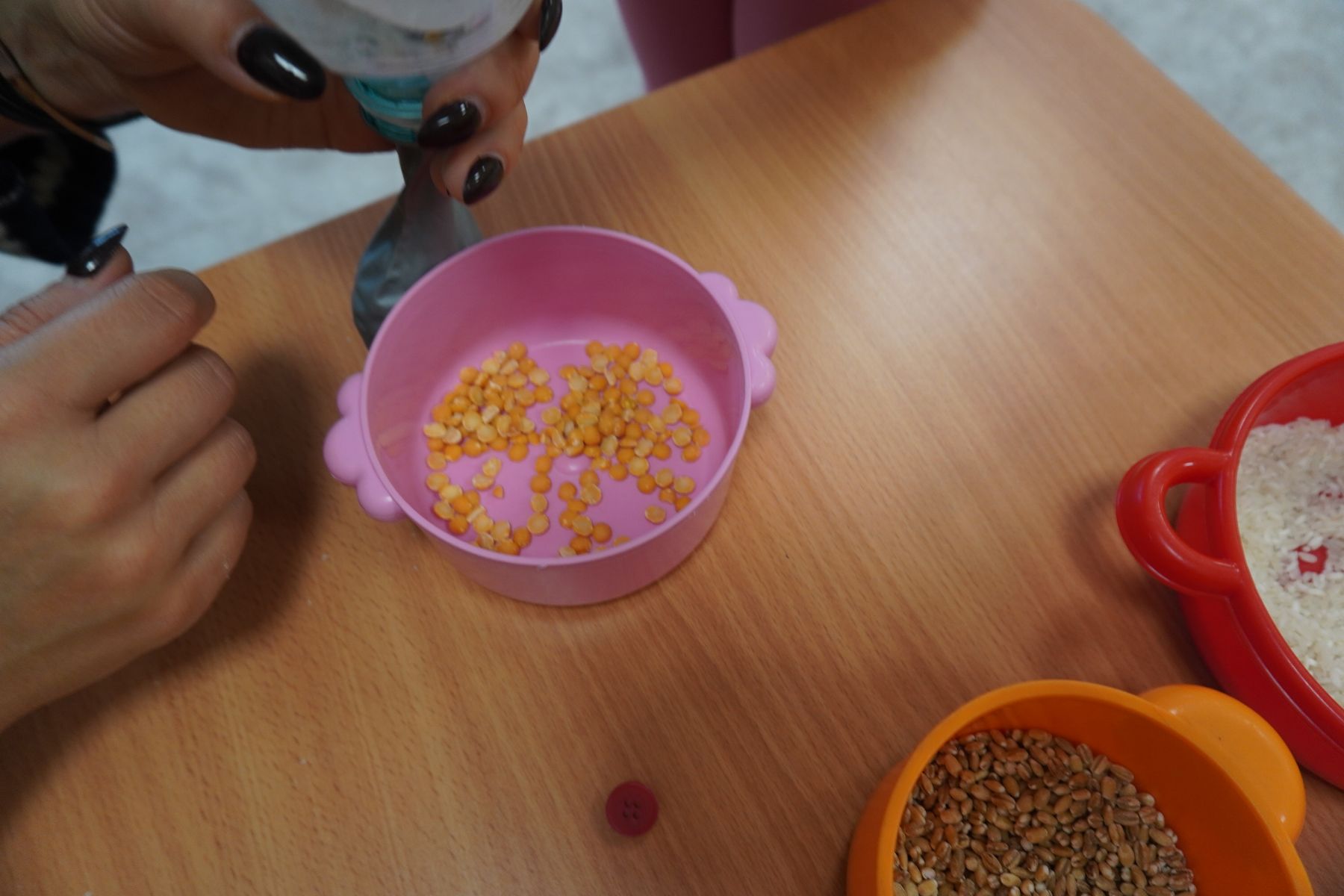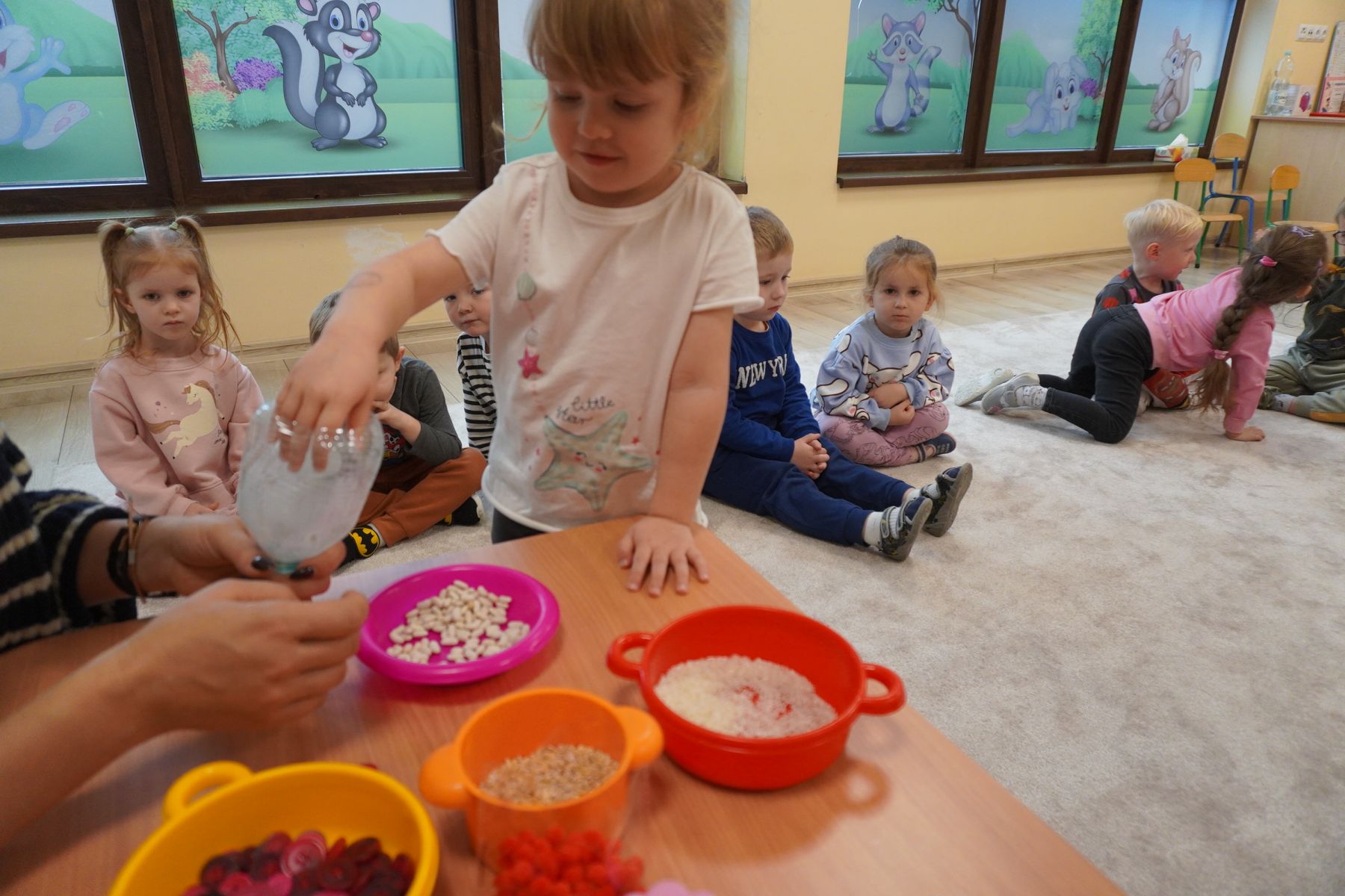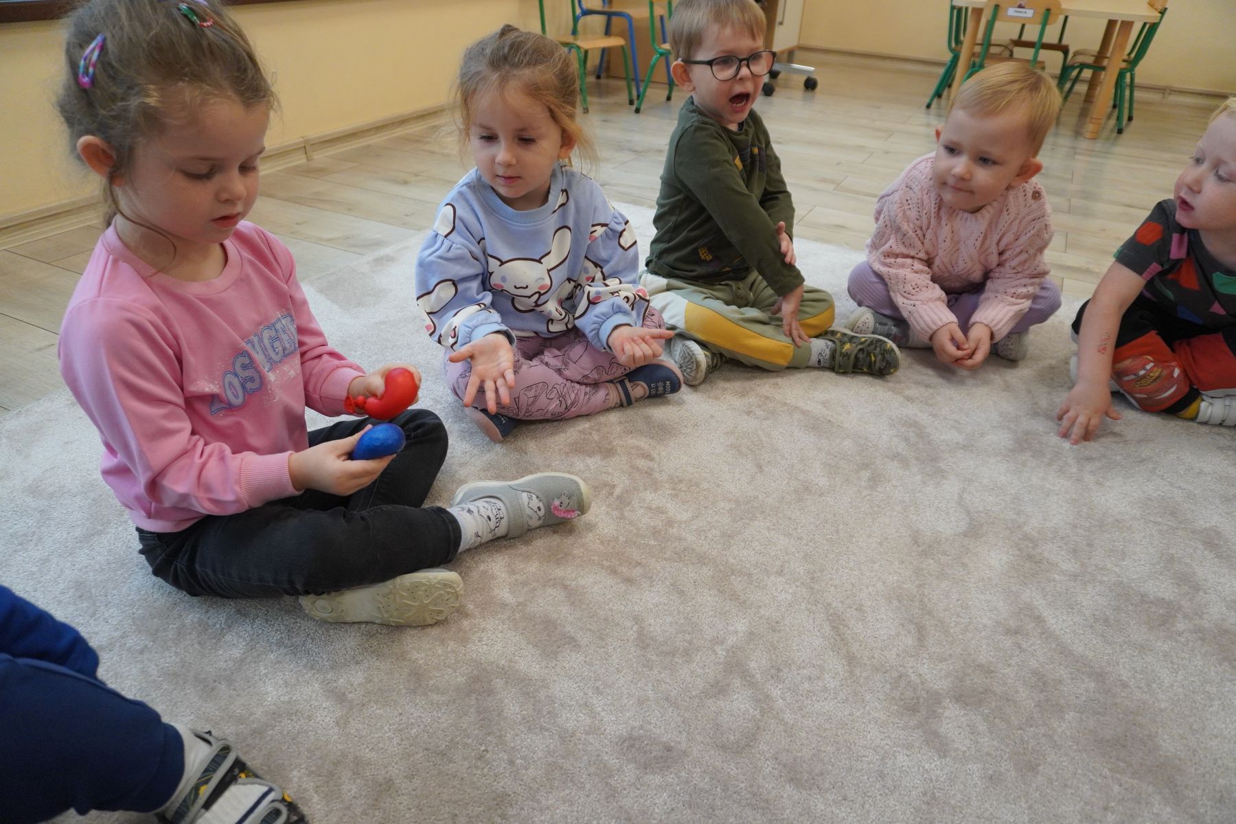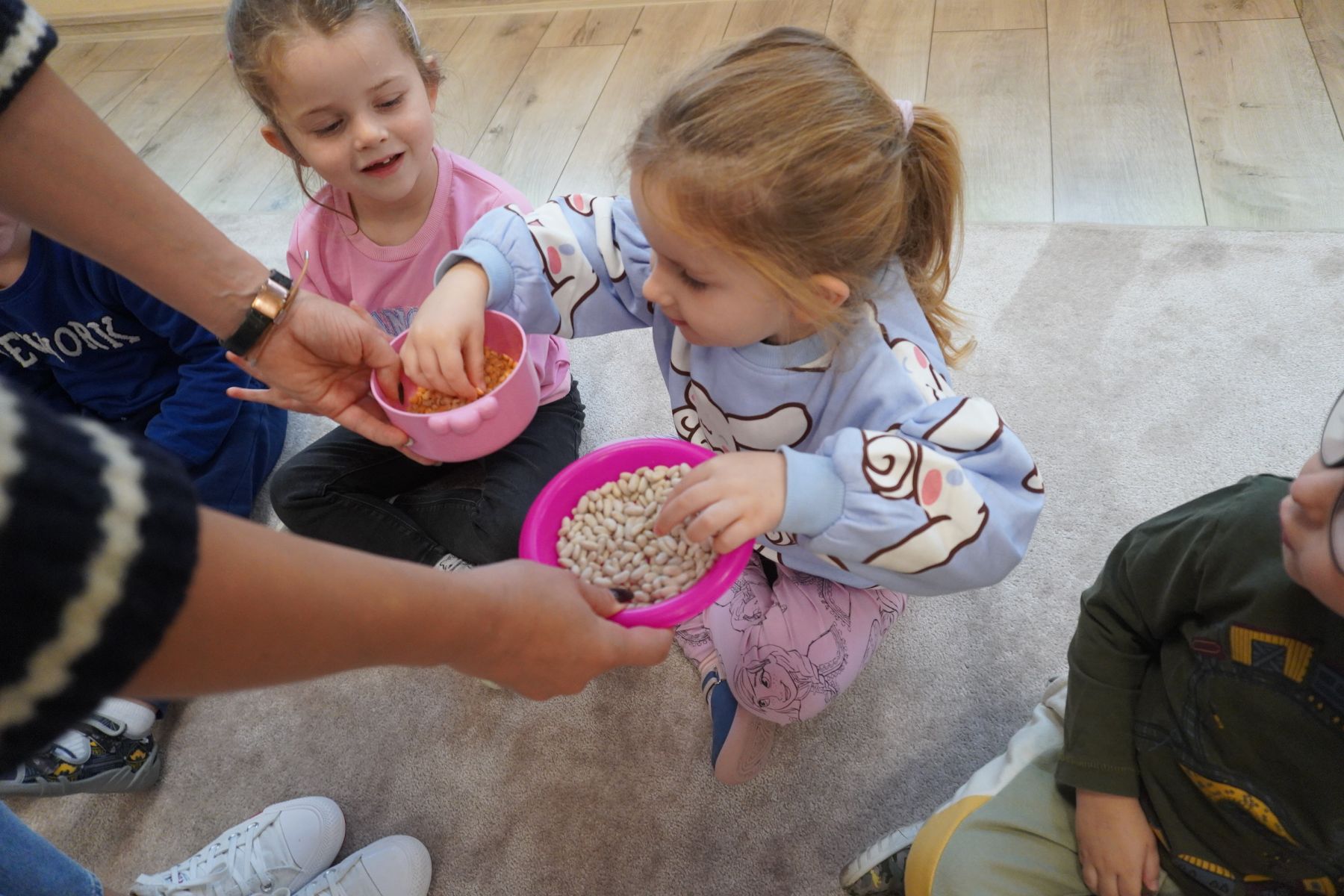 Zadaniem dzieci było za pomocą dotyku odgadnięcie, który produkt z przedstawionych na kartoniku ukrył się w balonie.