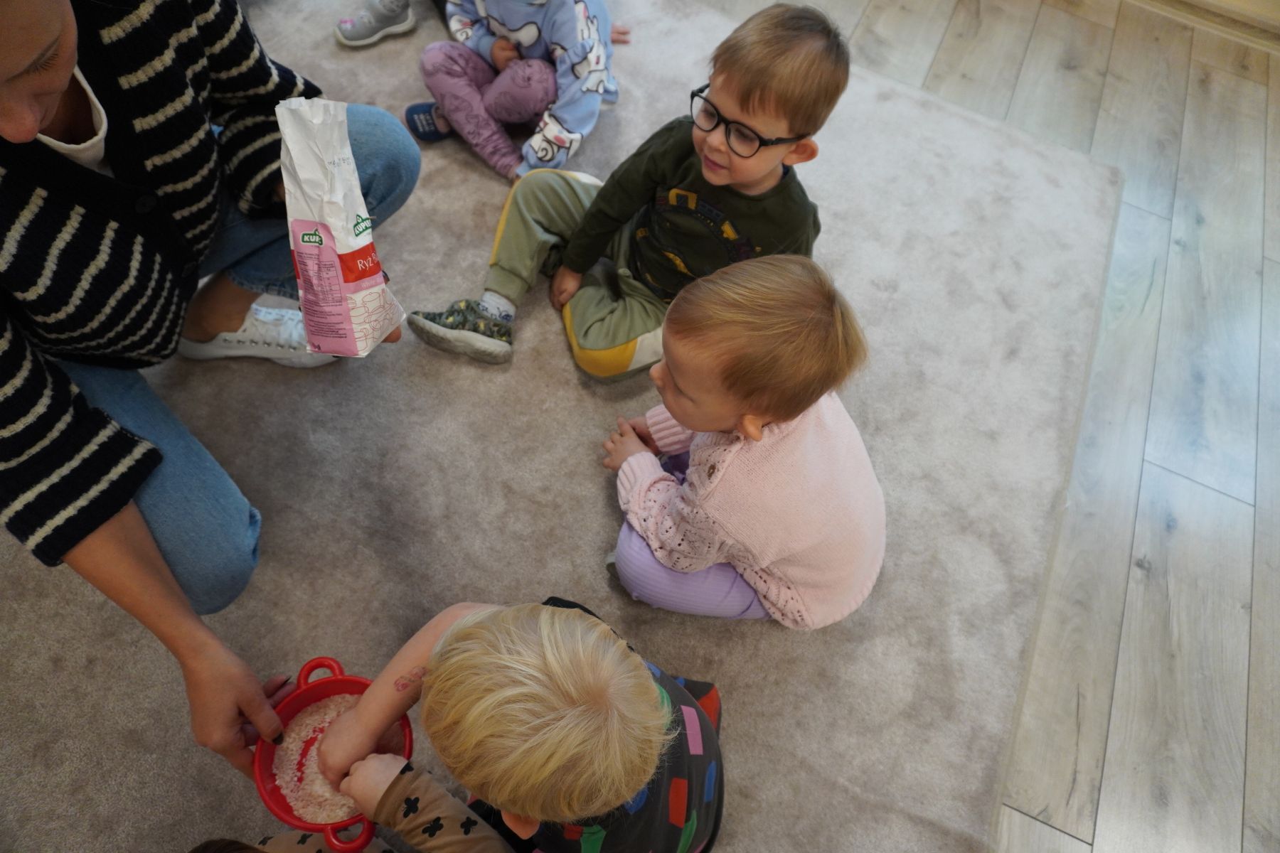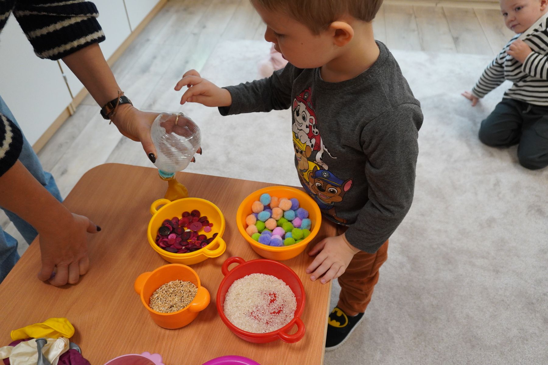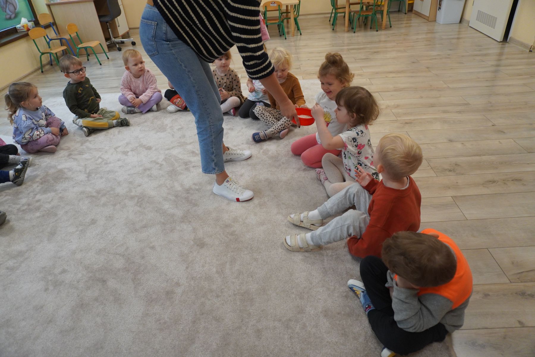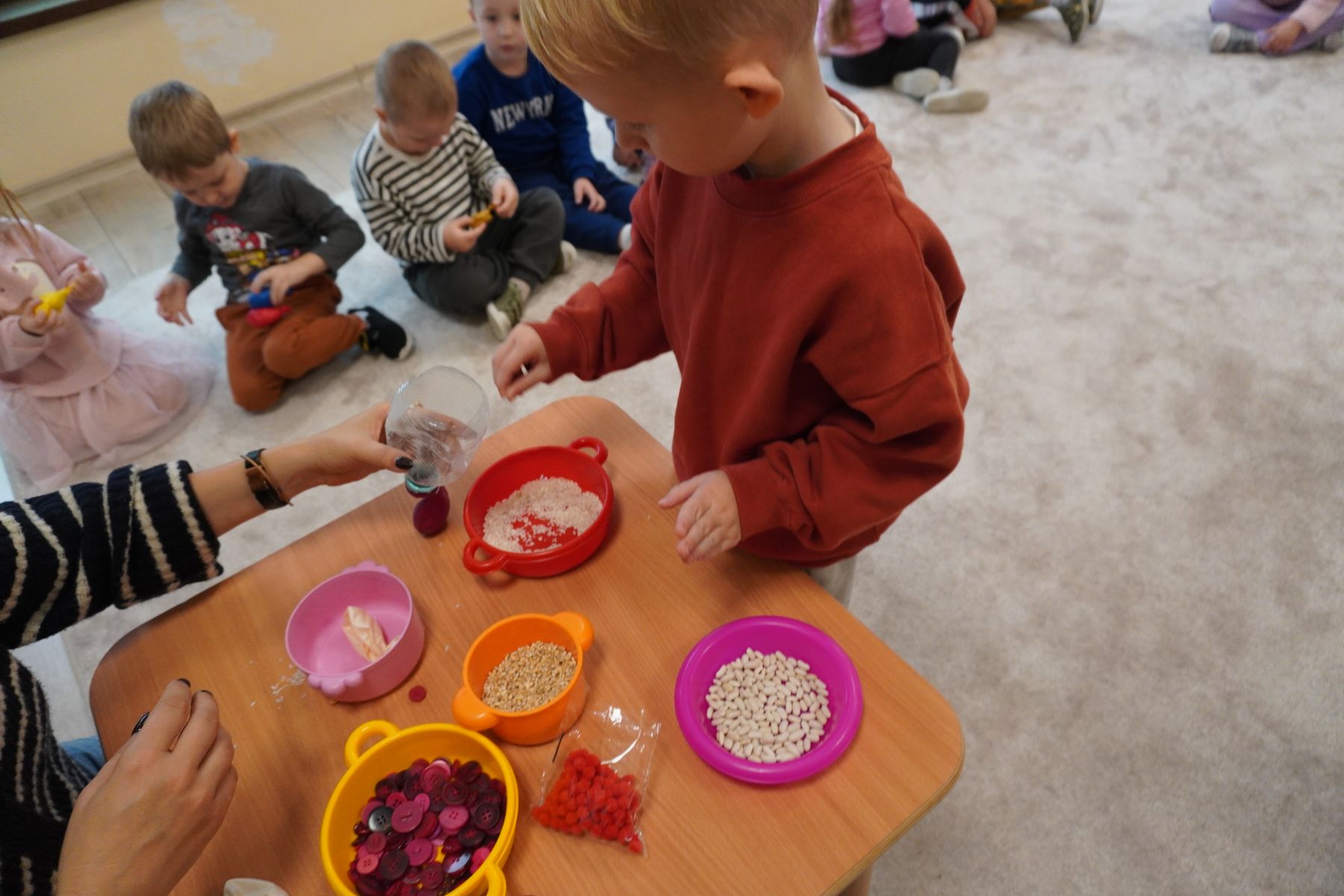 Zadaniem dzieci było za pomocą dotyku odgadnięcie, który produkt z przedstawionych na kartoniku ukrył się w balonie.