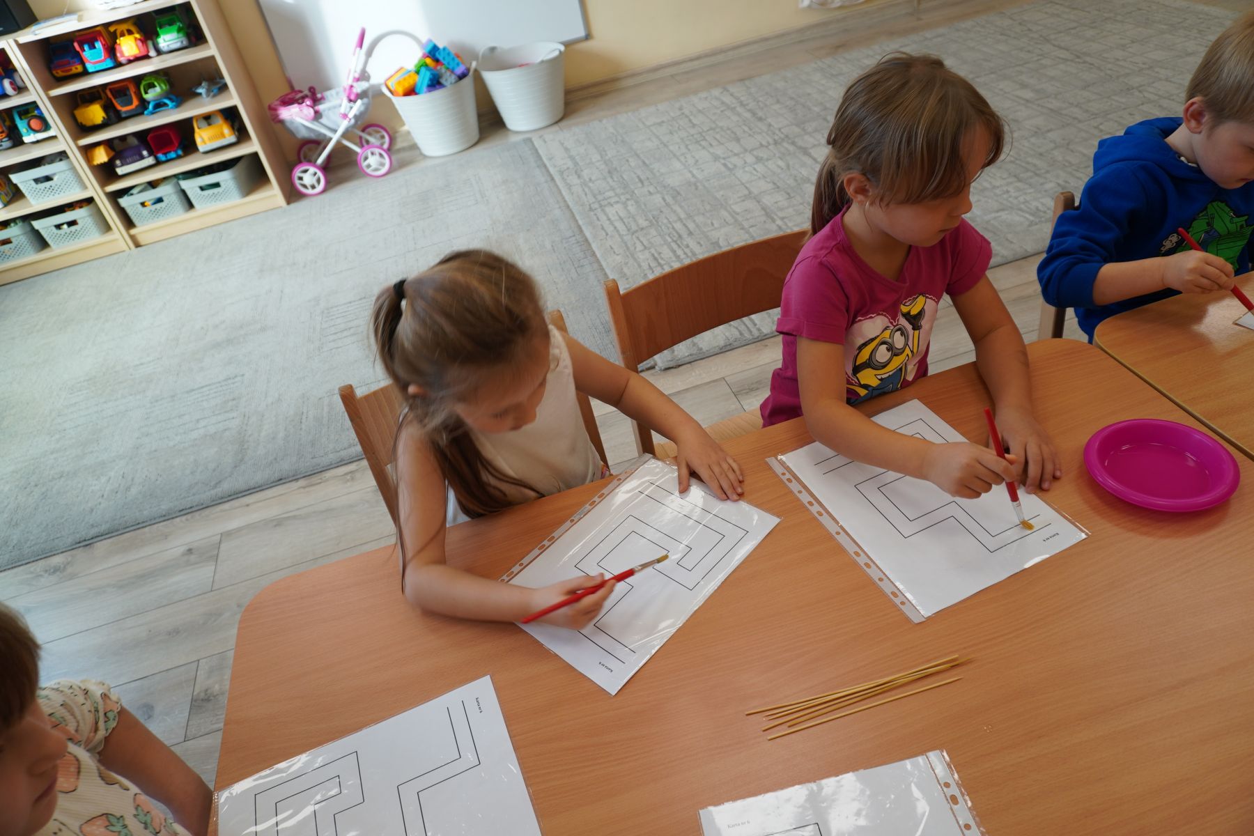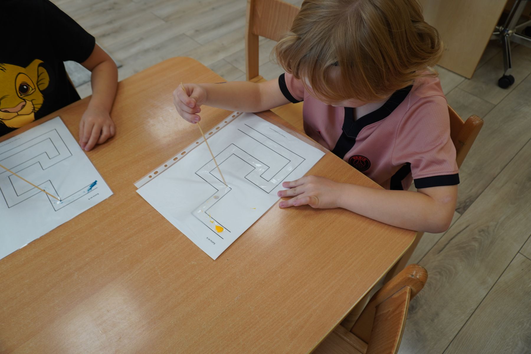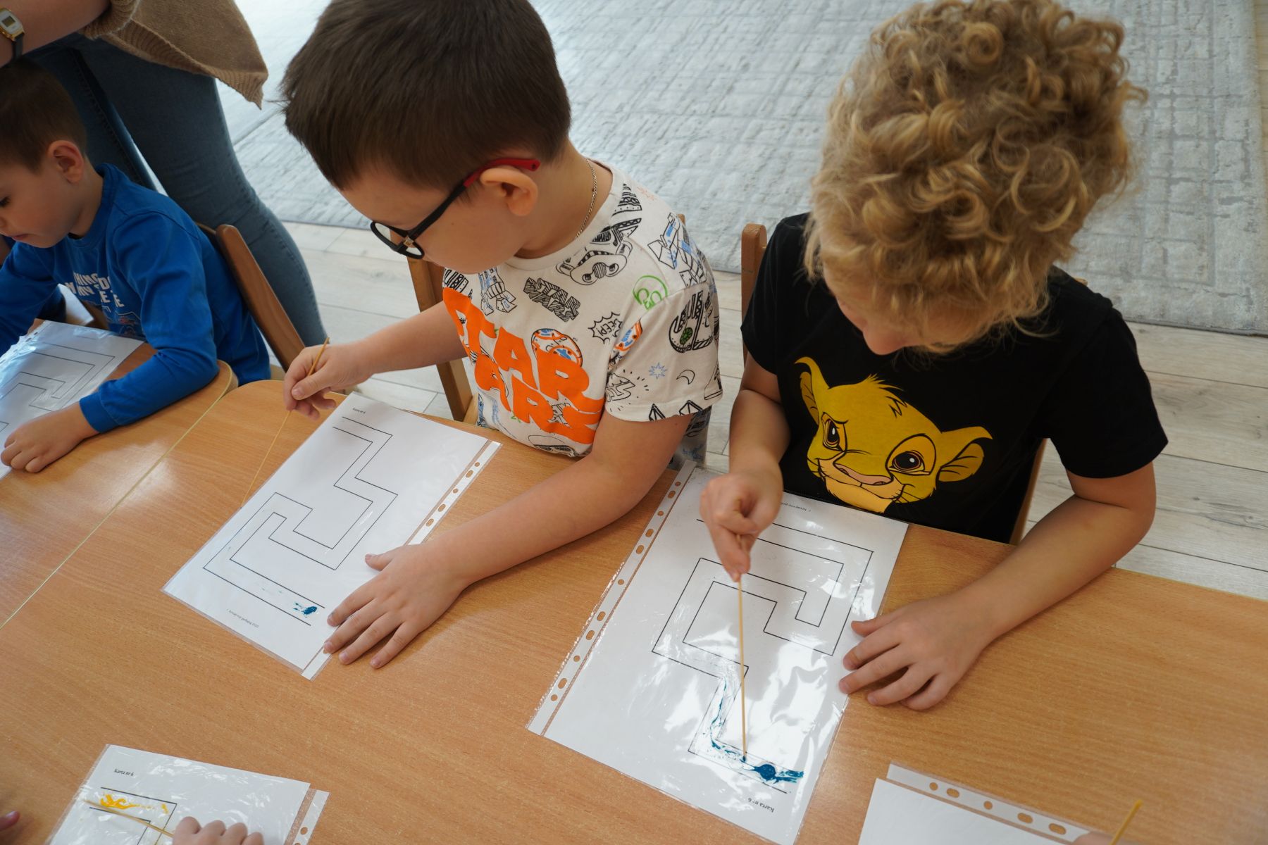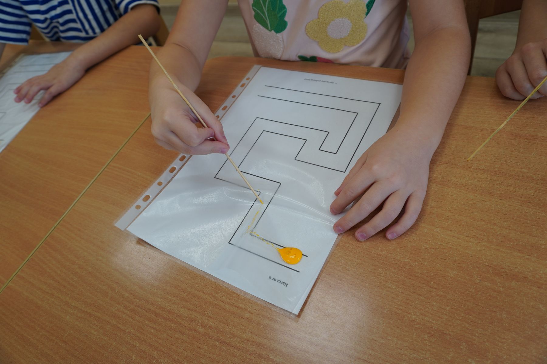 Zadaniem dzieci było przeprowadzenie kropli wody przez tunel za pomocą wykałaczki.