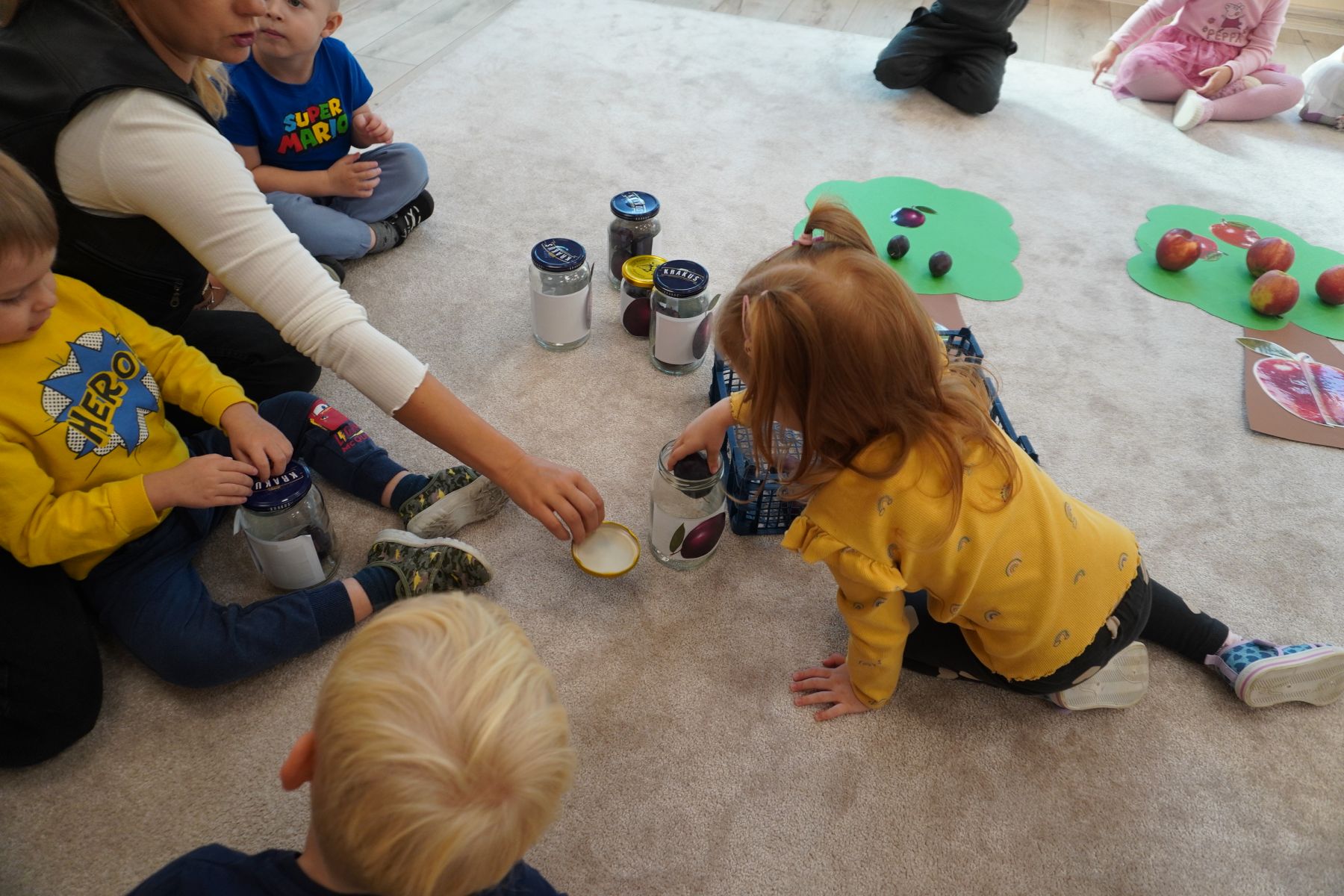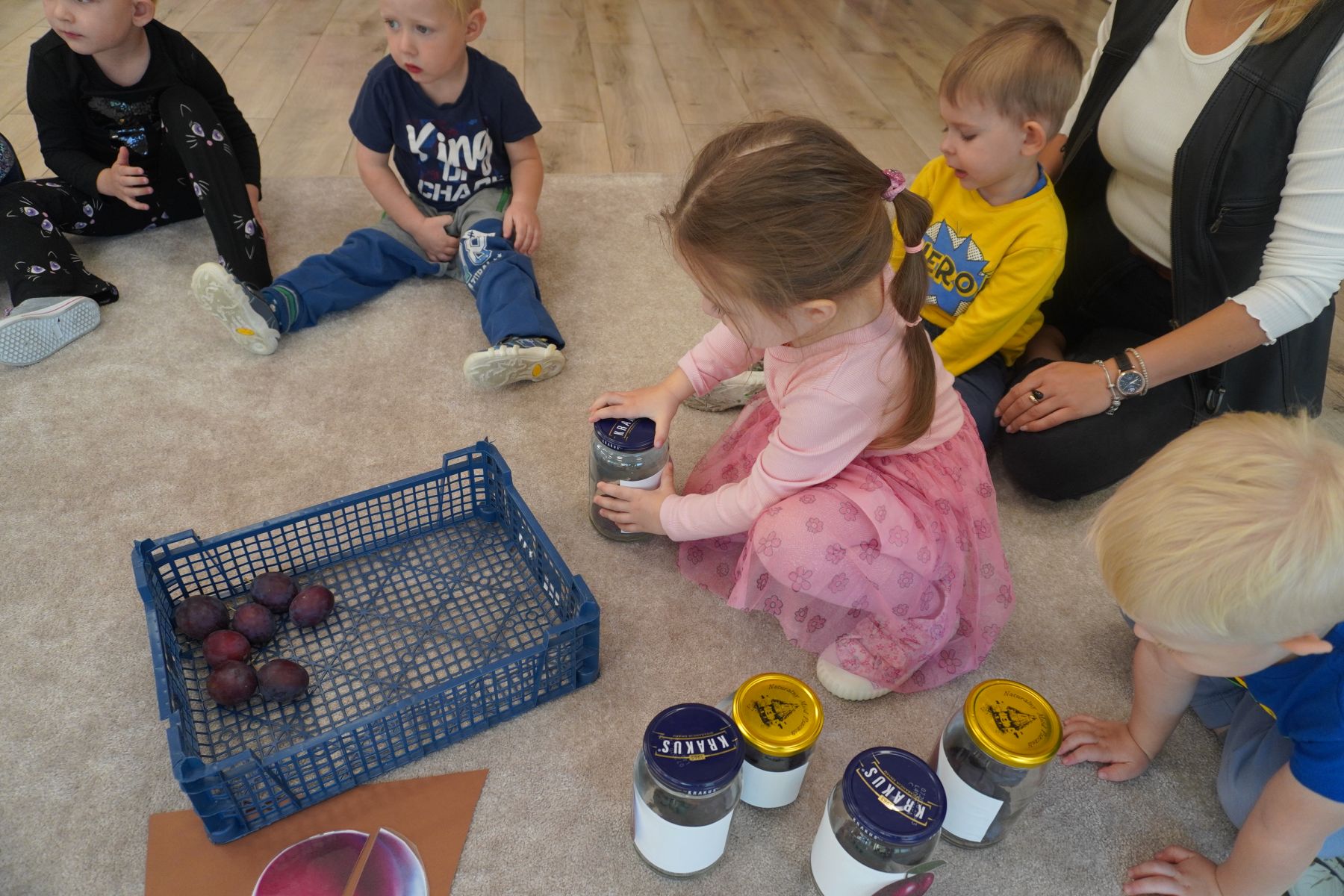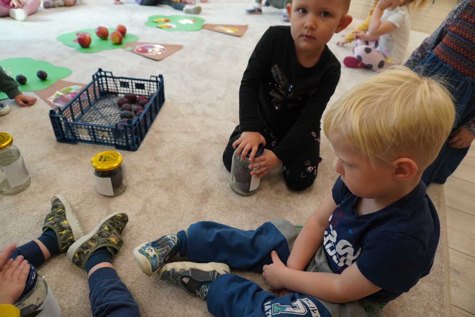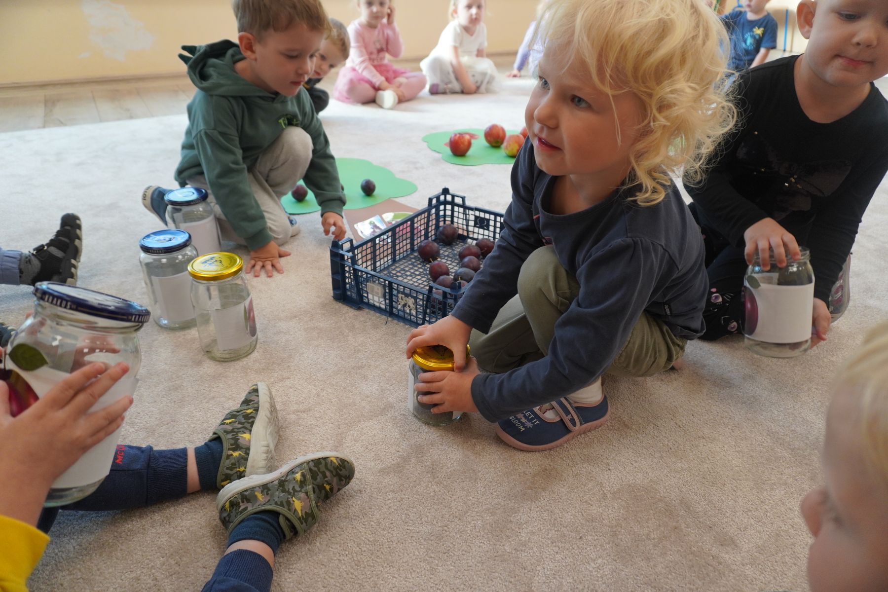Zadaniem dzieci było dopasowanie zakrętek dopojemników i ich zakręcenie. Druga opcja tej zabawyto przygotowanie zakręconych pojemników, azadaniem dzieci jest ich odkręcenie.